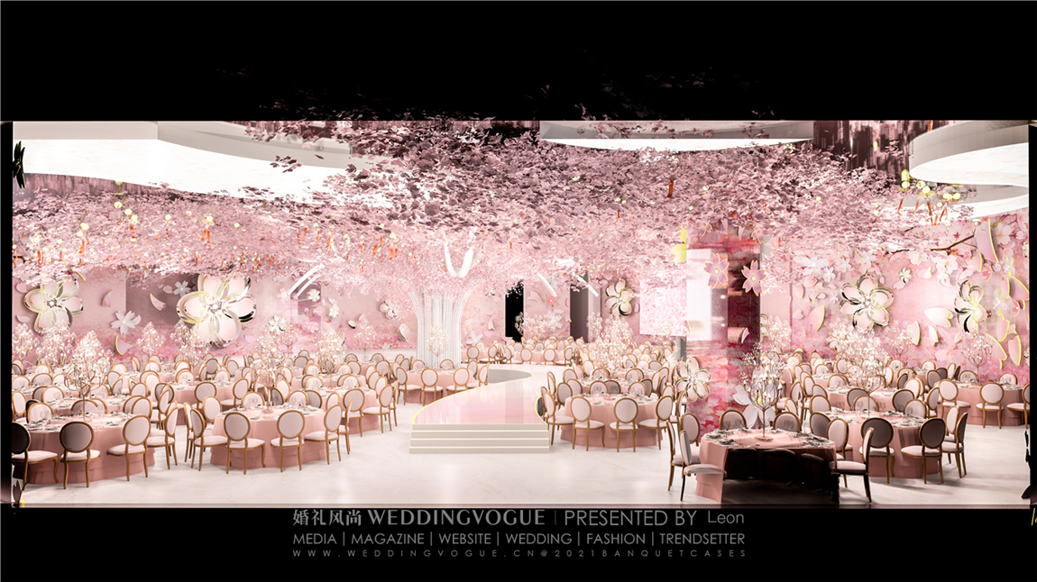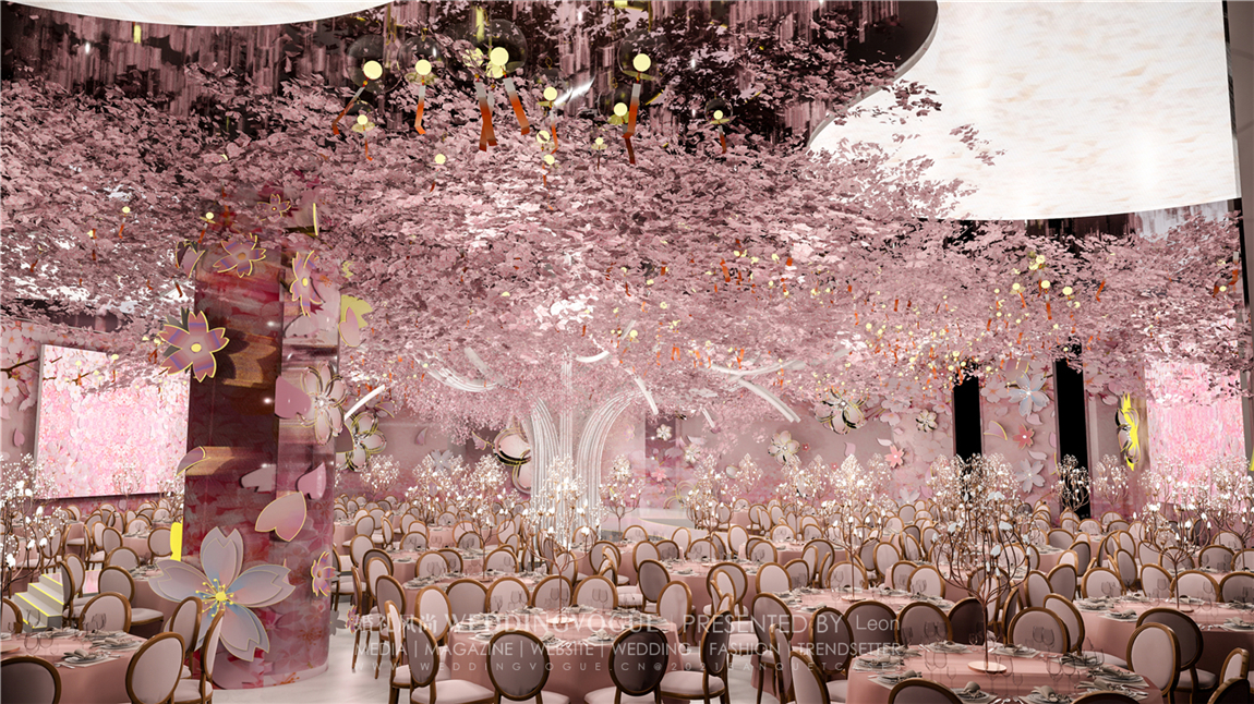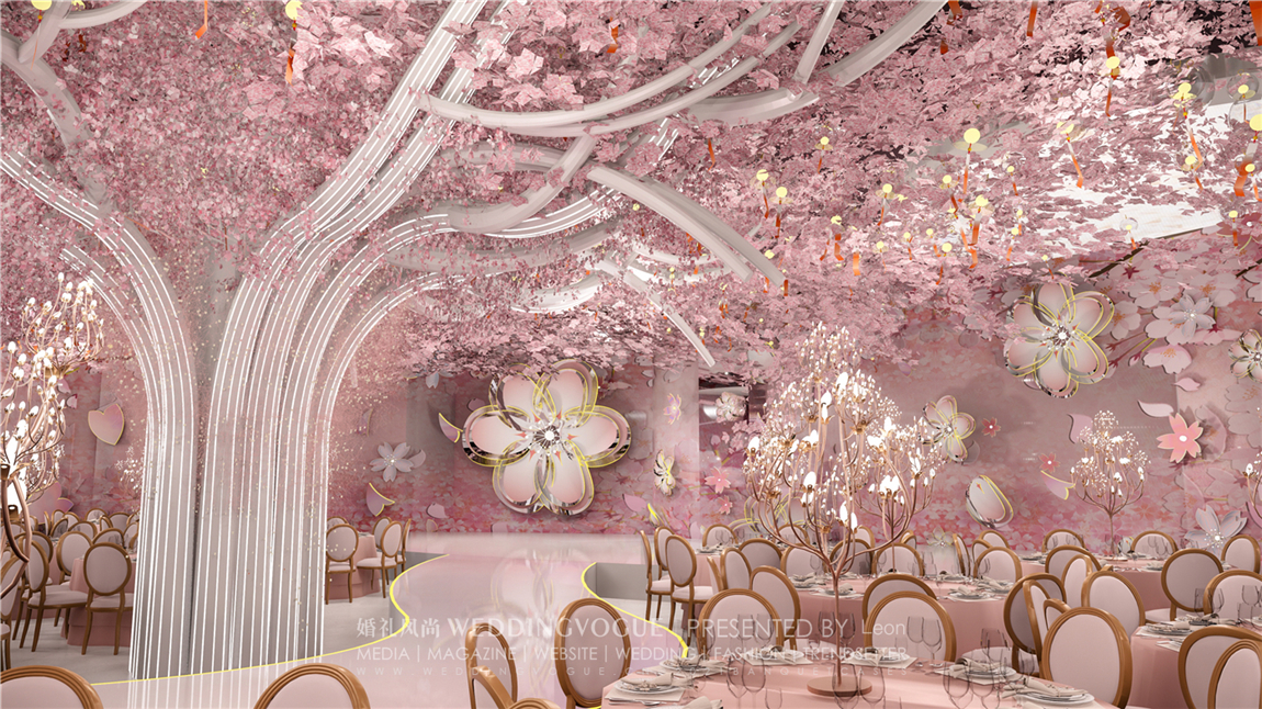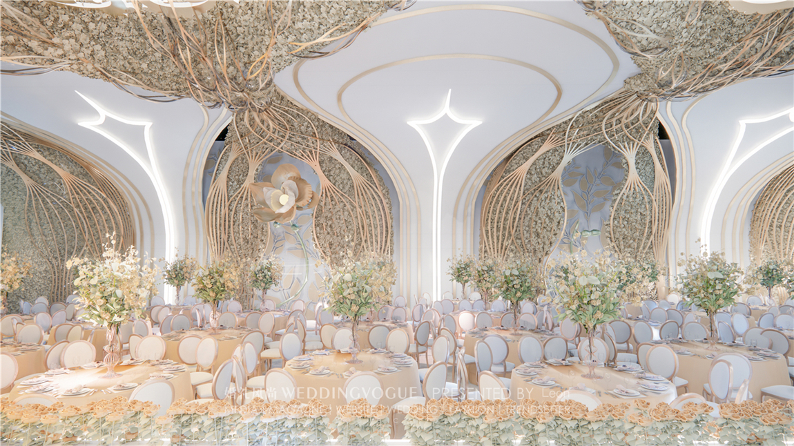 本宴会厅设计更偏向自然,以粉白黄为主色调,打造梦幻氛围。圣树上繁花与星光共舞,支撑起大厅,在一片红粉宾客簇拥下,执子之手,走向从此刻起共享的未来。