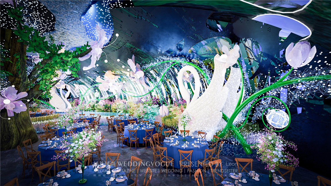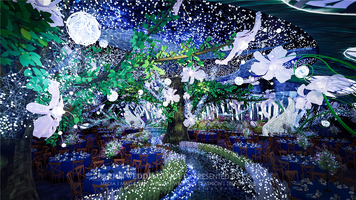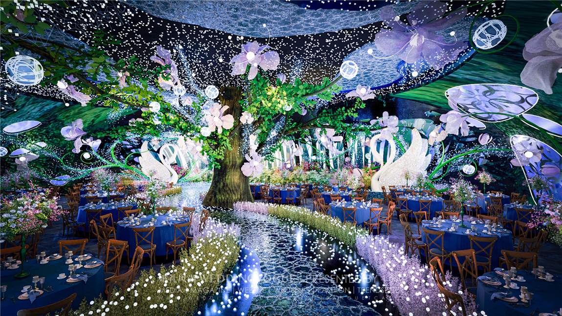 本宴会厅以“天鹅、童话、爱情、陪伴”为构思,充满地域市场流行的森系海洋童话风格。