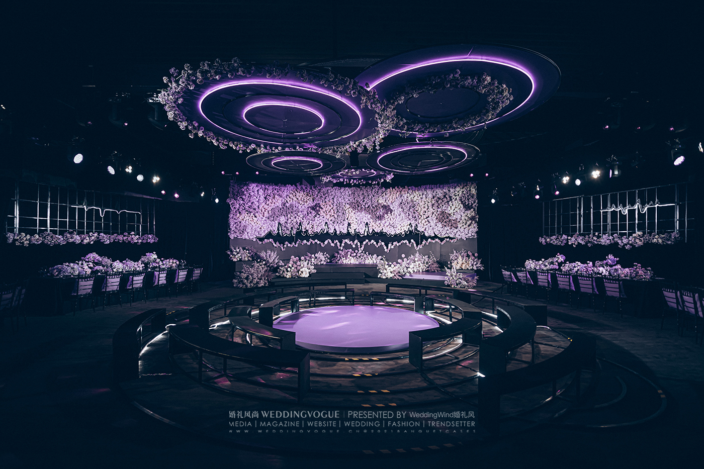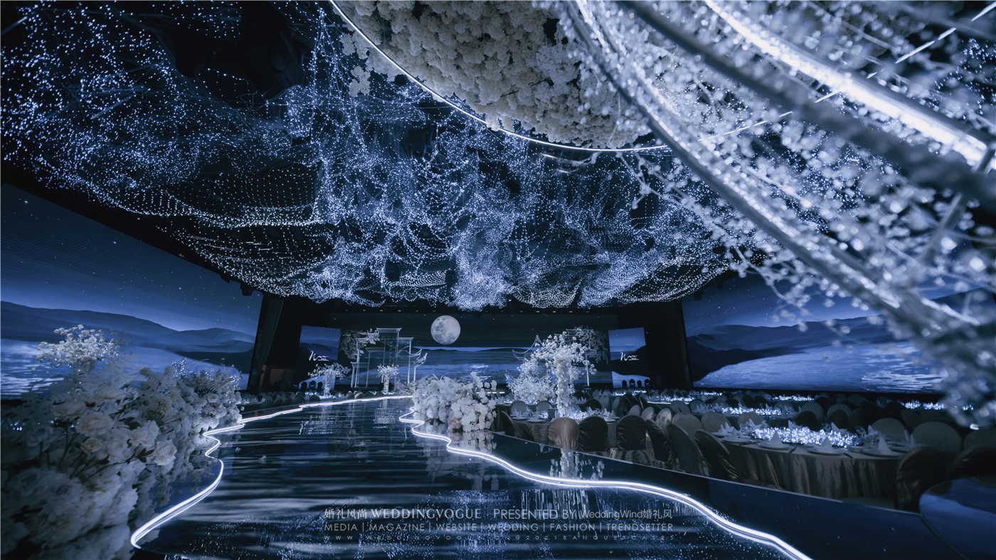 通常在婚礼设计中很少采用大量的多媒体视效,《春江花月夜》大胆尝试了270°环形大屏的超沉浸式设计,通道也是央视春晚同款地屏。