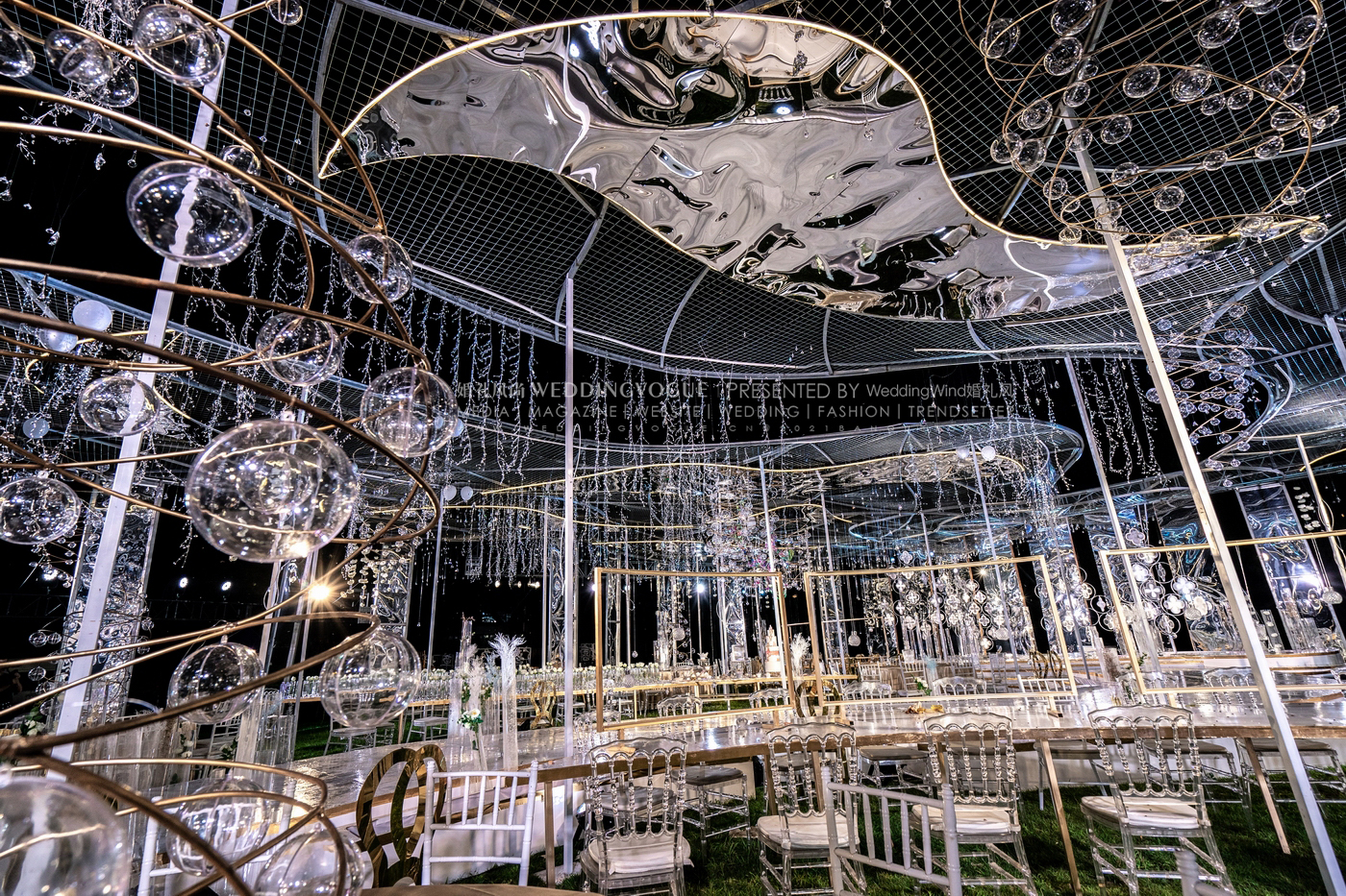 在美妙绝伦、奇幻异彩的视觉效果背后,设计师张球Wynne.Z带领团队定制了几十组衍生画面、经历了无数次的沟通、试验、推翻、否决......最终得以造就这场前所未有的音画诗幕剧的沉浸式婚礼。