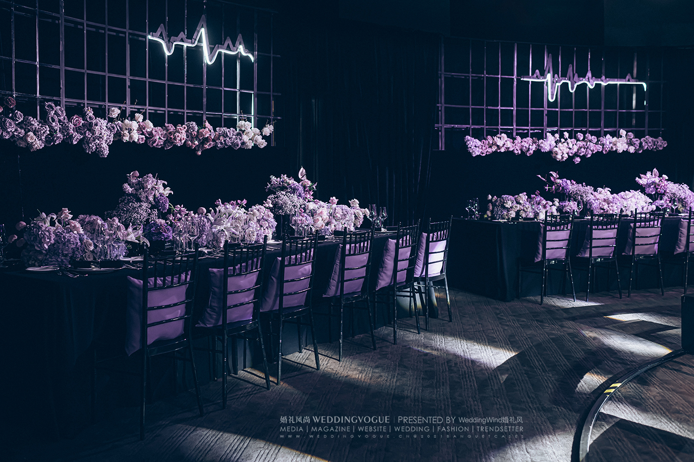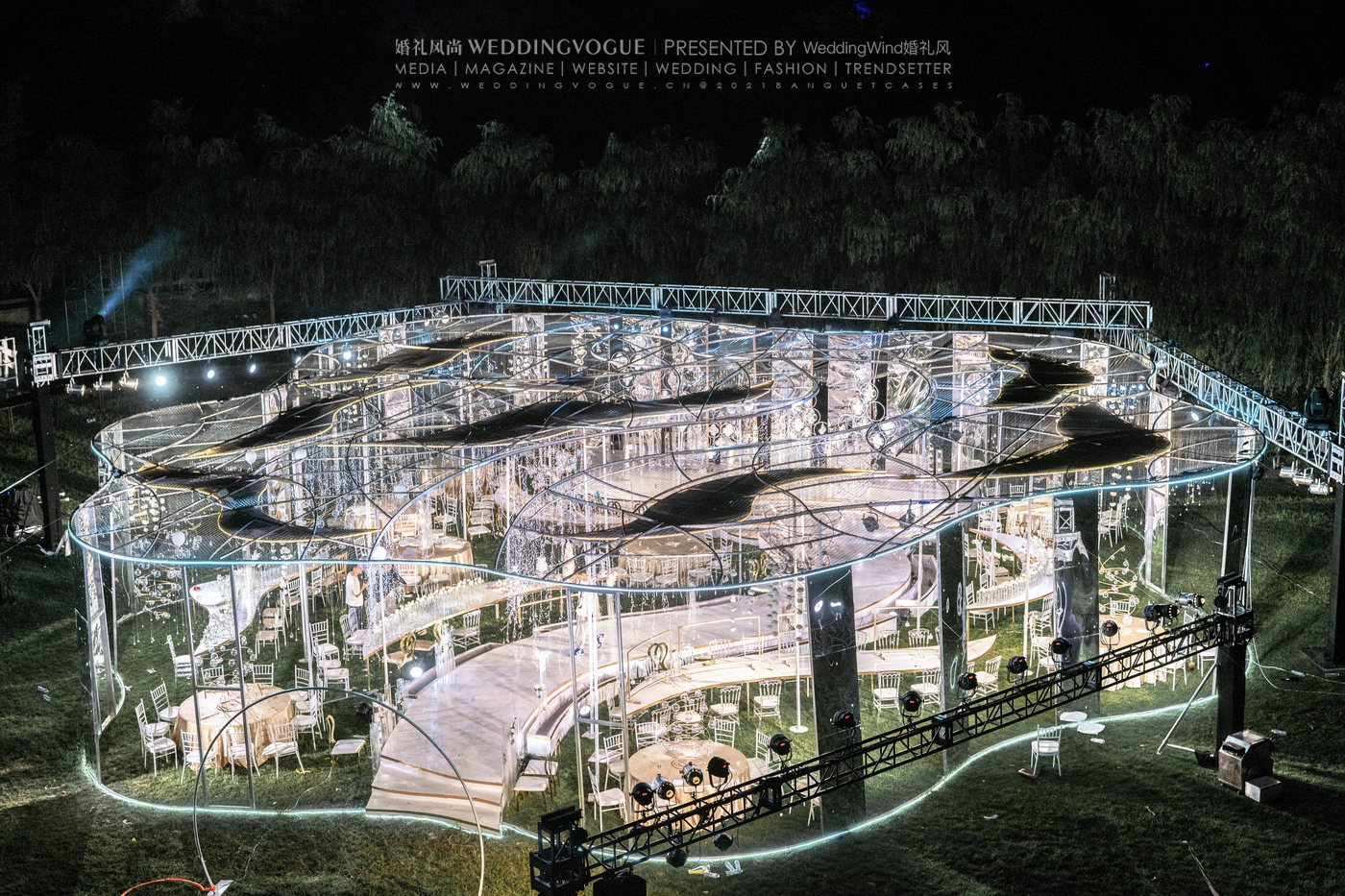 置身其中的新人和宾客,都好似成为唱片中的一段与我们留下共同回忆的音乐片段。在那个美好的夜晚,一段音乐爱情故事正在巨大的唱片上播放。