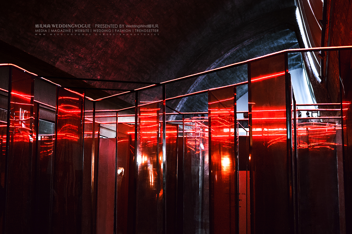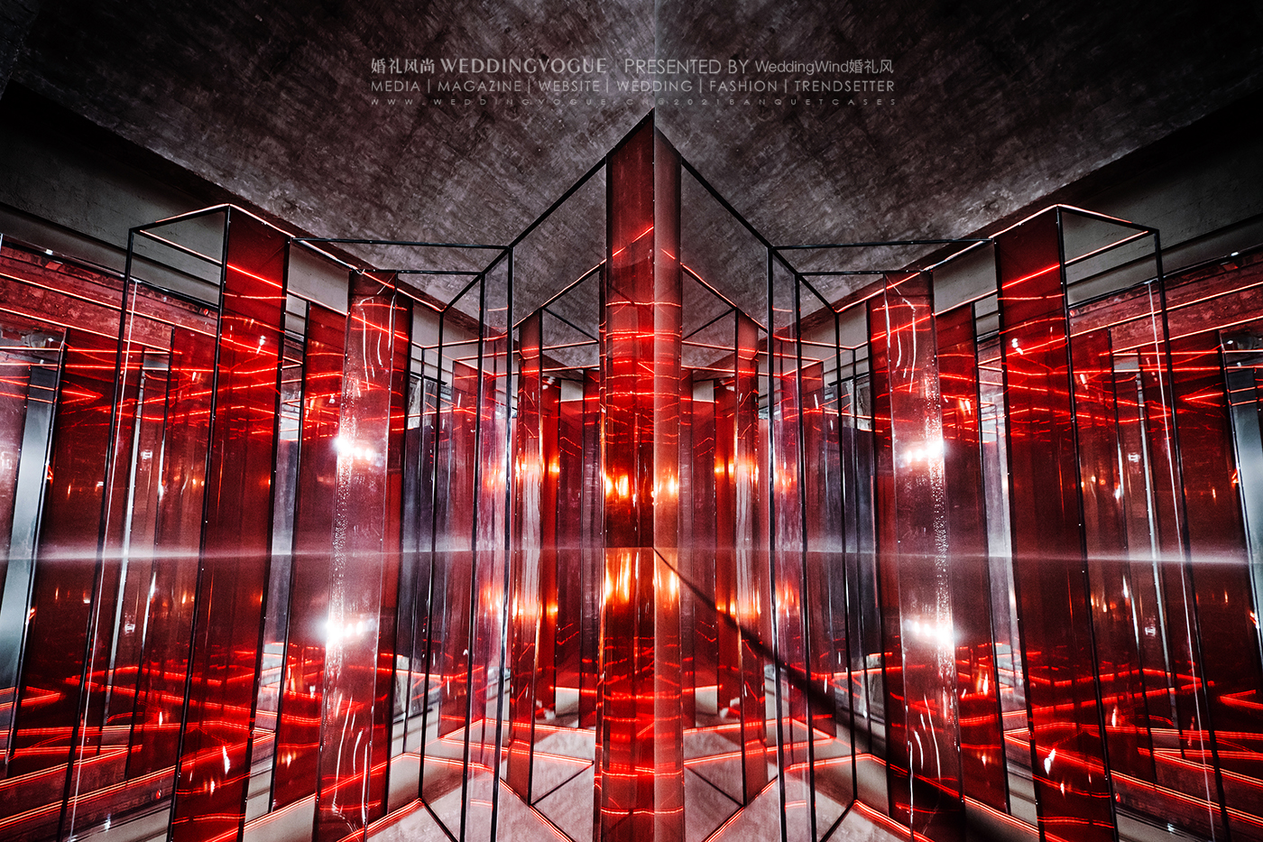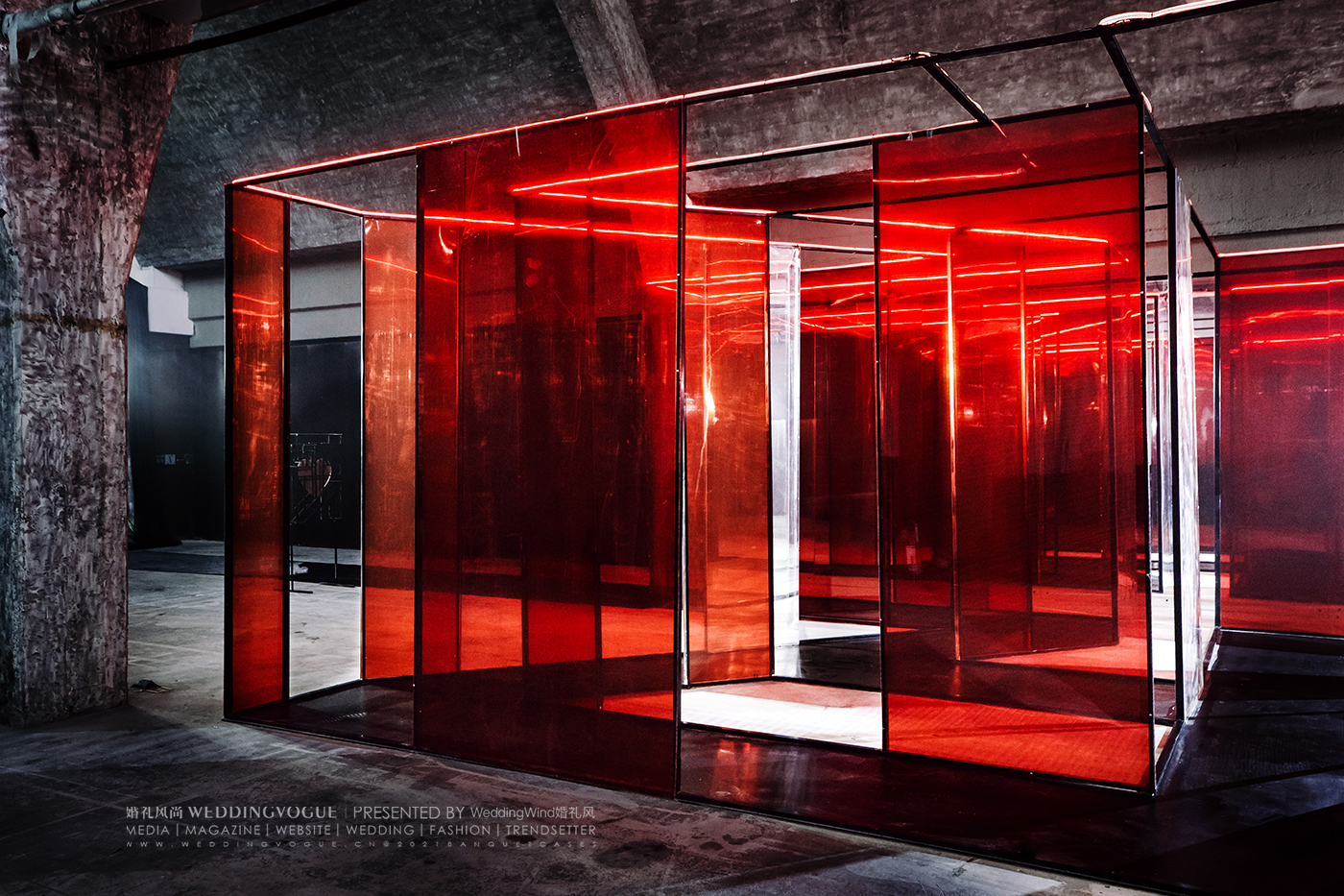 在这一设计作品中,设计师张球Wynne.Z在包豪斯风格的场地之上融合极简的秀场风格,将热烈的红与极致的黑激情碰撞,产生奇妙的视觉反应,以透明元素与光影交织打造通往内心的迷宫。