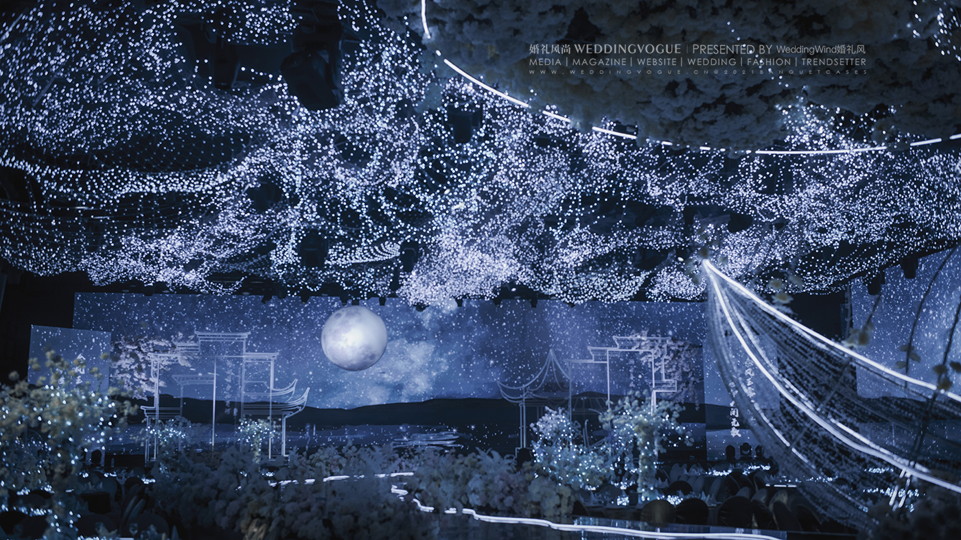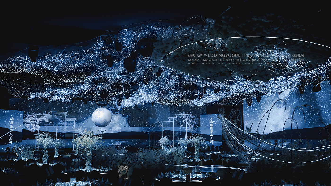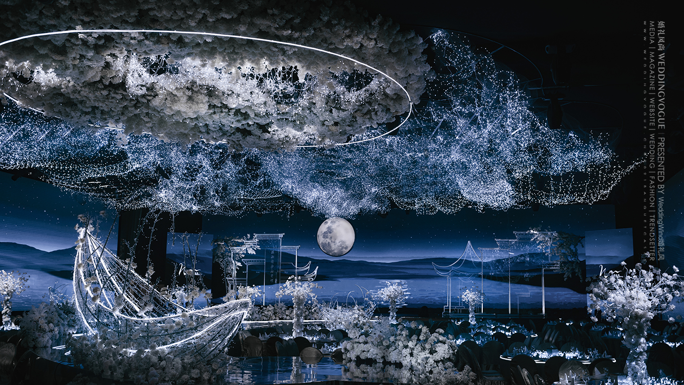 设计师张球Wynne.Z在面对婚礼新人“月”“船”“水”的设计需求时,“春江花月夜”的场景已经跃然眼前。这是张若虚《春江花月夜》第一次被设计做诗化时空的婚礼——一场音画「诗」幕剧沉浸式婚礼。