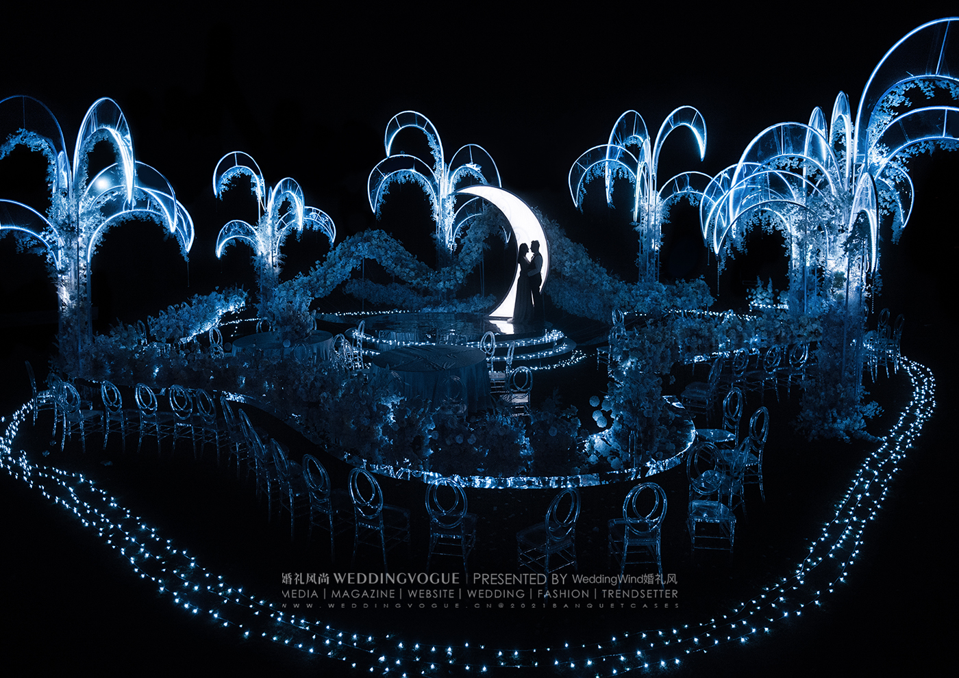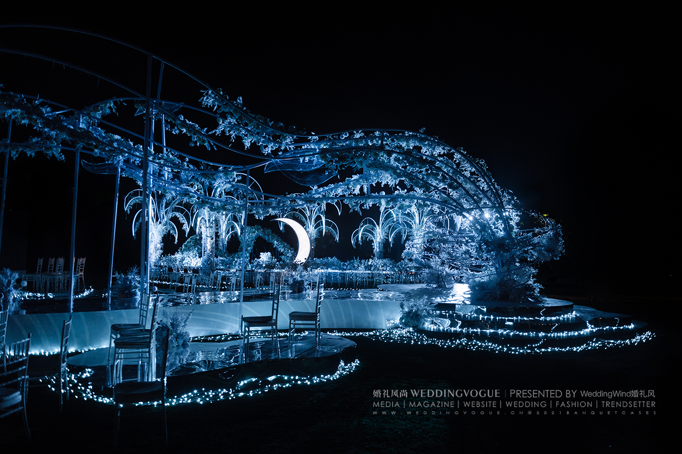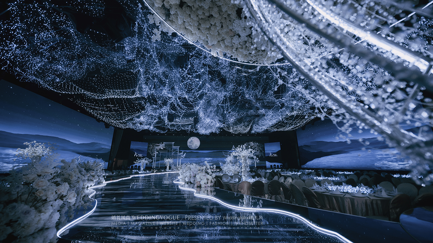设计师张球Wynne.Z在面对婚礼新人“月”“船”“水”的设计需求时,“春江花月夜”的场景已经跃然眼前。这是张若虚《春江花月夜》第一次被设计做诗化时空的婚礼——一场音画「诗」幕剧沉浸式婚礼。