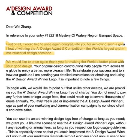 此次两个设计作品在国际性专业赛事意大利A´Design Award上获奖,既是对她设计能力的肯定与褒奖,也是以她为表率的中国婚礼/空间设计师在国际性赛事上的有力发声。