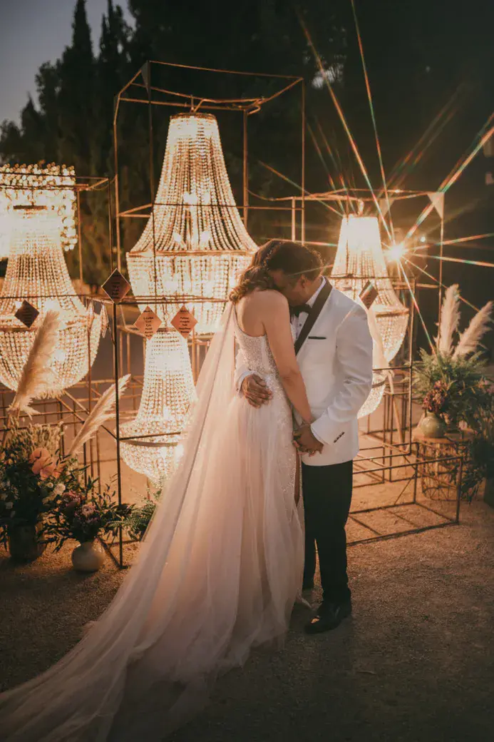 随着水晶灯的广泛运用,其使用场景也不再局限在室内。很多室外晚宴亦通过水晶灯装点。在形式上既可以借鉴室内悬挂方式,也可以借助镂空金属铁架将不同尺寸的水晶灯组合成功能区。这样即使是在室外,也可以呈现出华丽闪耀的氛围。