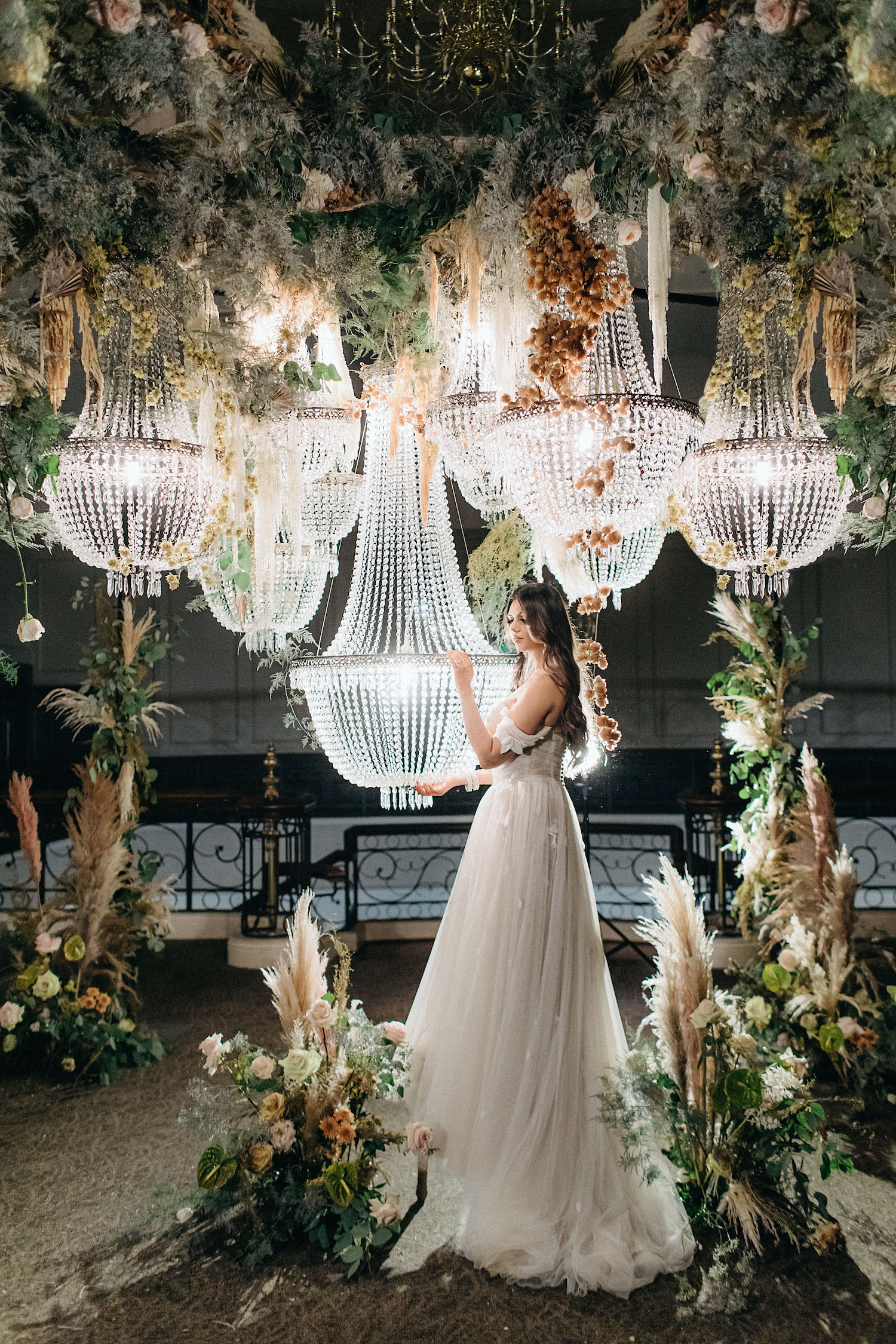 由于使用金属材质打造枝桠结构,让原本华丽的水晶在金属镜面属性的帮助下更加璀璨。但将水晶灯与花材、绿植相融合也会产生不一样的和谐感,置身自然,感受斑驳流光。