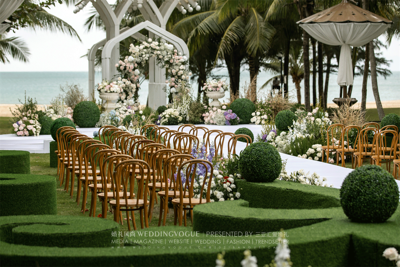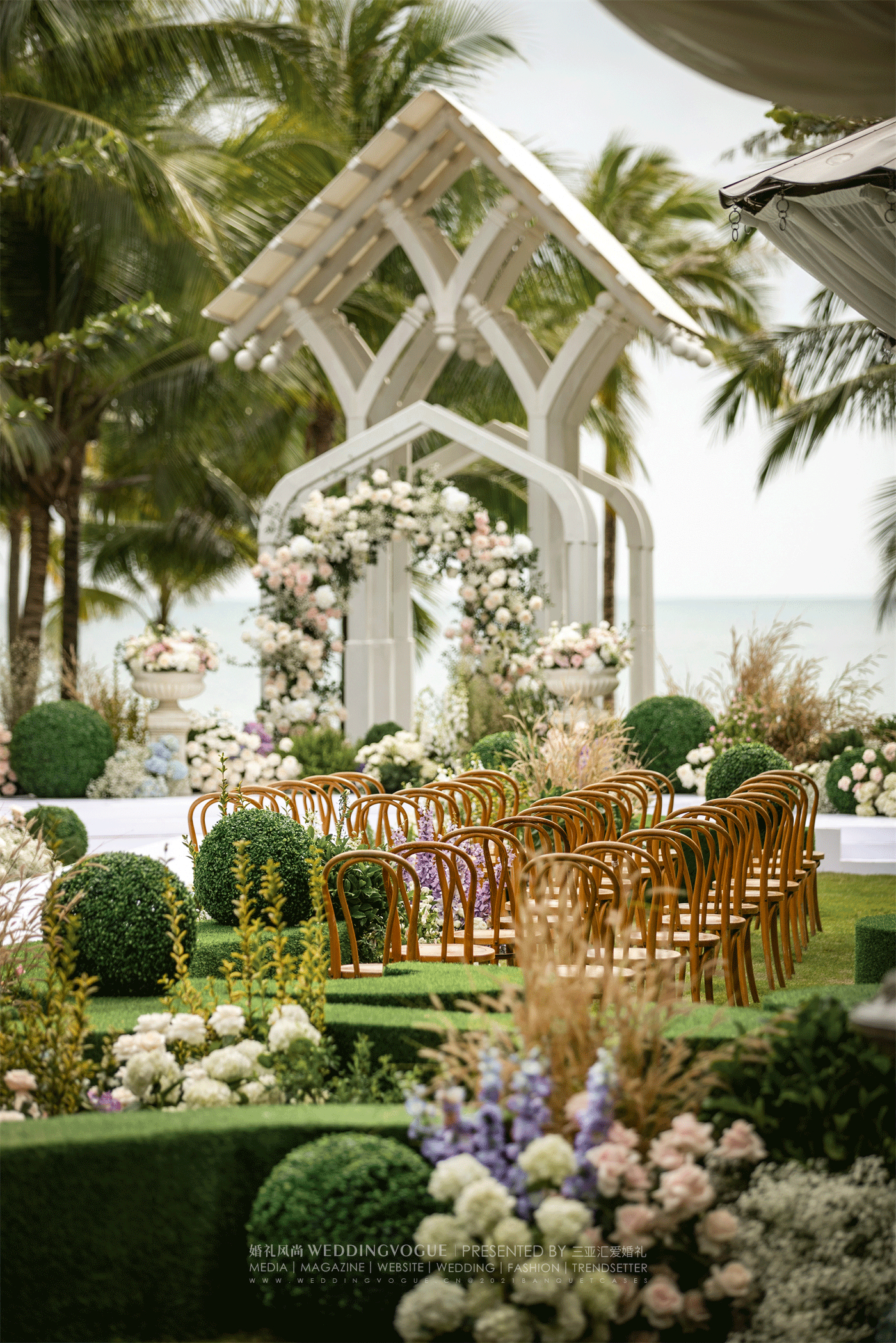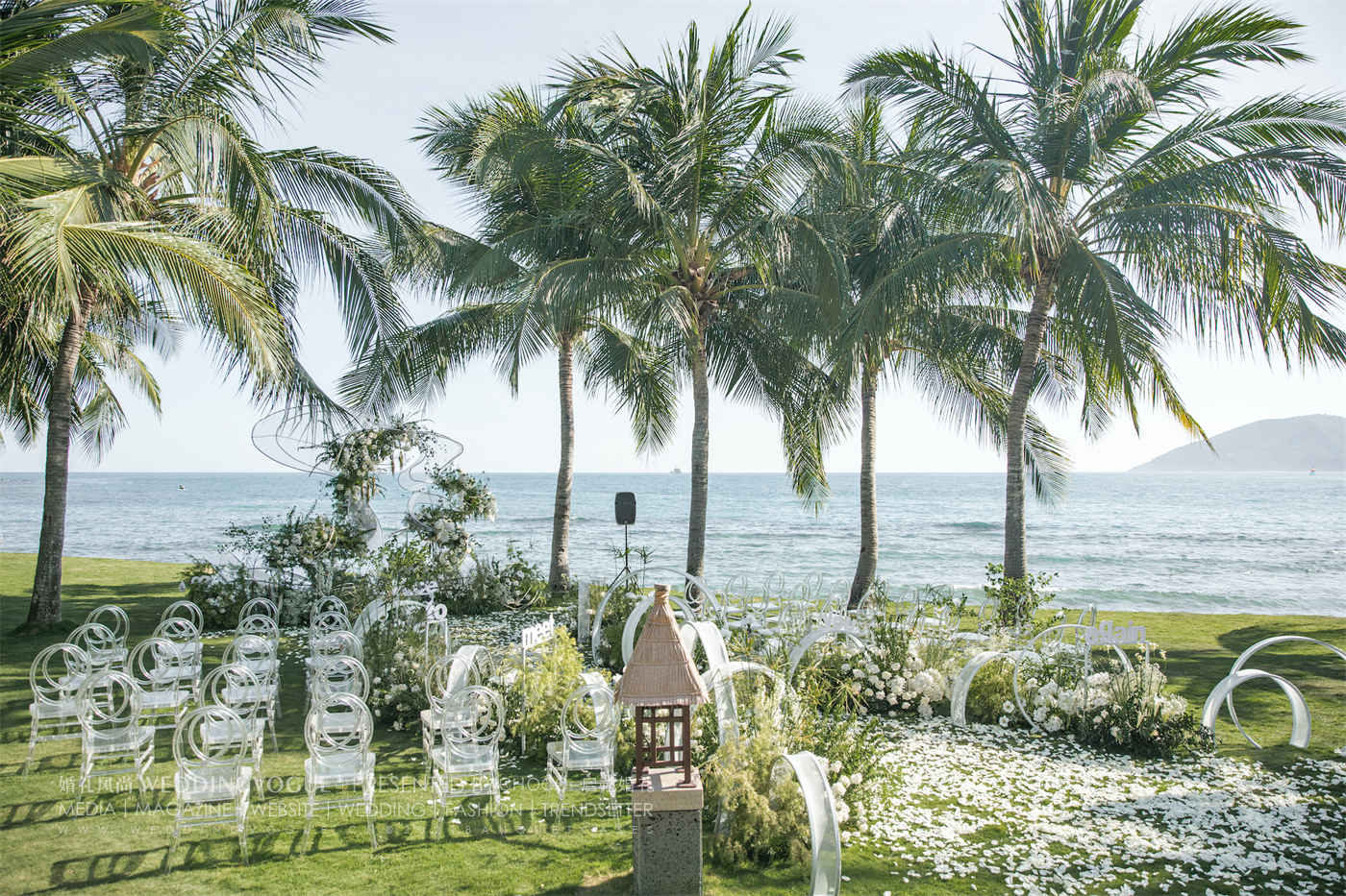 婚礼布置在被椰林环抱的宽敞草坪上,