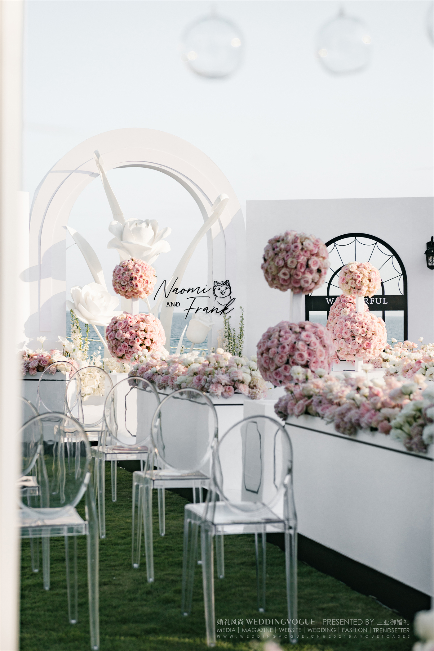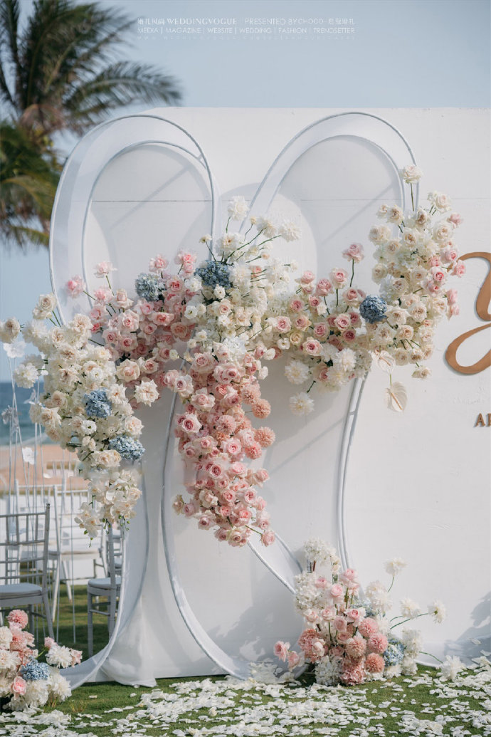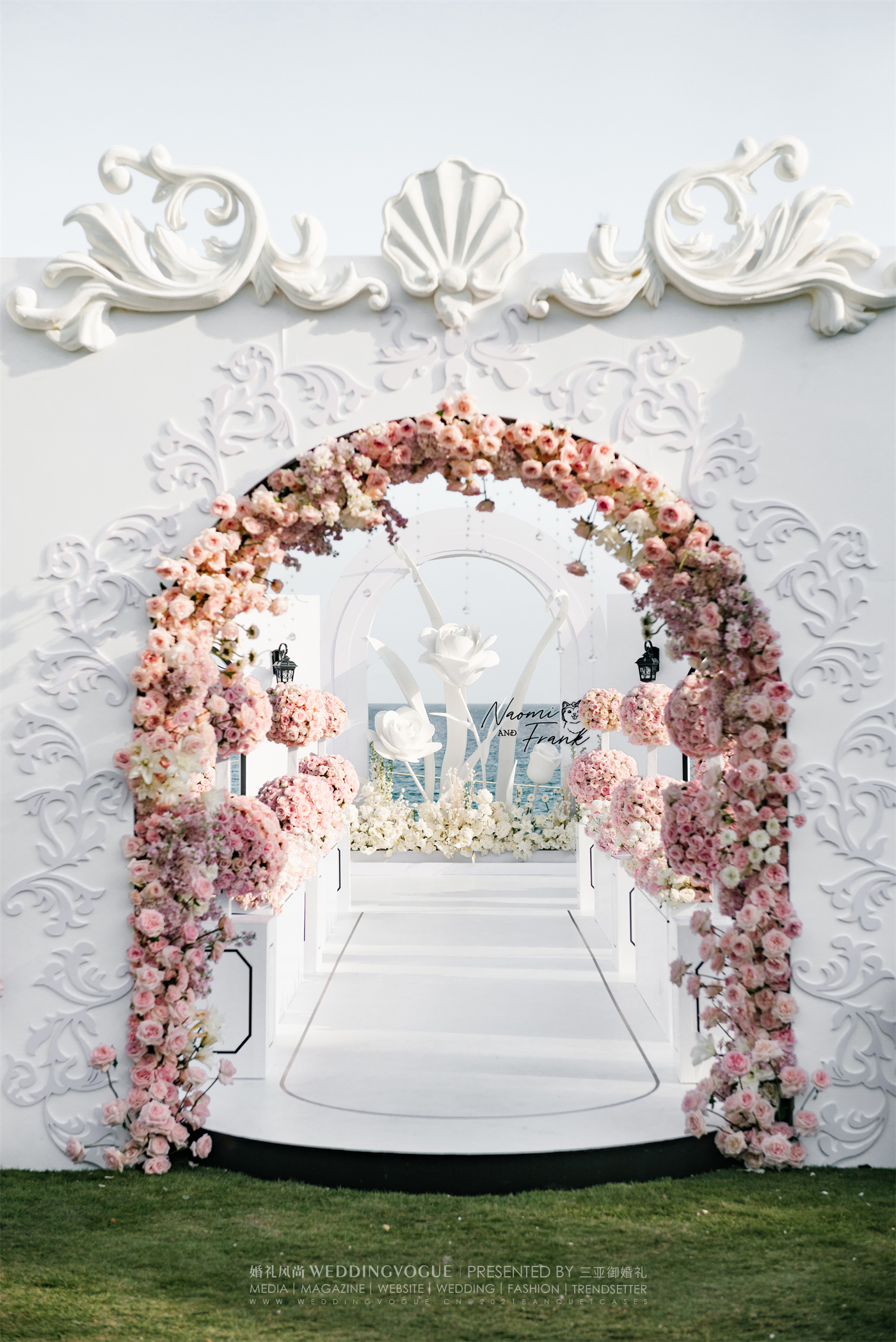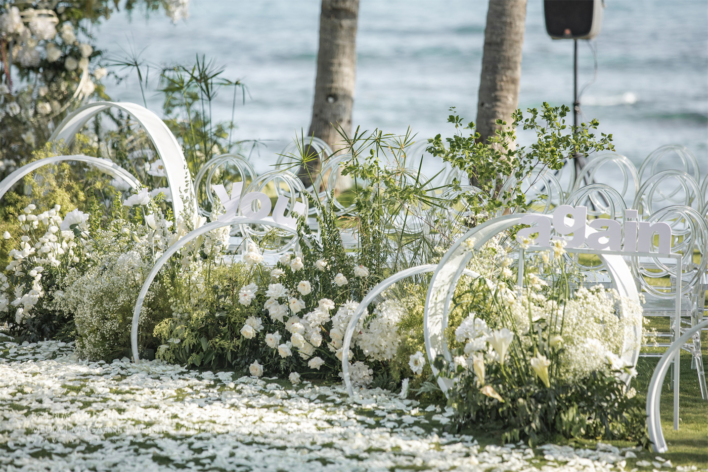 浅海区的蓝色卷起纯白的浪花,婚礼现场的粉色散播怡人的气味,就着变幻的云彩和风声,和心爱的人在亲友的见证下完成人生重要的仪式。