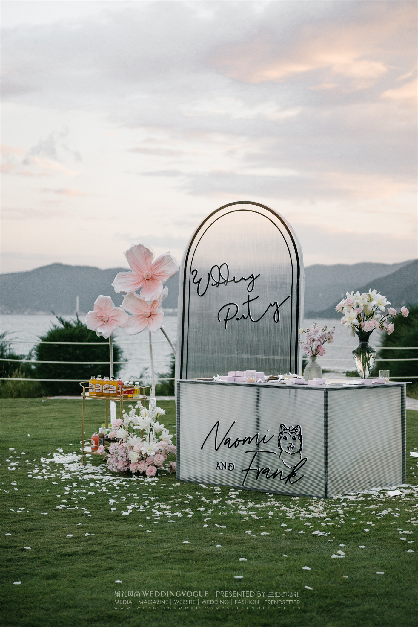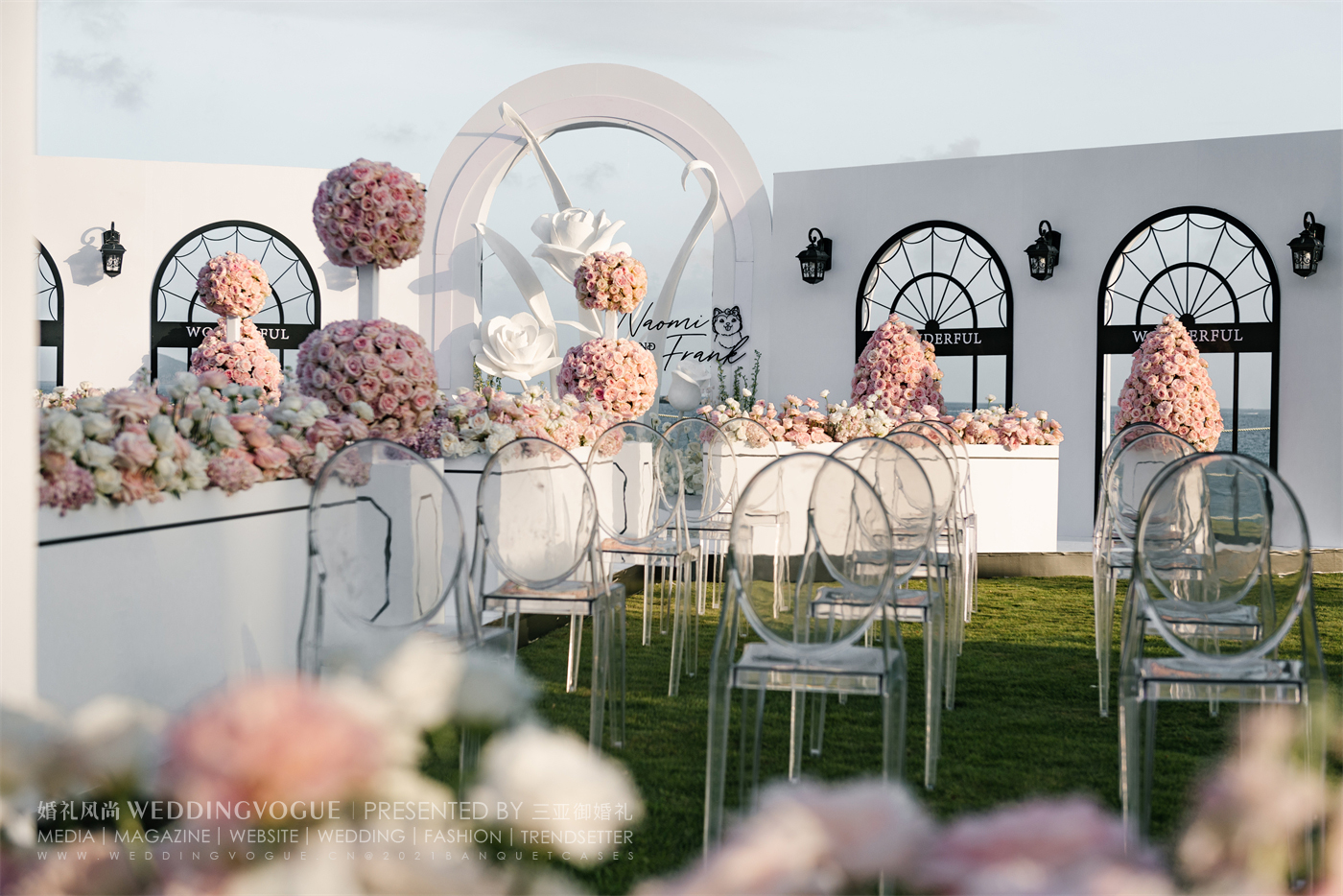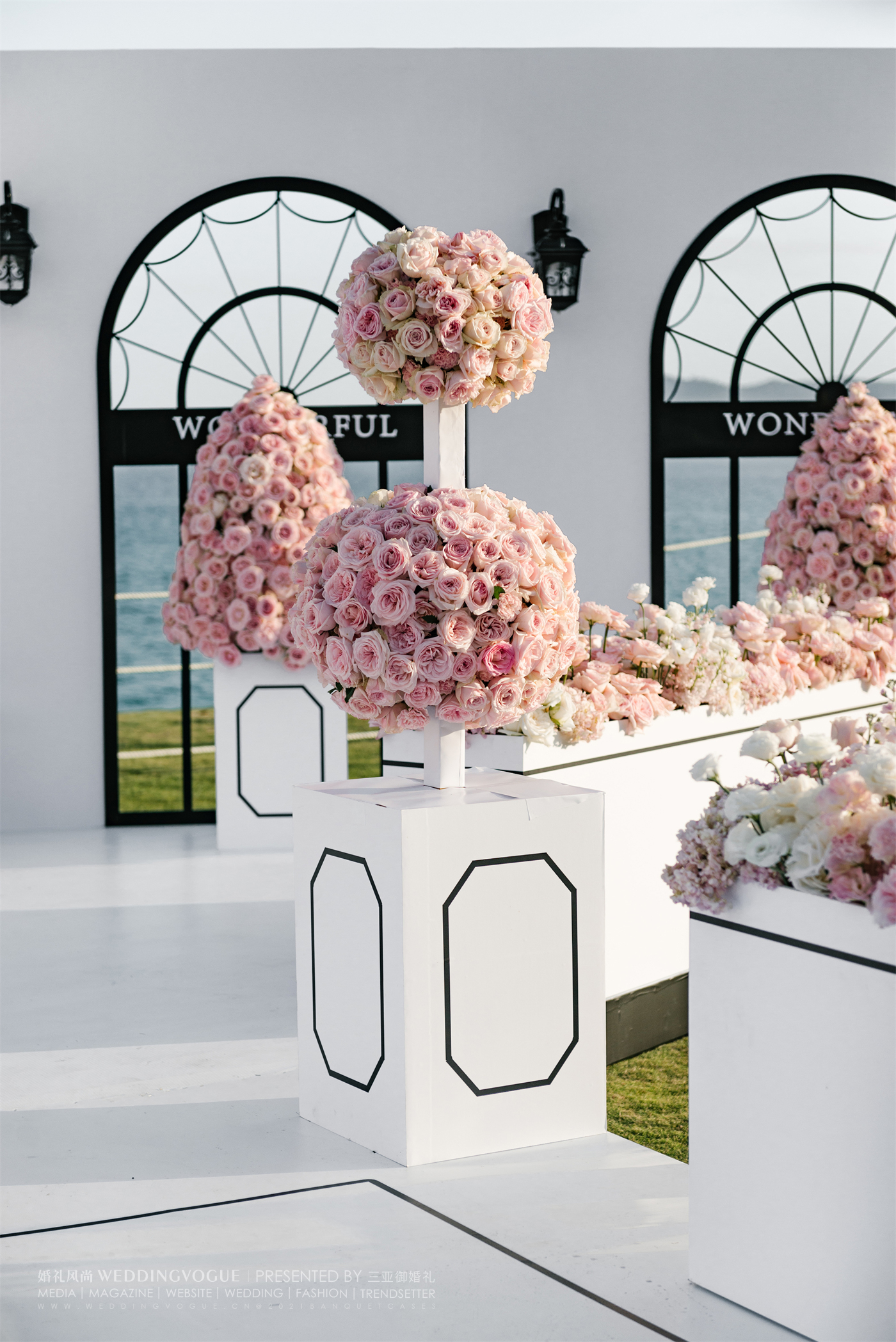 浅海区的蓝色卷起纯白的浪花,婚礼现场的粉色散播怡人的气味,就着变幻的云彩和风声,和心爱的人在亲友的见证下完成人生重要的仪式。