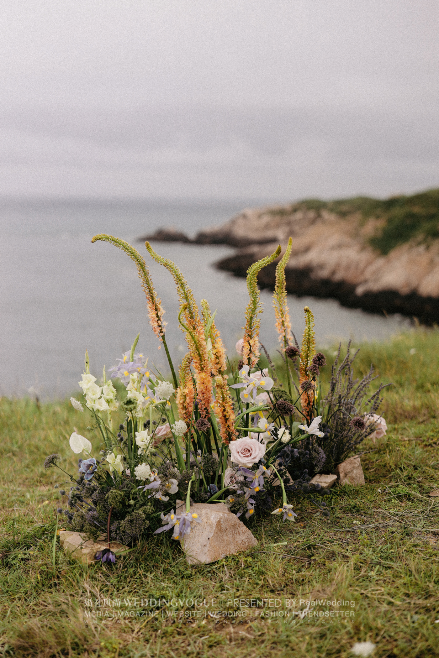 在浪花拍打着的海崖边,设计师用鲜花和少许道具布置现场,自然与土地成了最纯粹也最浪漫的背景。尊重土地与自然,勇敢去爱的新人恰好契合了东极岛的原始美感。
