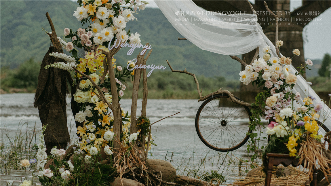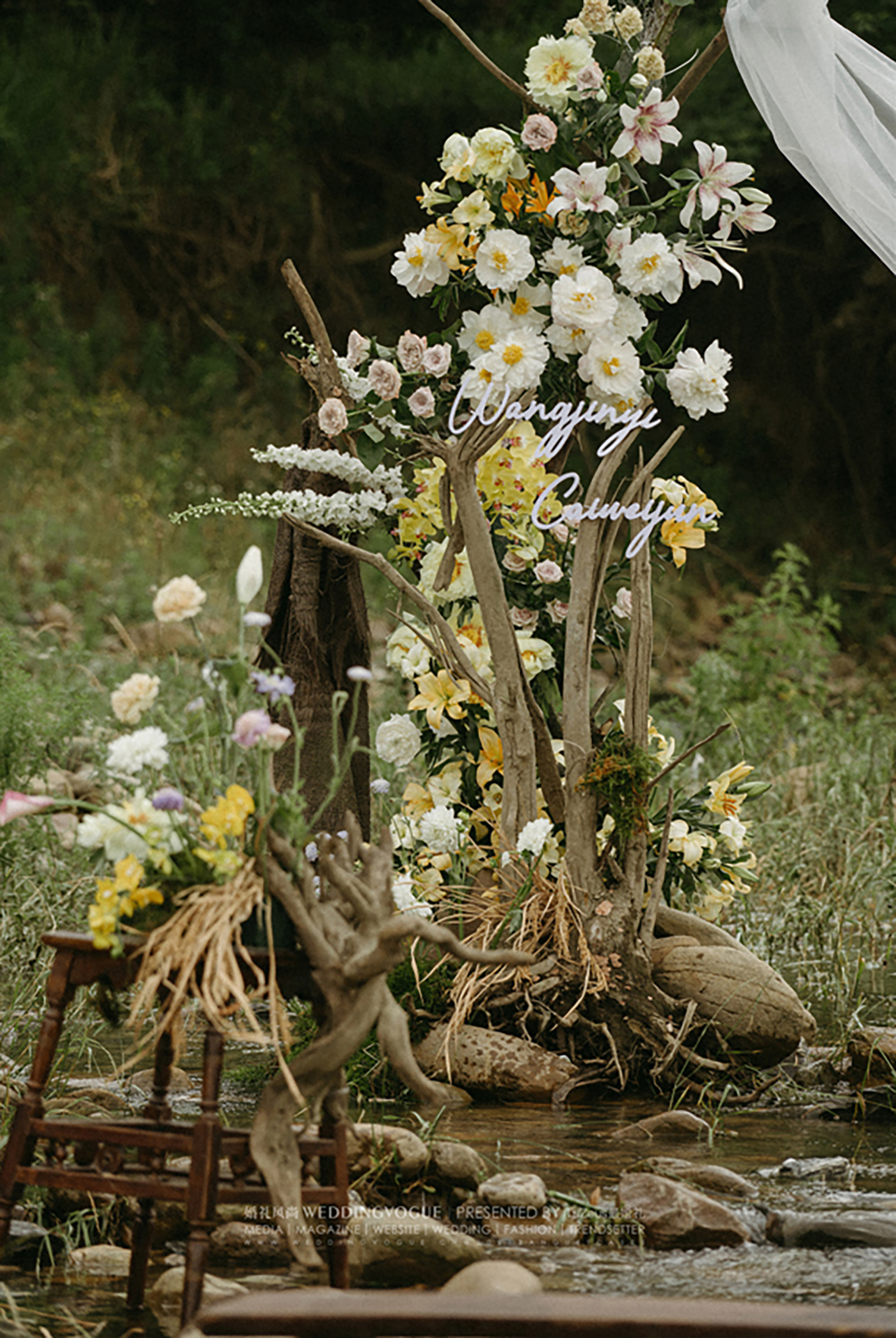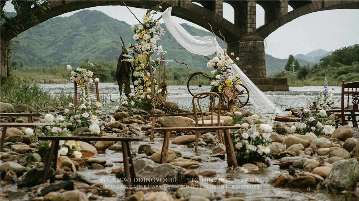在自然秀美、生态优渥的安吉一处远离市区的小溪中,TuZeus最婚礼完成了他们的首场目的地婚礼。以自然的溪流和磐石为主要背景,以盘根的树桩和清雅的花艺为点缀,新人相伴流水之中,画下返璞归真的风景。