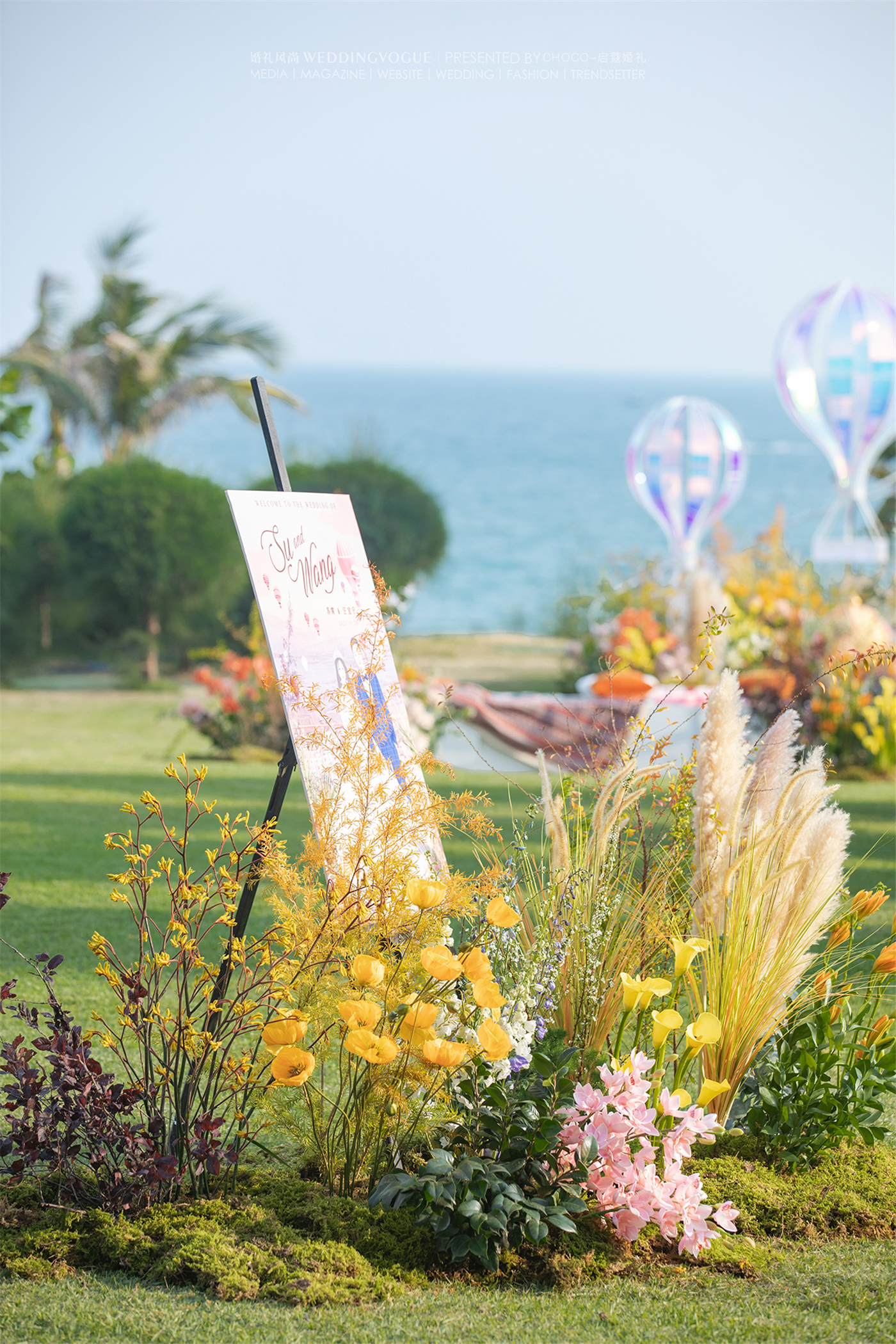在洒满阳光的海岛,CHOCO-启蔻婚礼以旅行为主题为新人设计了的游园氛围的海滨草坪婚礼。