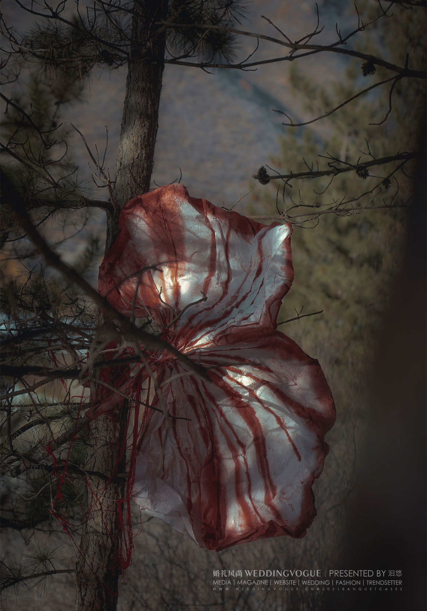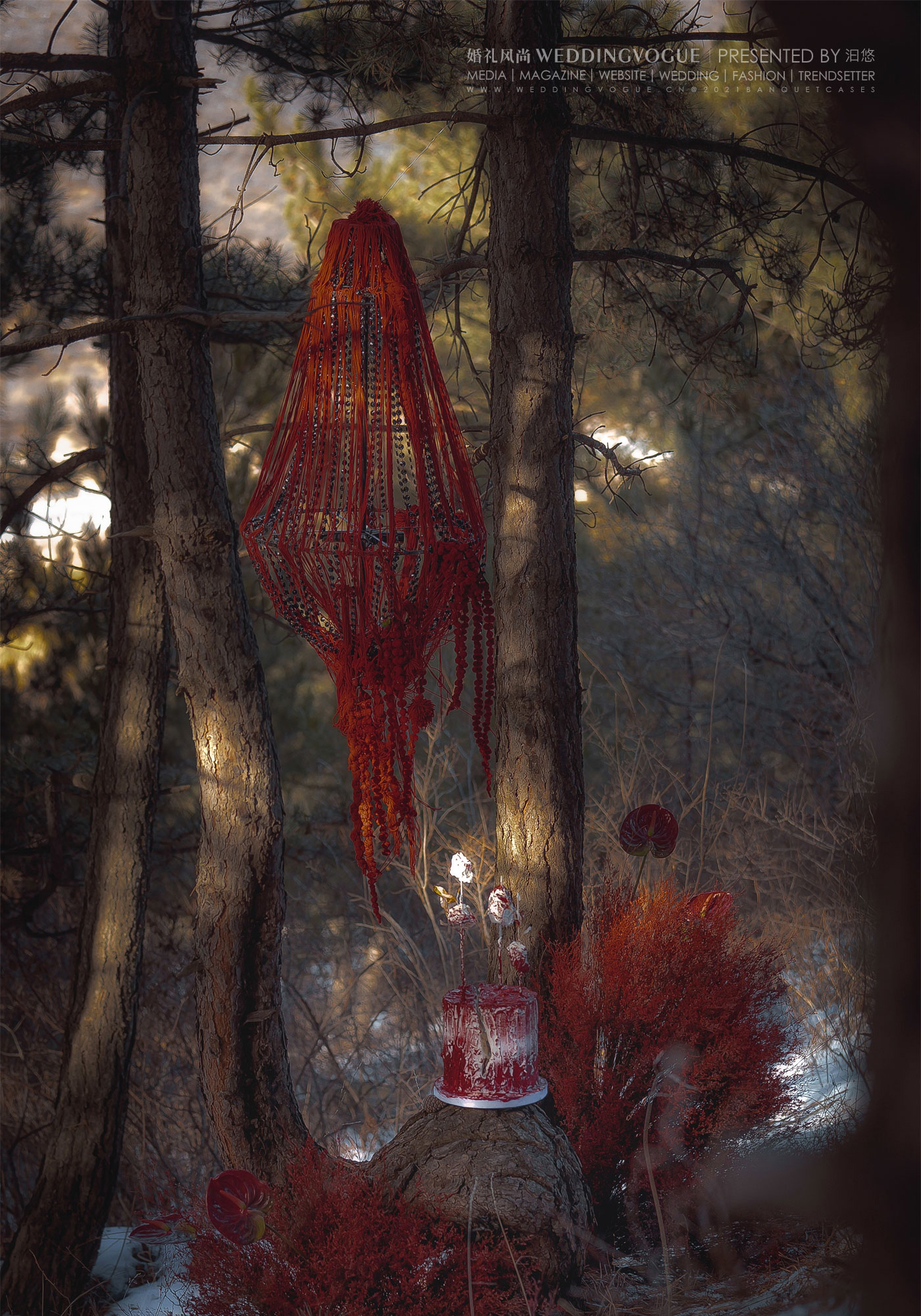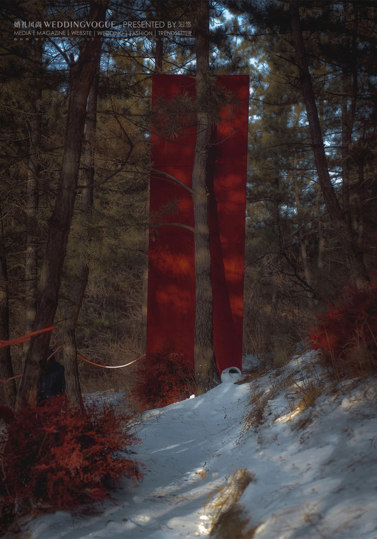 这是设计师汩悠在张家口的雪地里做的小创作,用她的话说,作品的主题“有点丧”。红色的布幔垂悬,丝线缠绕树间,黑色的串珠延展开来是无数解不开的结。