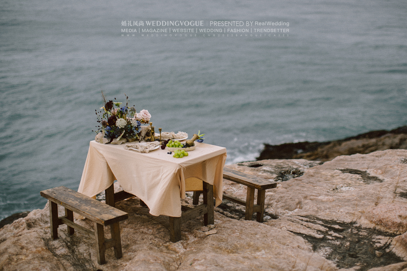 柔丽丝在风里飘荡,鸢尾花从土地里生长,随手捡来石头被写上“Bride”和“Groom”,任由风浪把桌布的边角打湿……在岩石上挂上宣誓的布幔,在极东之境,山海见证他们的爱情。“浪漫一旦滋生,东海瞬间沸腾。”