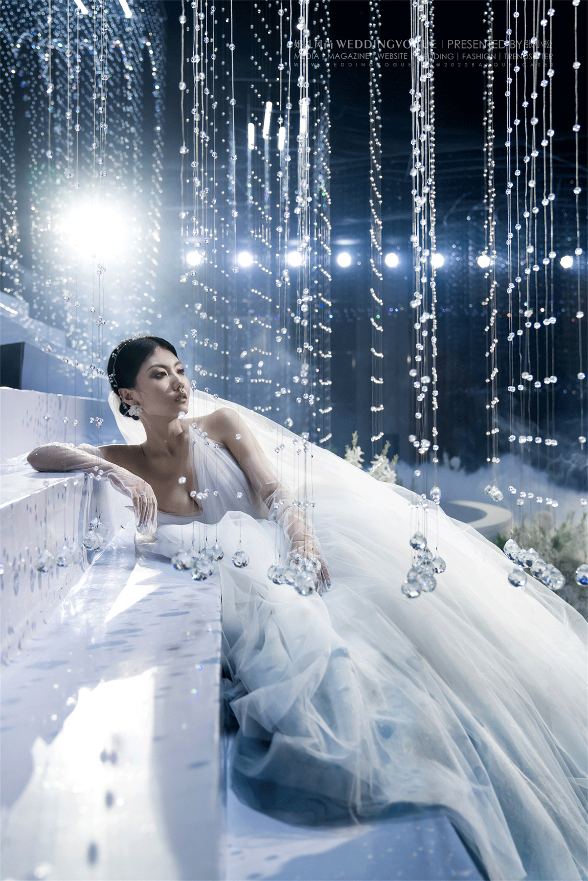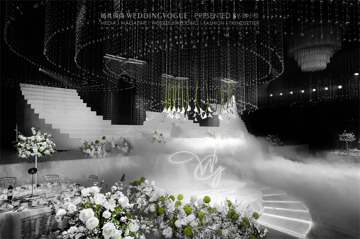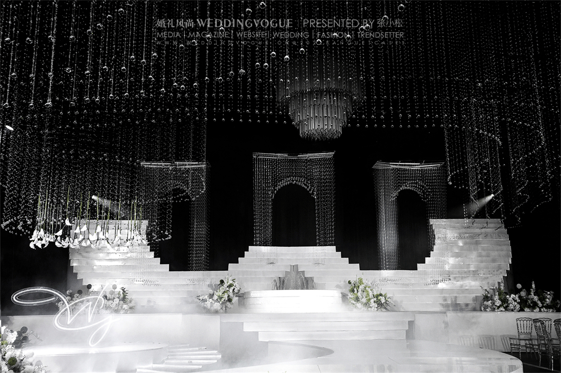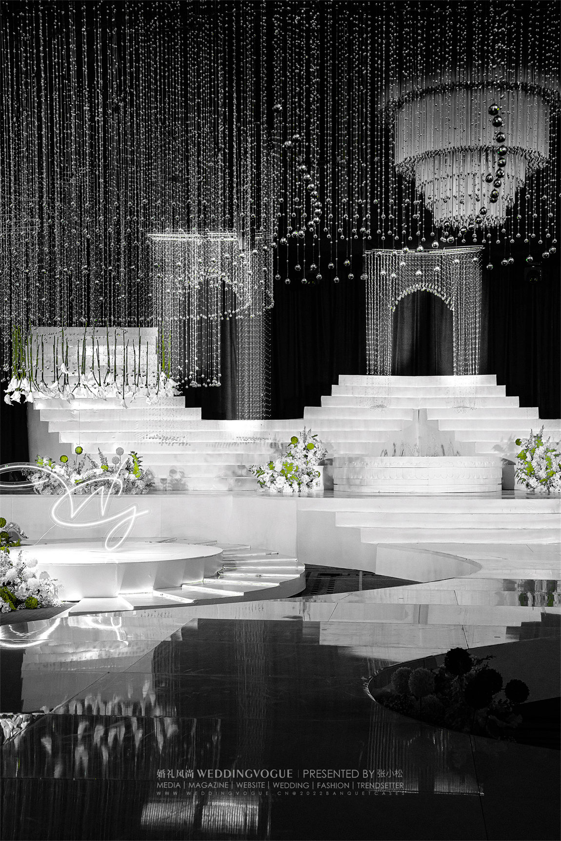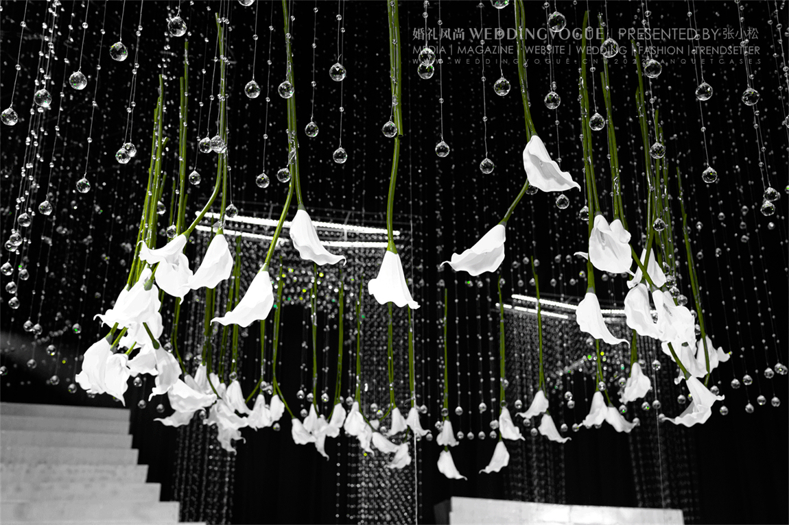 水晶是这场婚礼浪漫的点缀,设计师更大限度地发挥其营造视觉美感的潜力,使人产生眼前一亮的效果,水晶自带的梦幻的效果,也让整个婚礼更加柔美和浪漫。