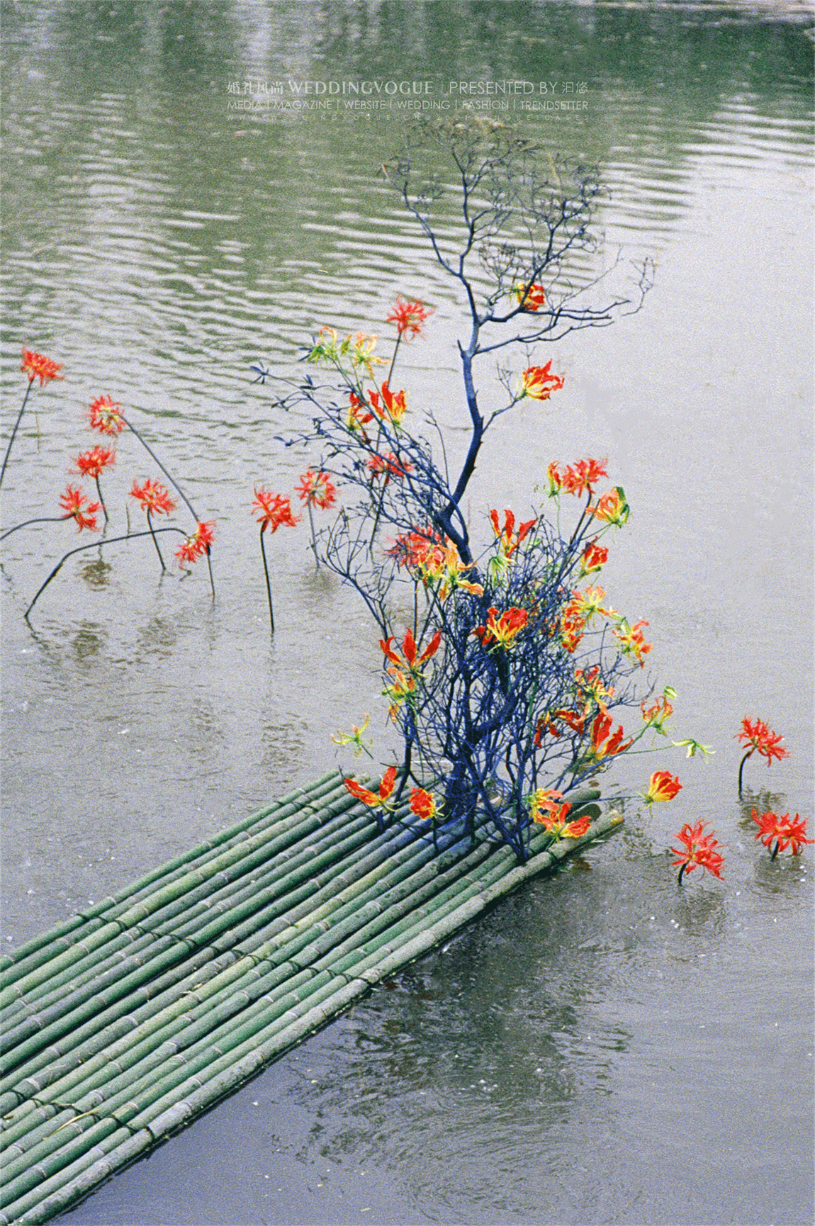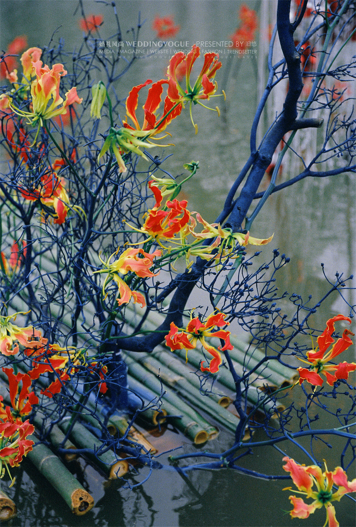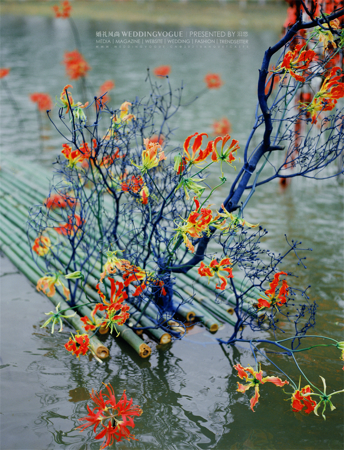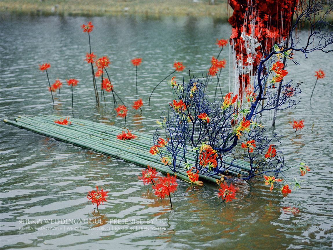 水面之中,选择兼具百合的大气与兰花的优雅的「火焰百合」嘉兰作为花艺装饰。红黄两色的花朵,波浪状向上反卷,如同火焰飞腾,热情洋溢。