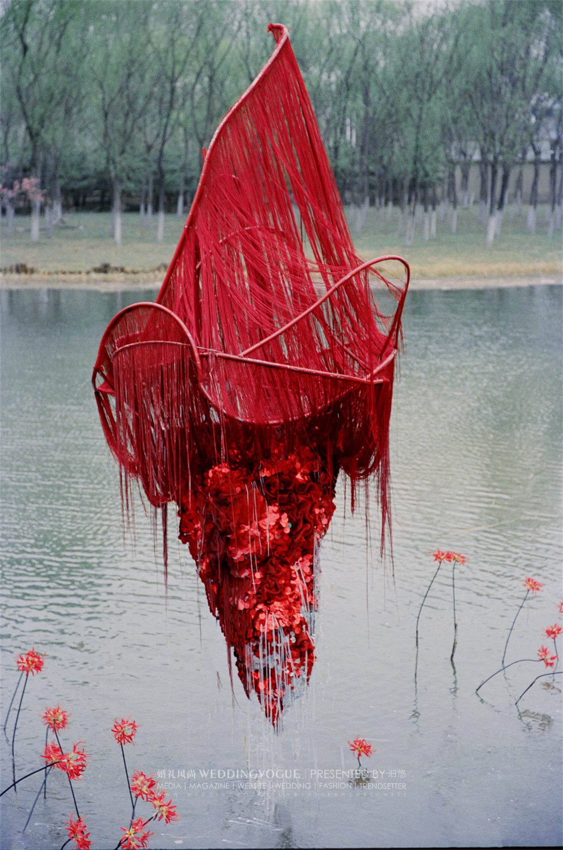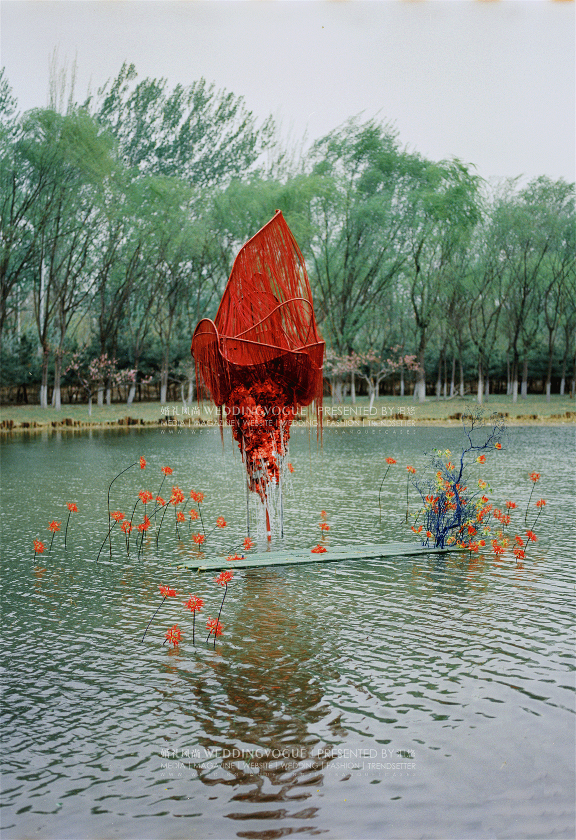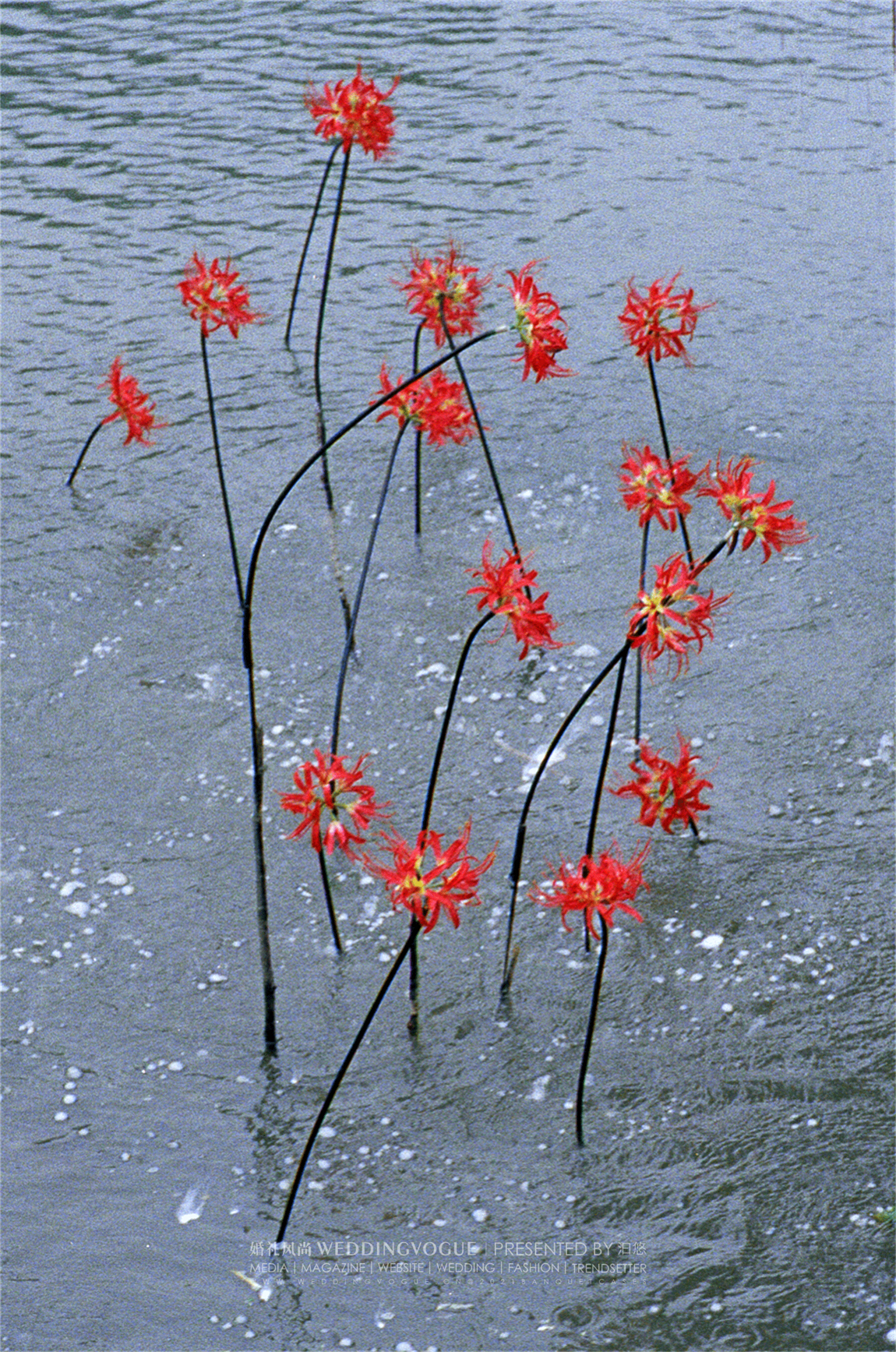 水面之中,选择兼具百合的大气与兰花的优雅的「火焰百合」嘉兰作为花艺装饰。红黄两色的花朵,波浪状向上反卷,如同火焰飞腾,热情洋溢。