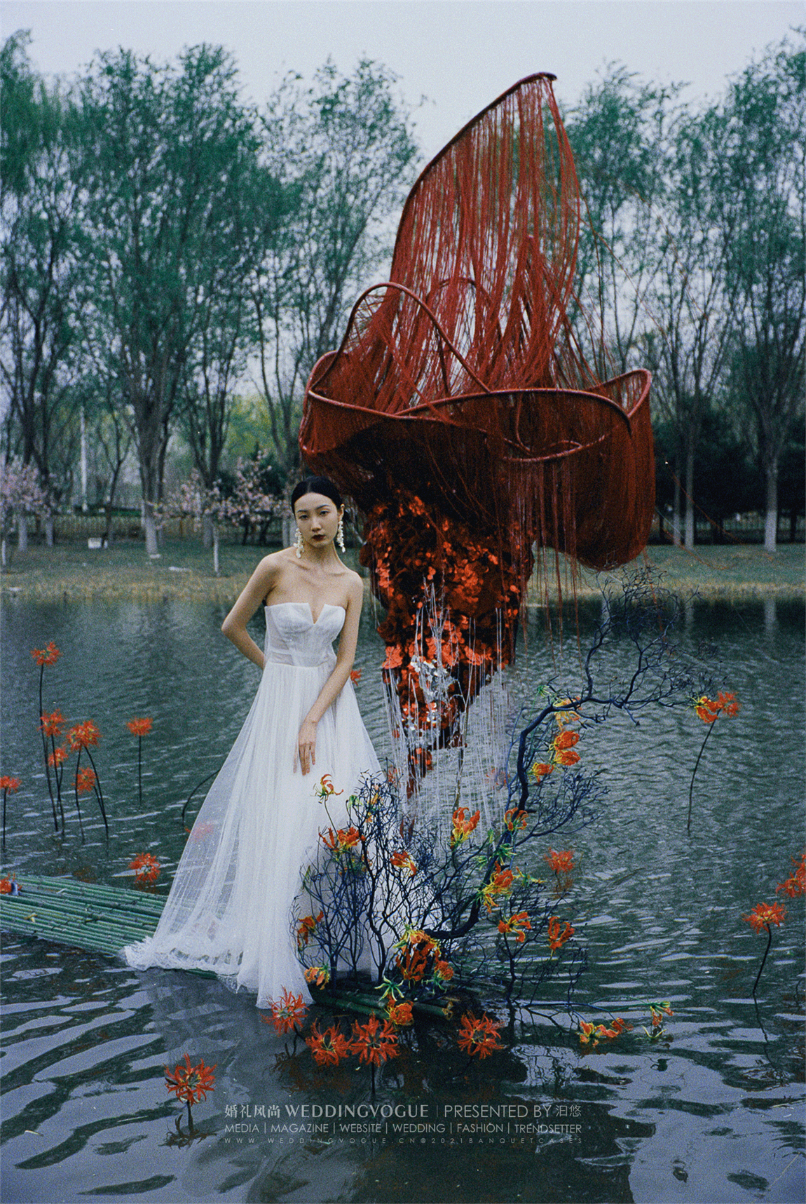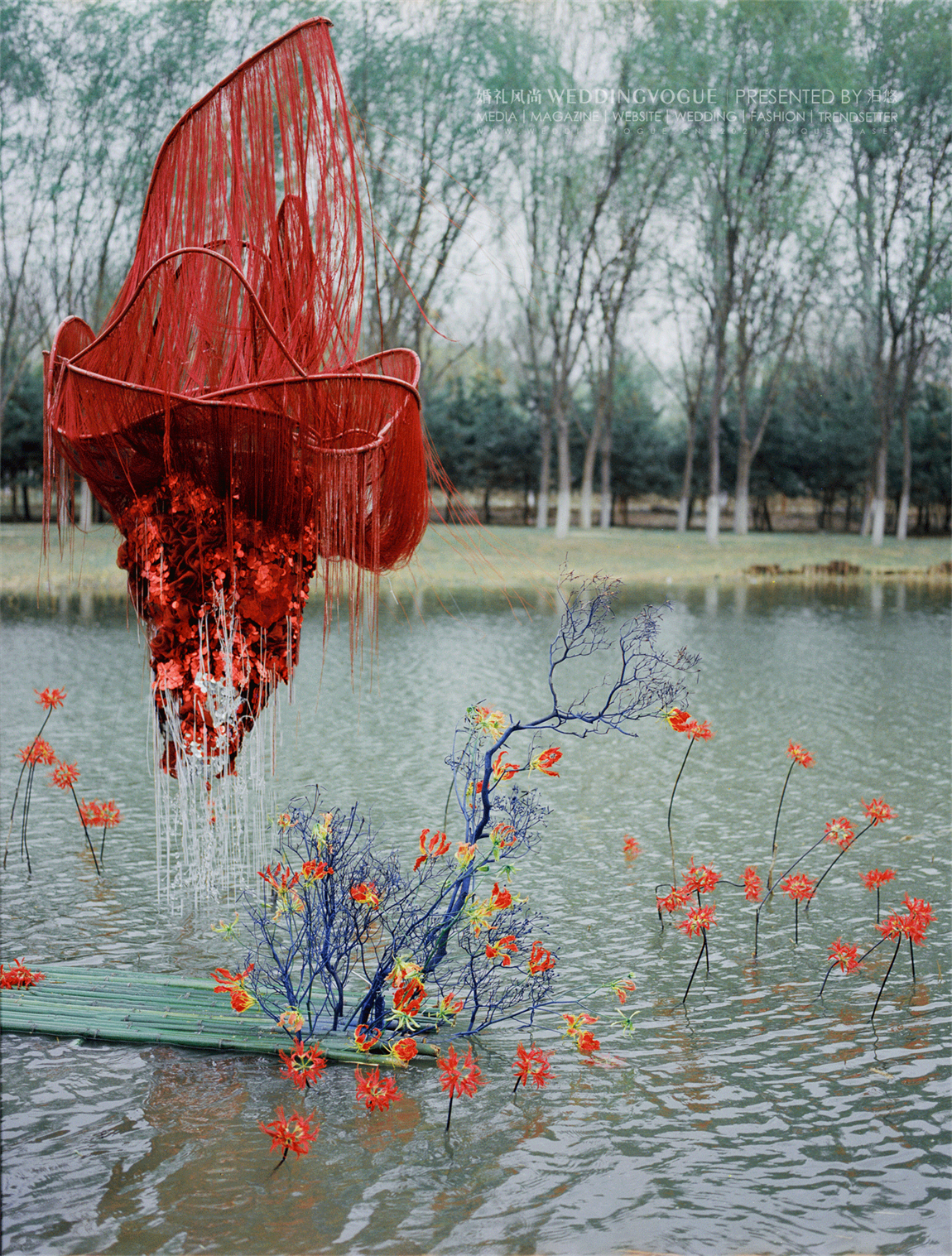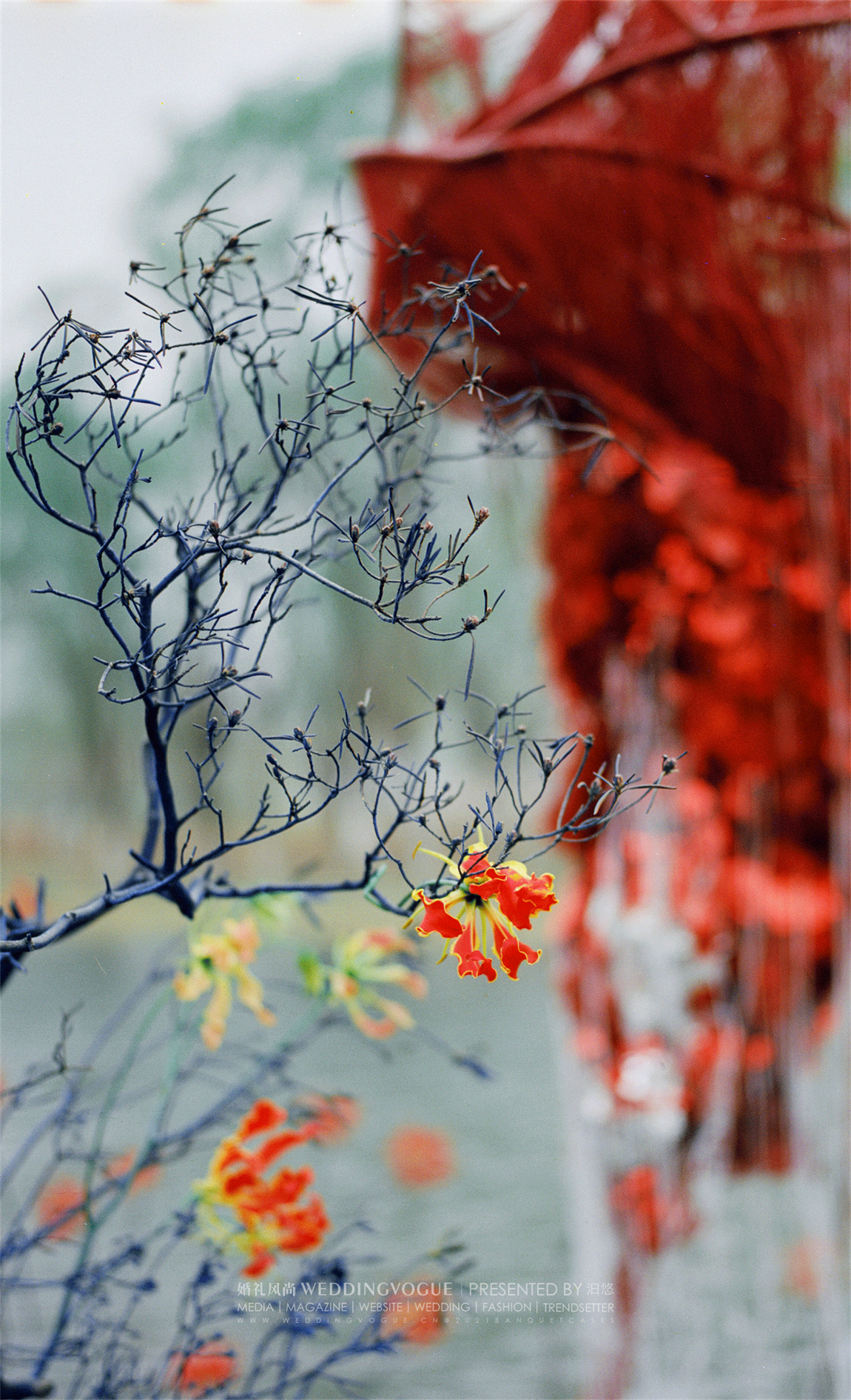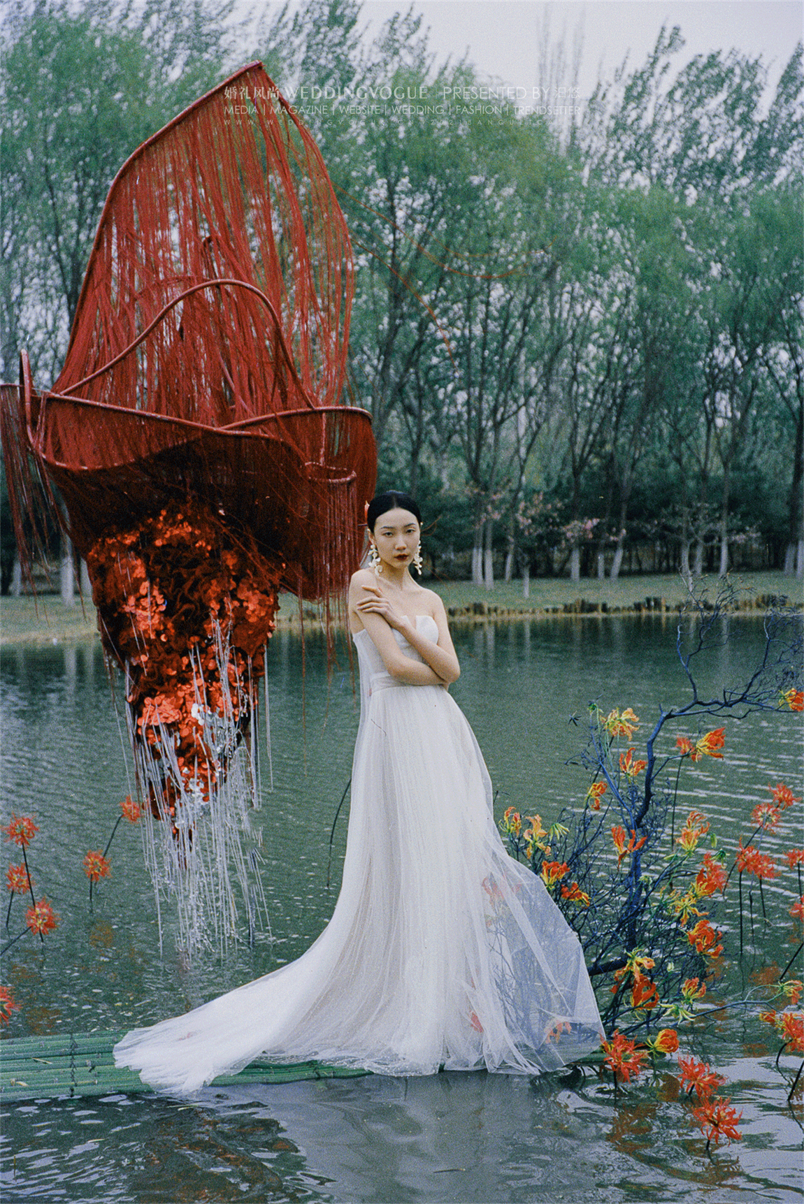 水面之中,选择兼具百合的大气与兰花的优雅的「火焰百合」嘉兰作为花艺装饰。红黄两色的花朵,波浪状向上反卷,如同火焰飞腾,热情洋溢。