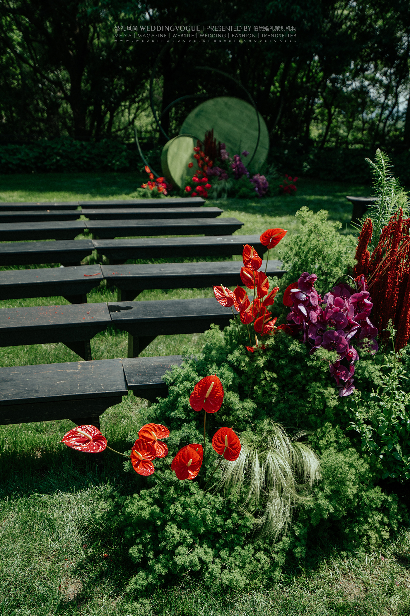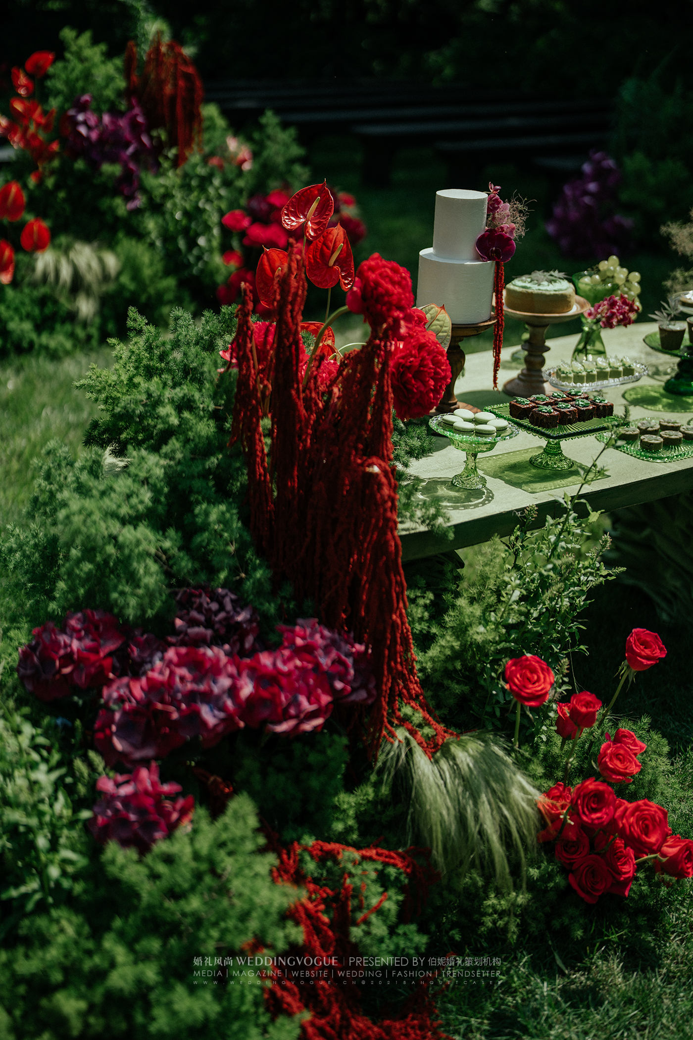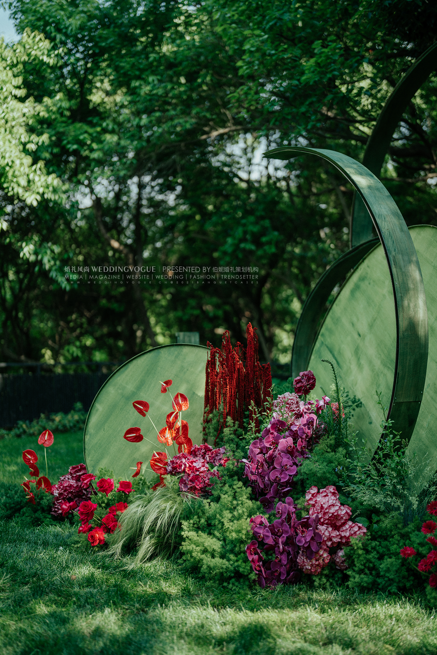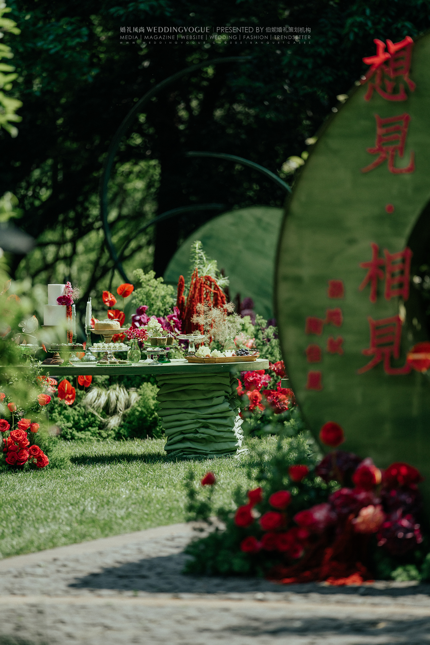 这是一场复古轻中式婚礼,可侘寂,可写意,可人间烟火。浓郁的复古绿与玫红,高饱和度明艳色彩,让人无法忽视它带来的视觉冲击。