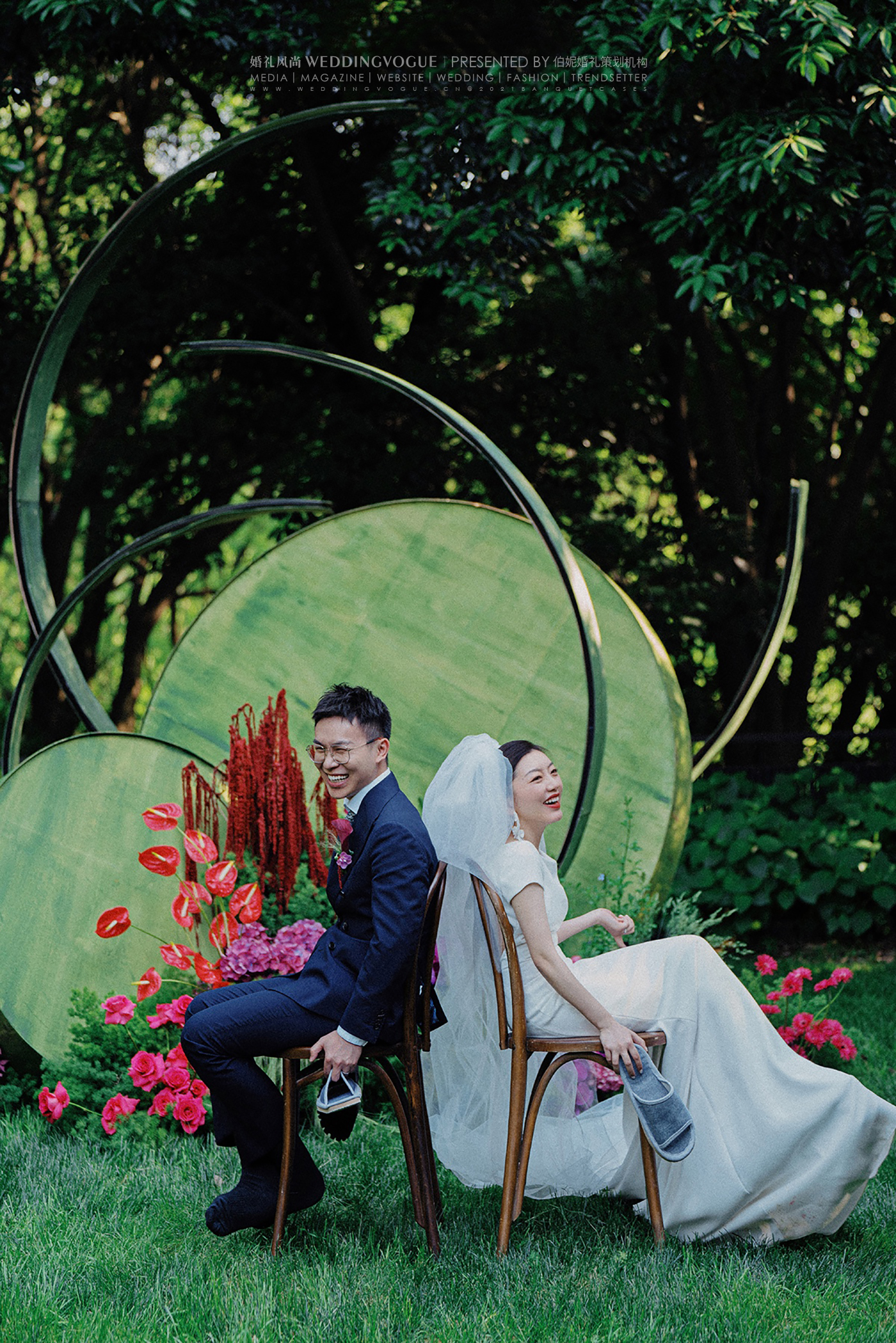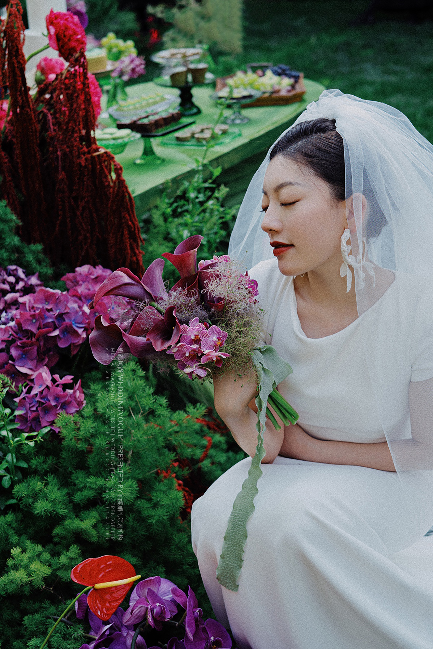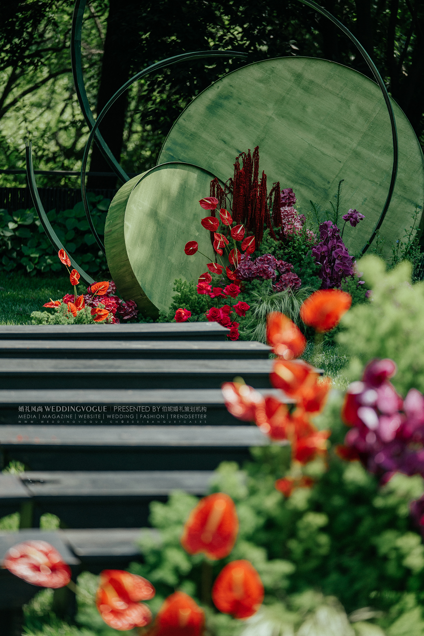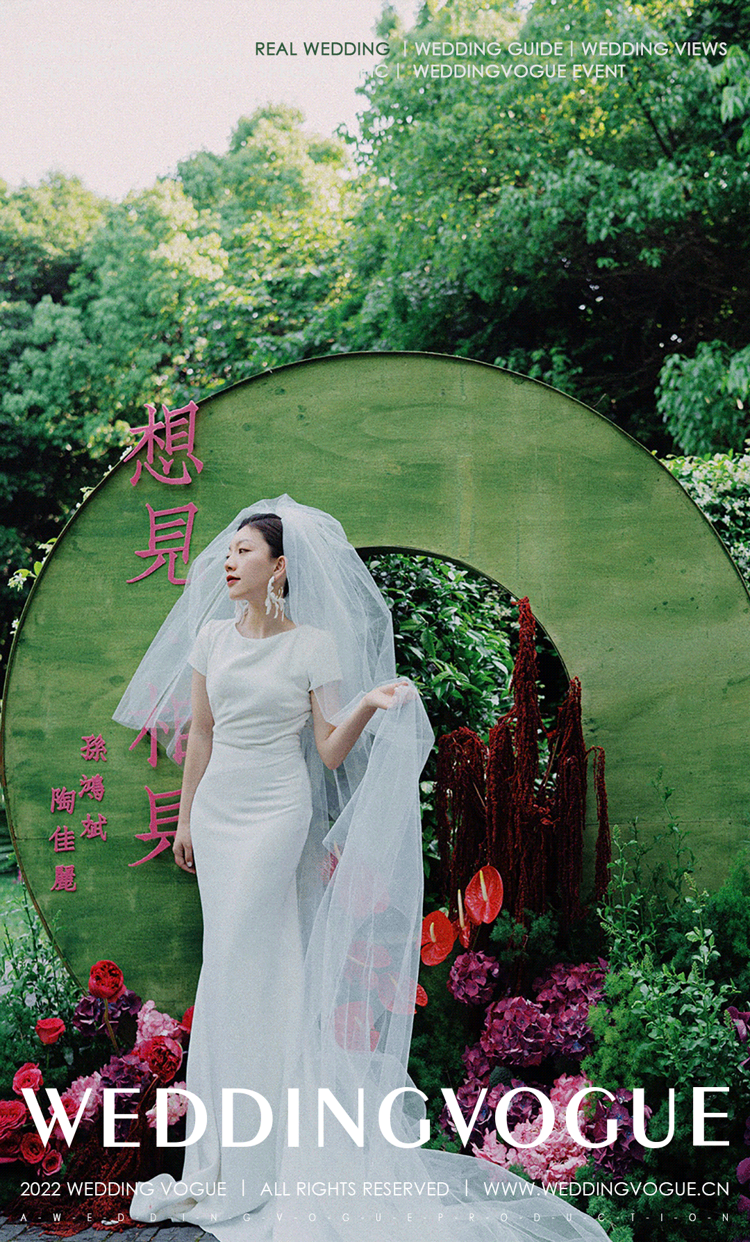 这是一场复古轻中式婚礼,可侘寂,可写意,可人间烟火。浓郁的复古绿与玫红,高饱和度明艳色彩,让人无法忽视它带来的视觉冲击。
