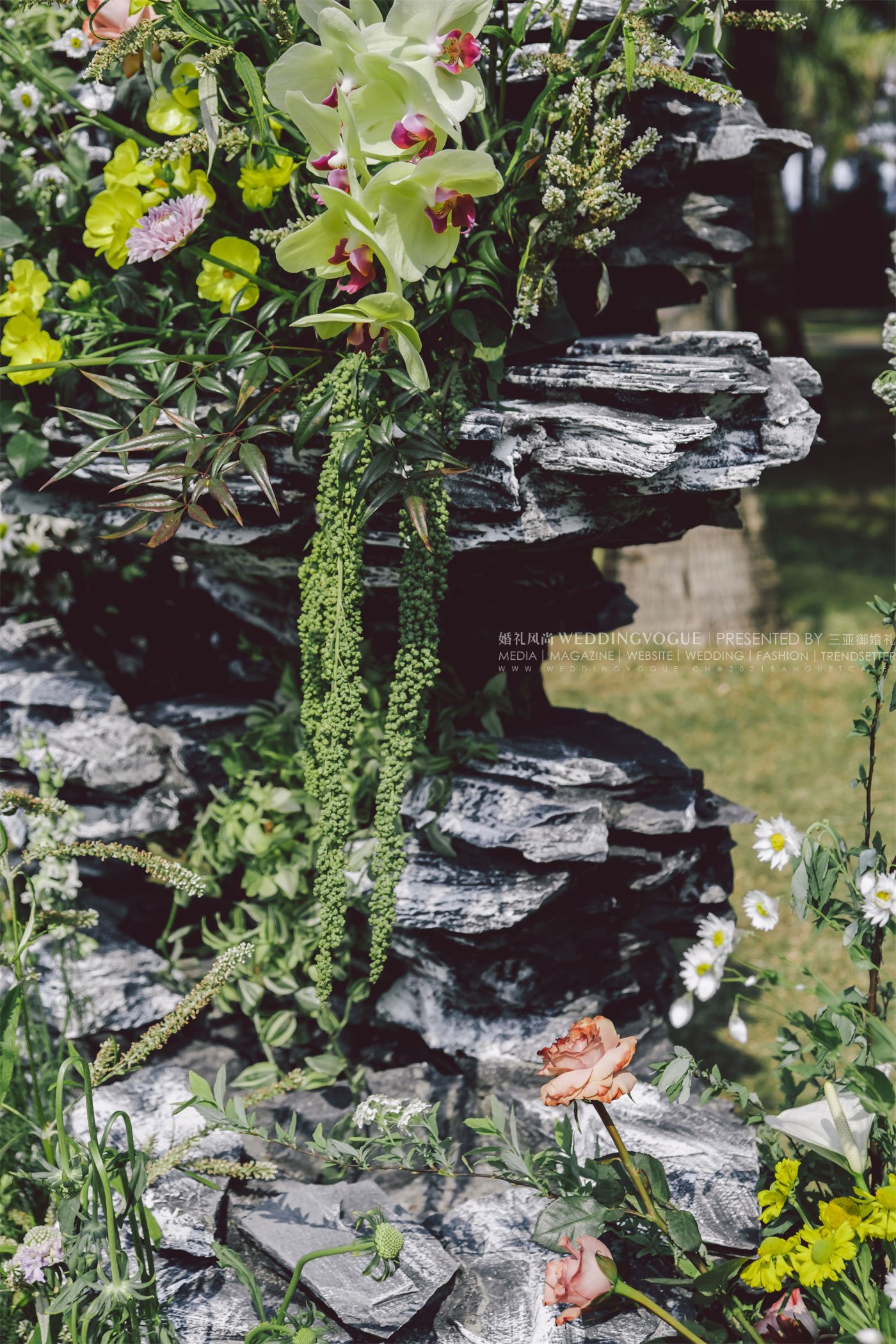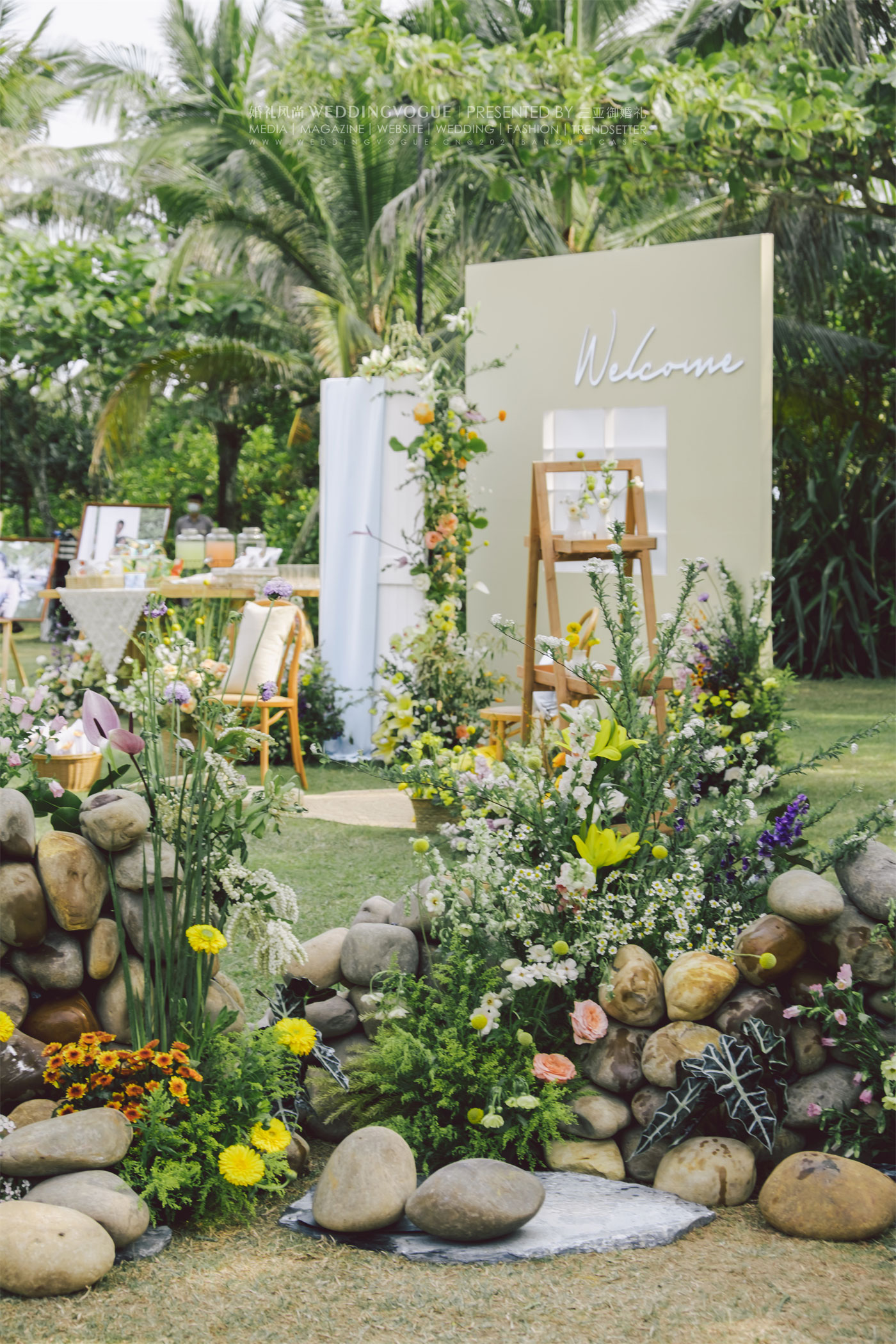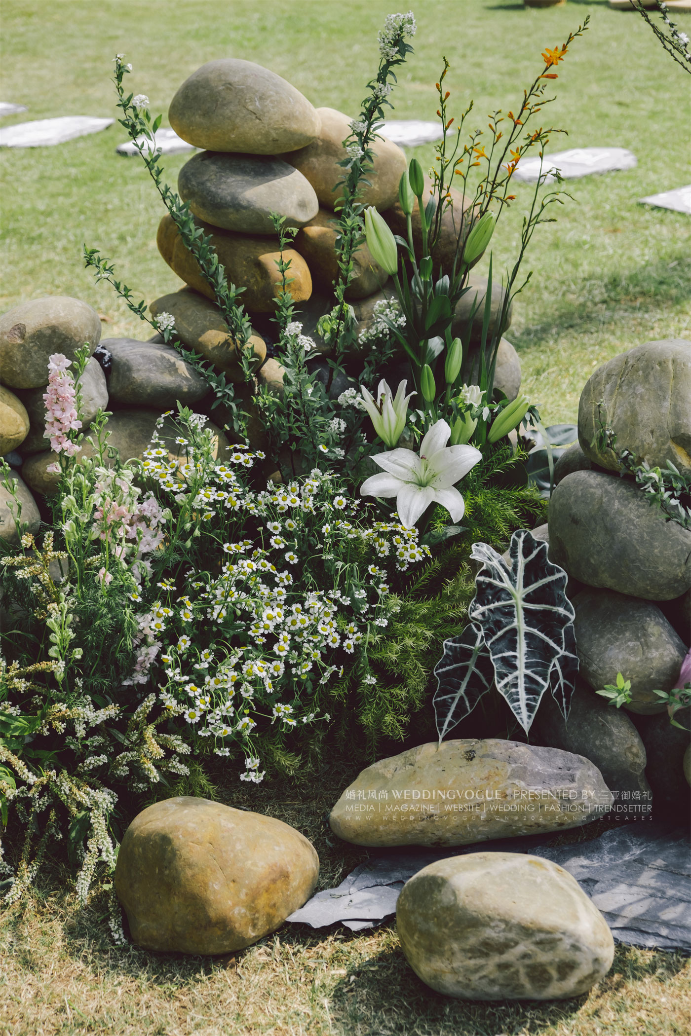 婚礼设计选用了大自然中几乎无处不在的坚硬石头作为主要元素,为一对新人堆砌起了一处专属于他们的海边后花园。