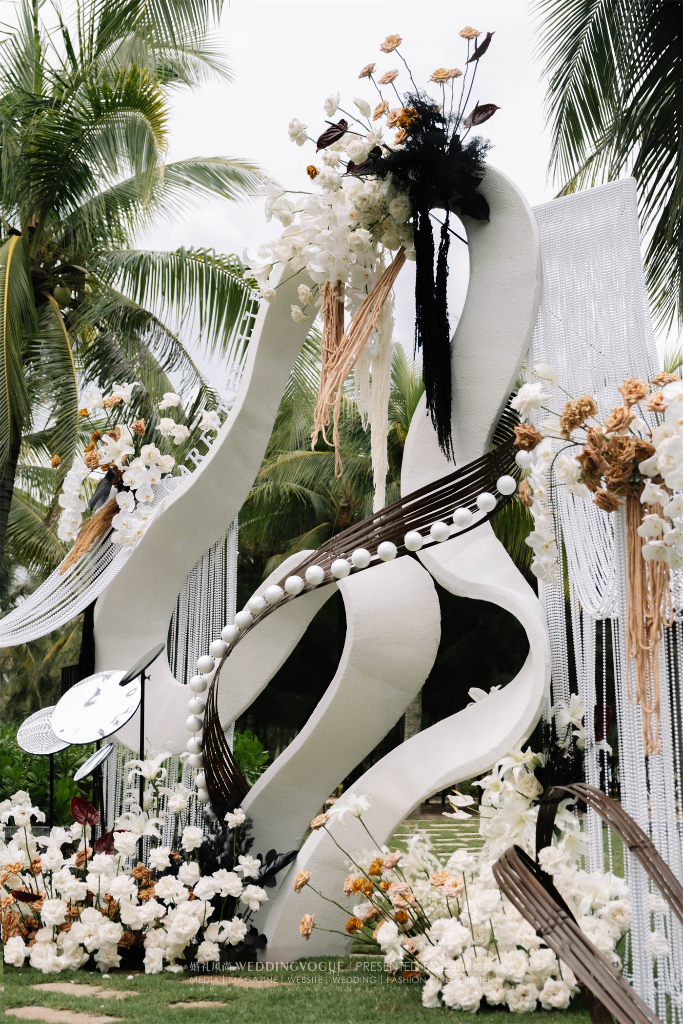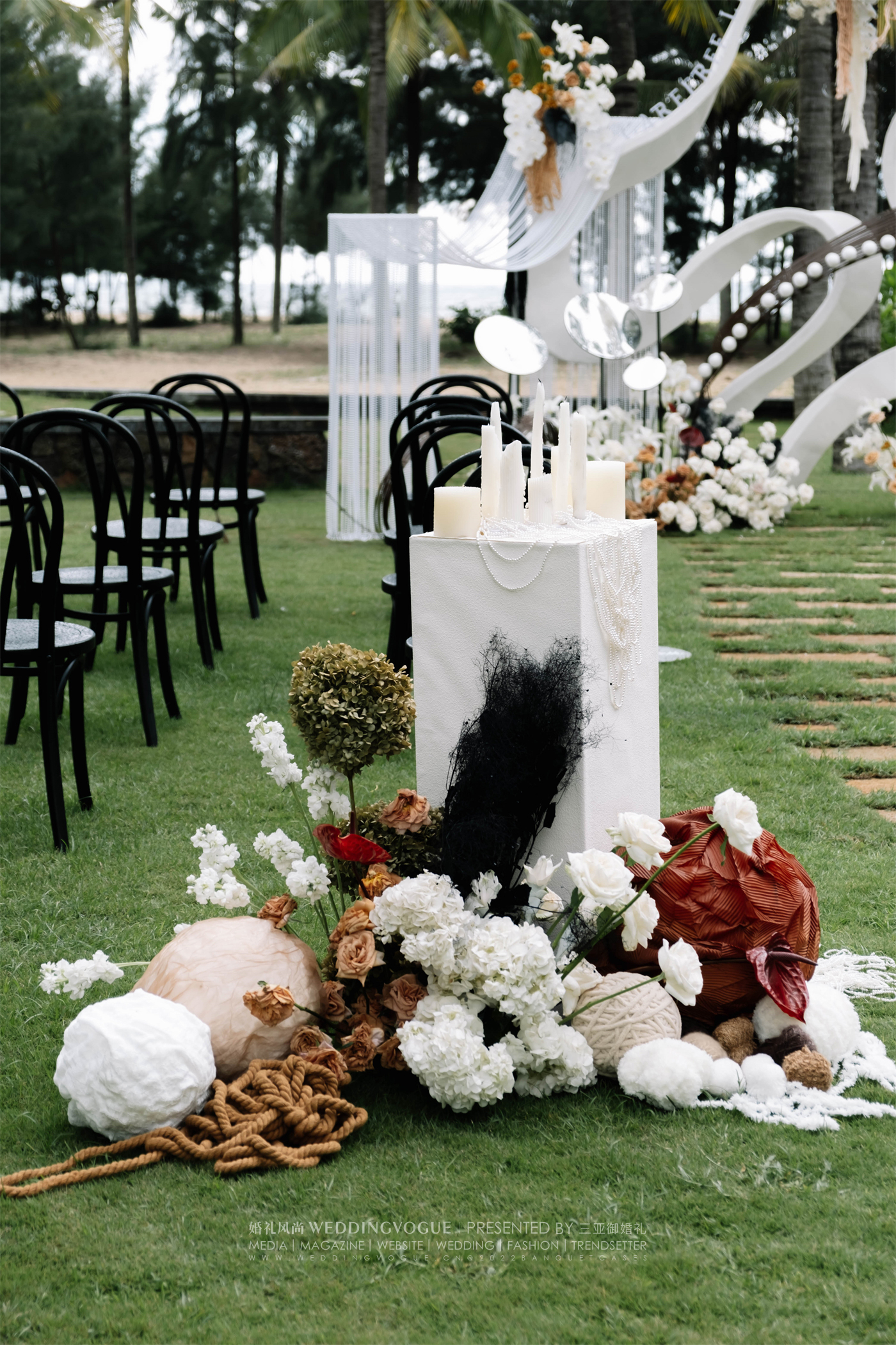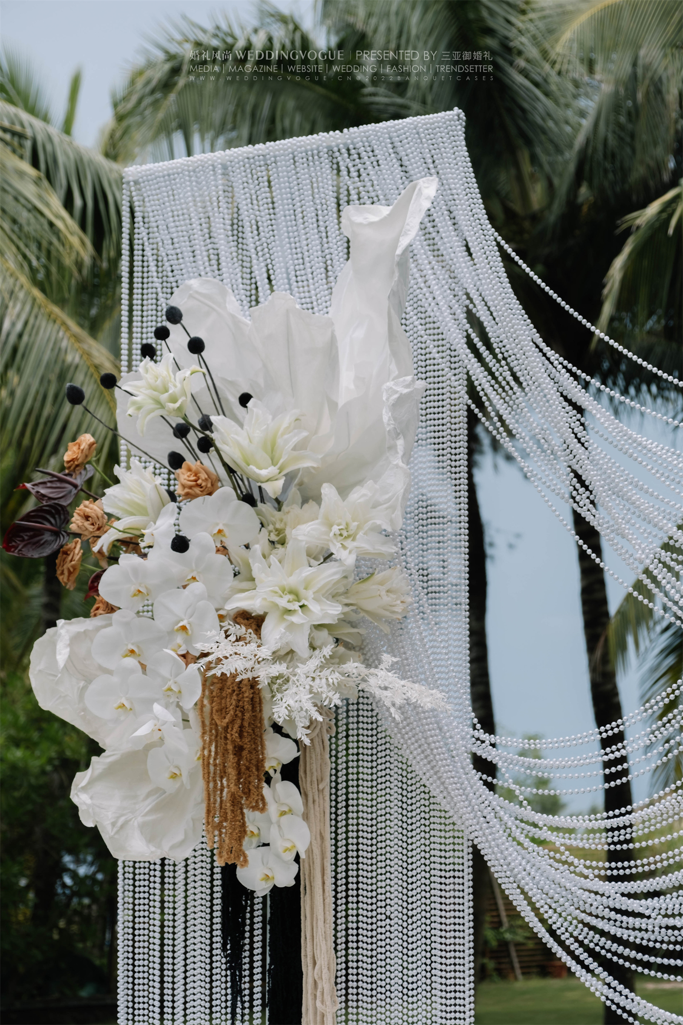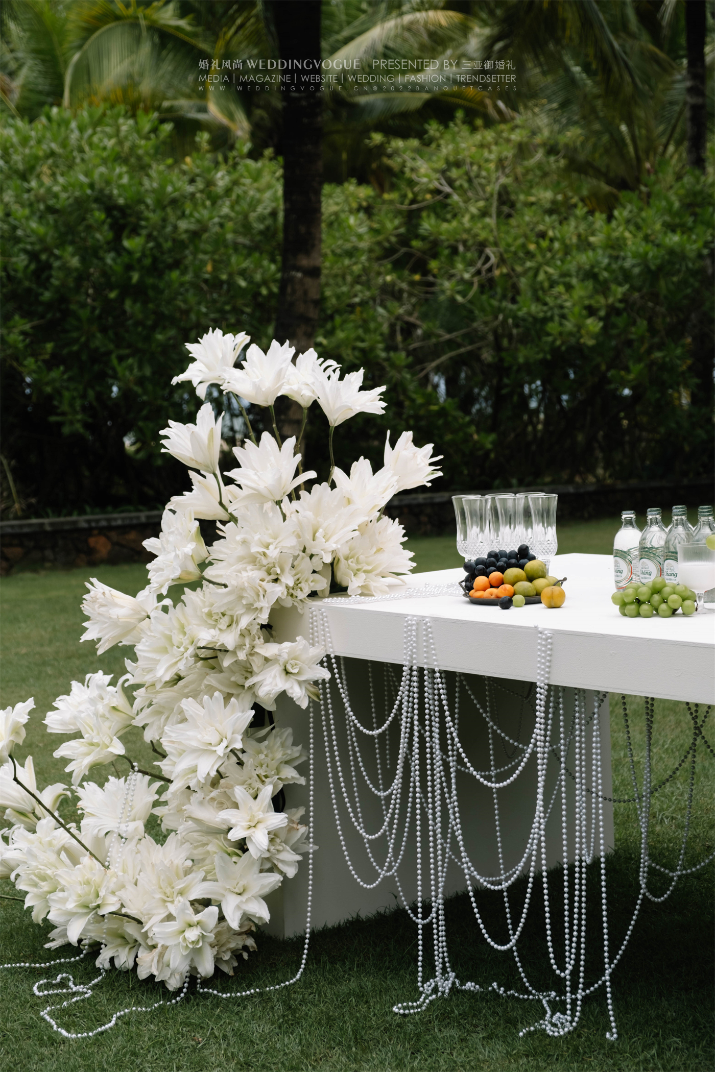设计师通过新人的名字以及他们相处的状态,提取出了这场婚礼的主题“肆意人生”,十万颗珍珠串连出他们肆意的爱。纯洁、高贵的珍珠,是他们彼此珍惜、相互呵护的具象表达。
