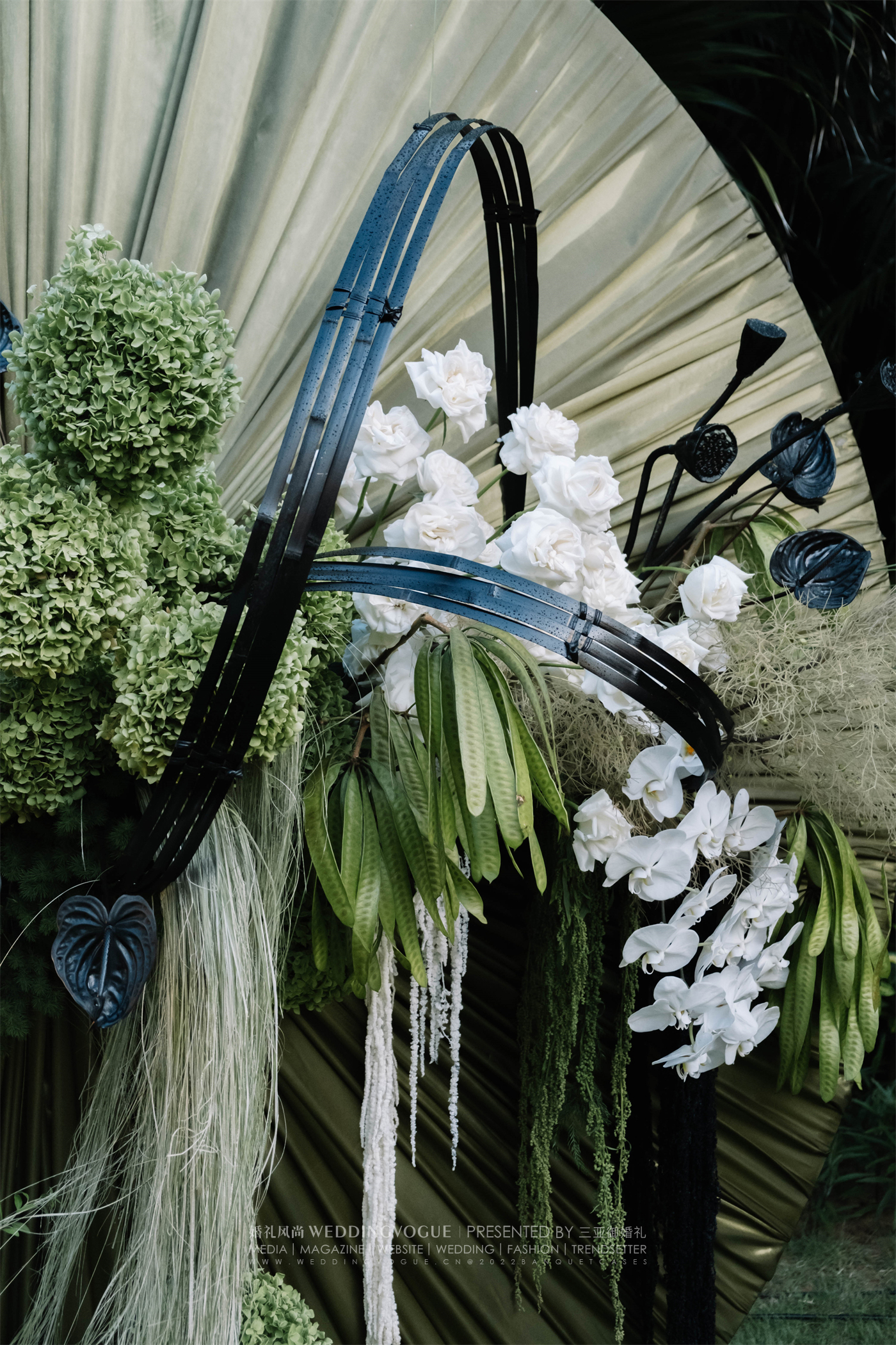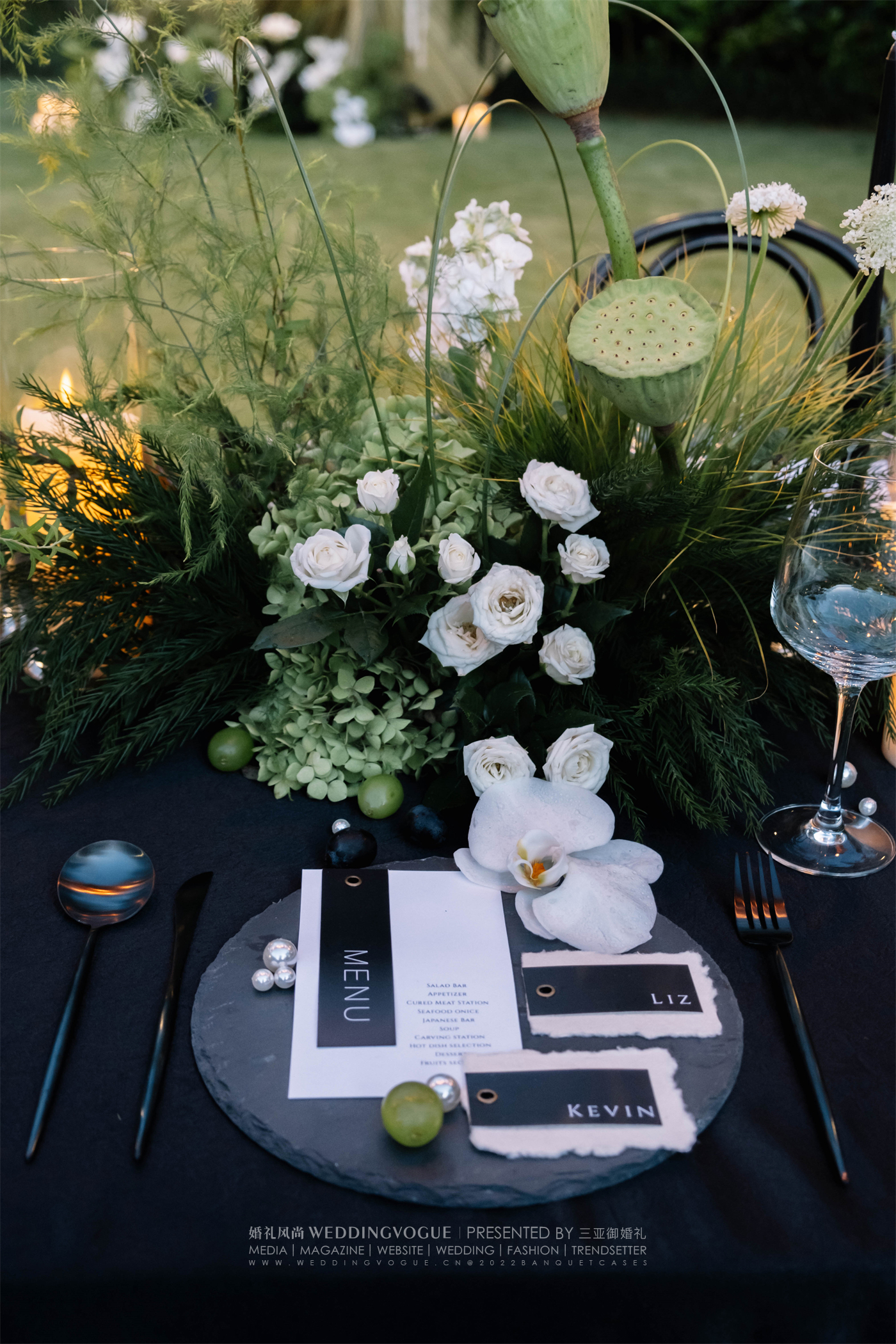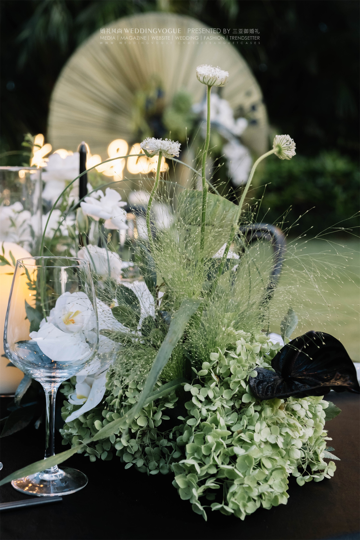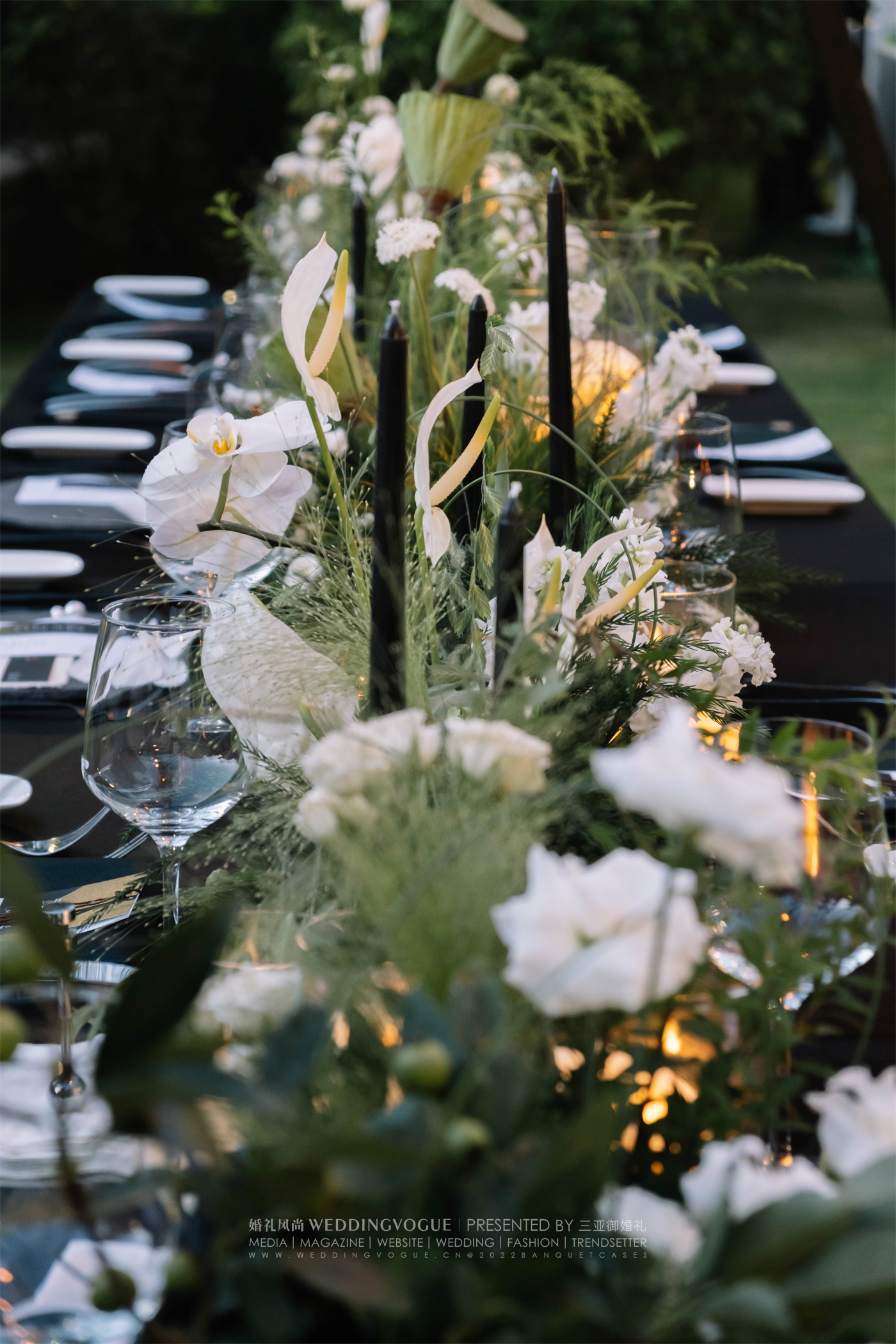 当白绿色配上黑,极致的反差是这场晚宴设计的一大亮色。色彩冲击着视觉神经,也见证着天色的变化,由昼入夜,由自然的光进入灯火的亮。