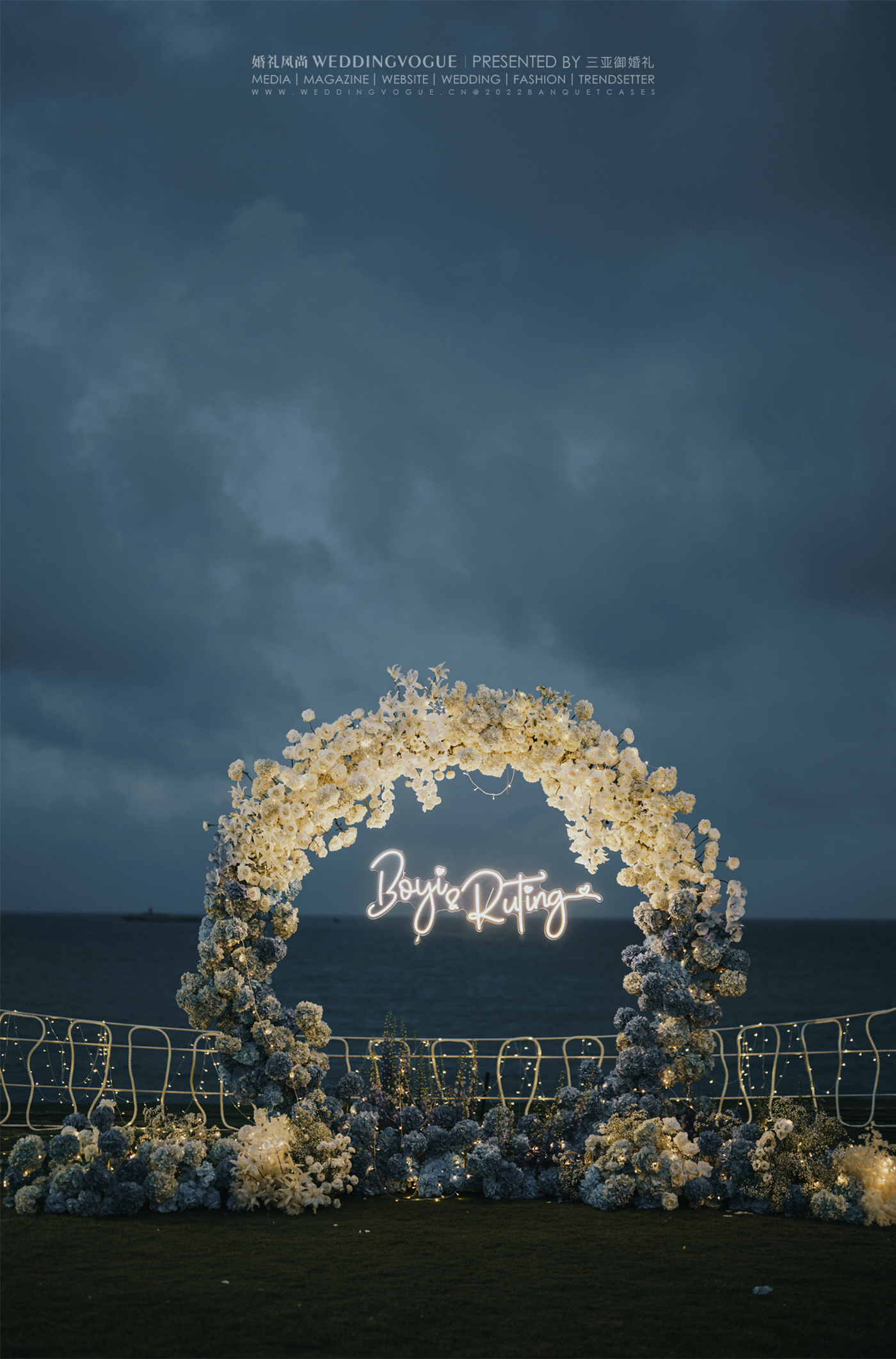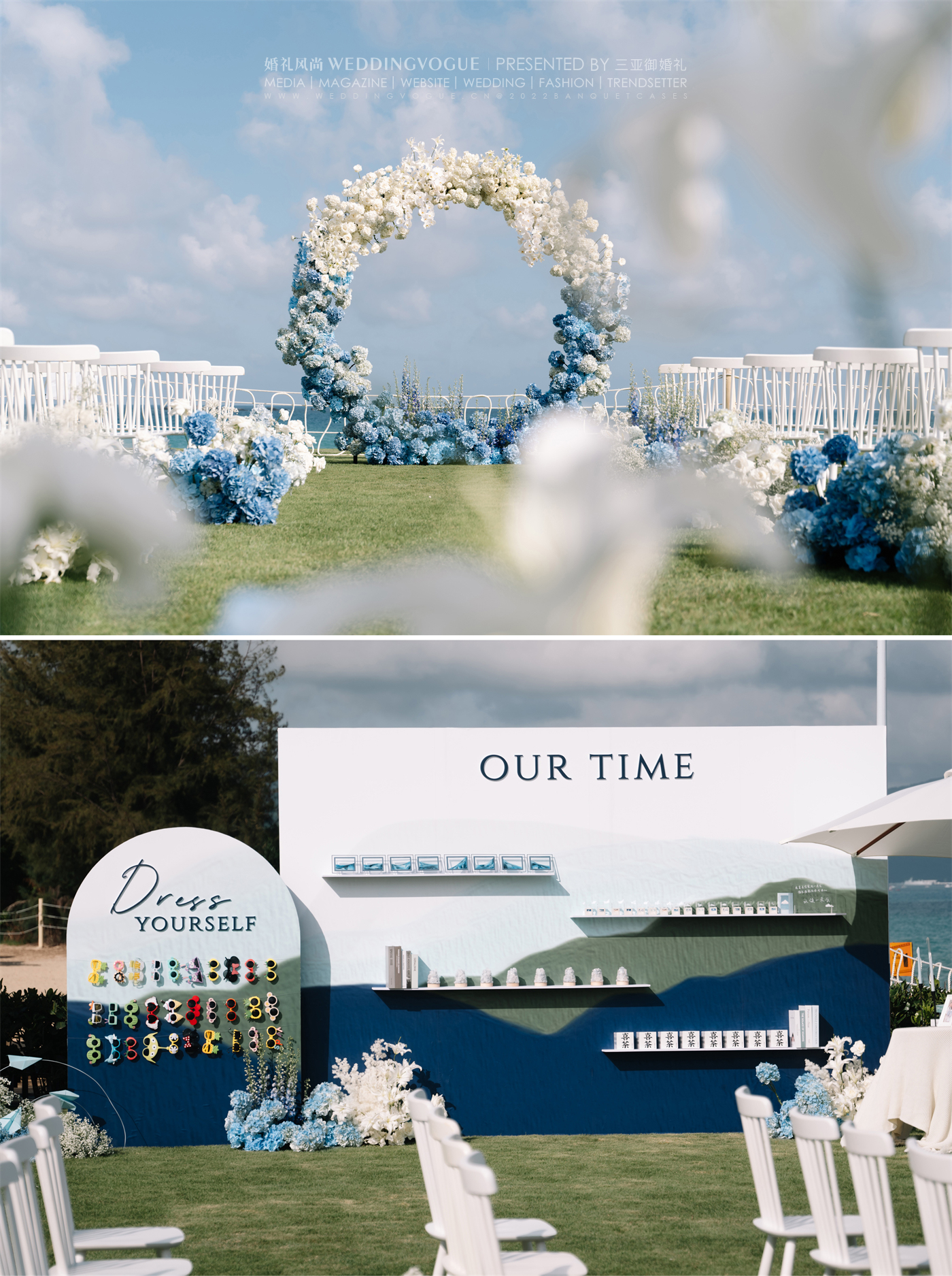 设计师提取自然界最浪漫清新的“天空蓝”为婚礼色调,在大海天空的背景之下以山海、海浪为主体,再配合以单一的蓝白绣球花,使得婚礼场景与自然之景和谐地融合,并营造出干净轻盈的效果。