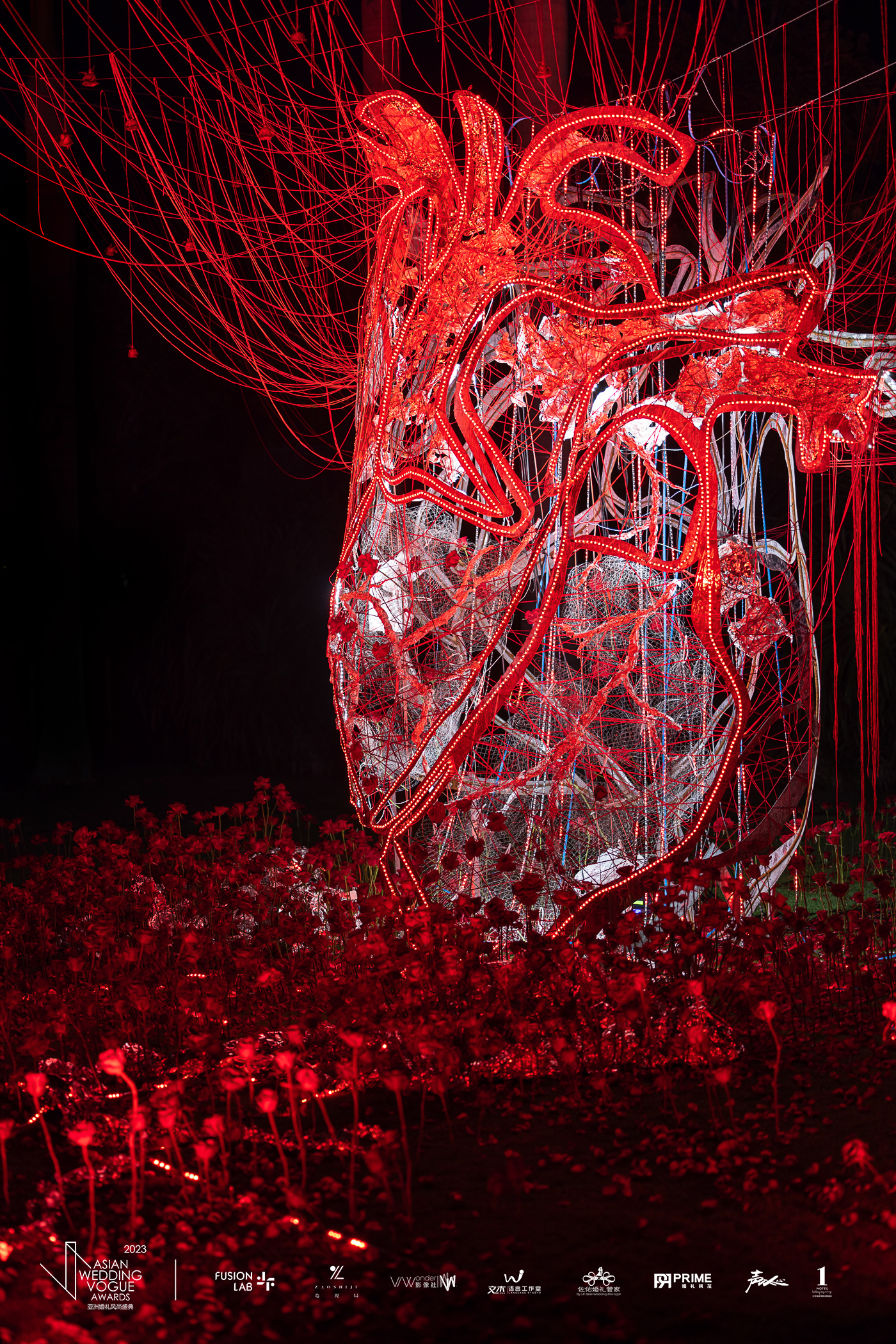 硬冷的钢铁线条组成了心脏最初的肌肉和筋脉,以炽红的花艺装点其间,不仅柔化了钢铁材质心脏的外型,更如同血液中的分子,似花朵般由静指动,象征着生命的蓬勃生长。