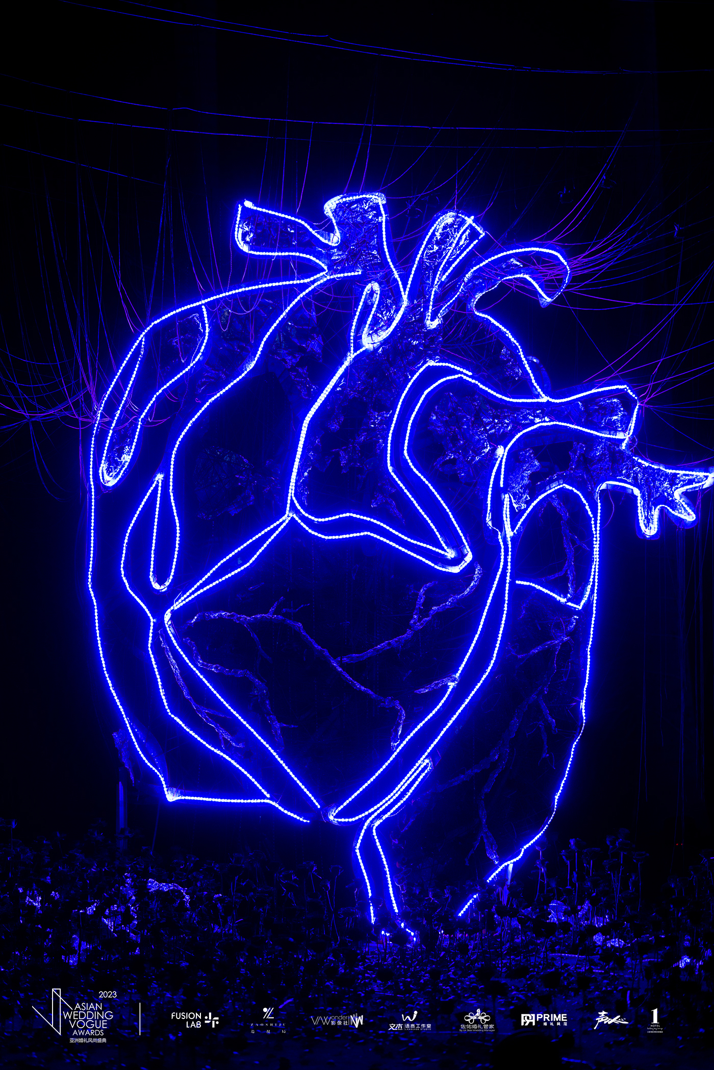他们用编程灯带缠绕在钢铁心脏的外沿,模拟出殷红血管的意向。