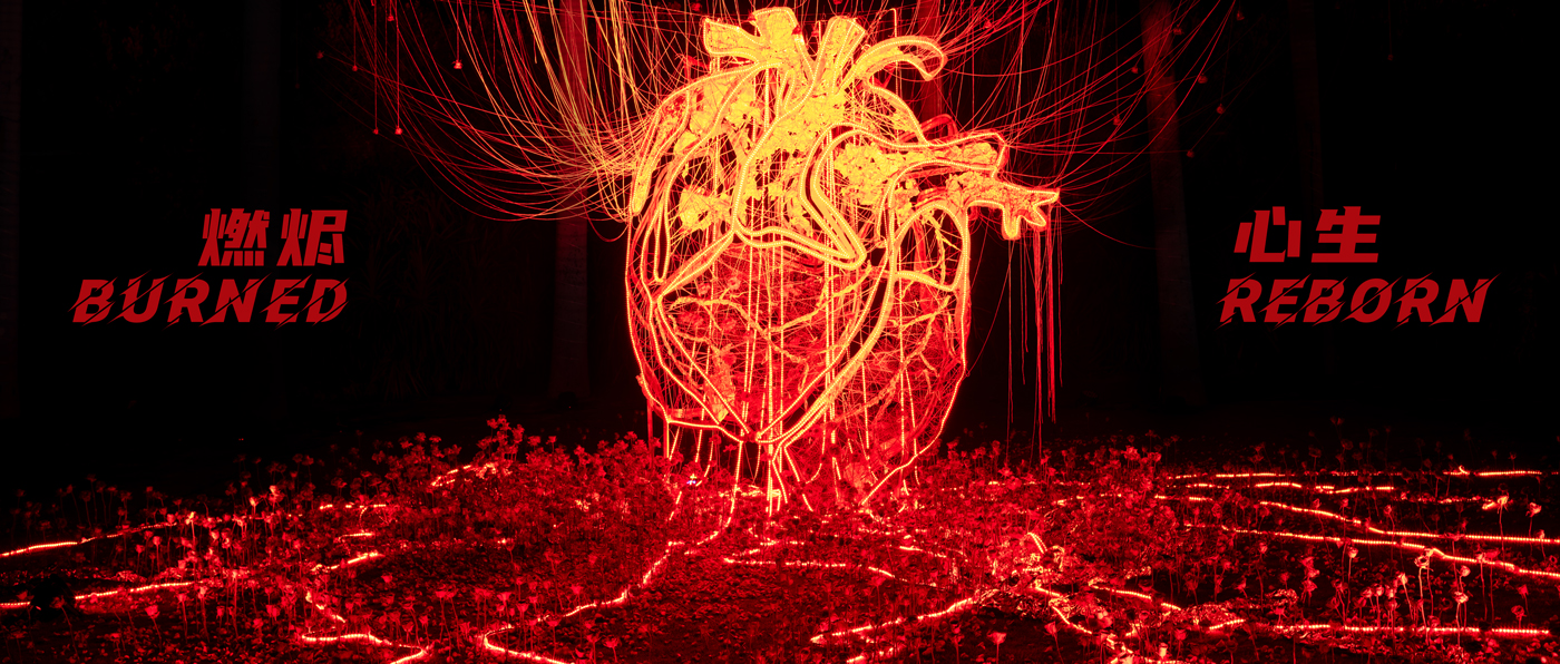 如奔腾的岩浆,流动的血脉,燃动的心脏下方延伸出红色的河道,沿岸鲜花丛生。寓意着心脏随着升温燃烧,发光发热留下的不是灰烬,而是一派盎然的新生景象。