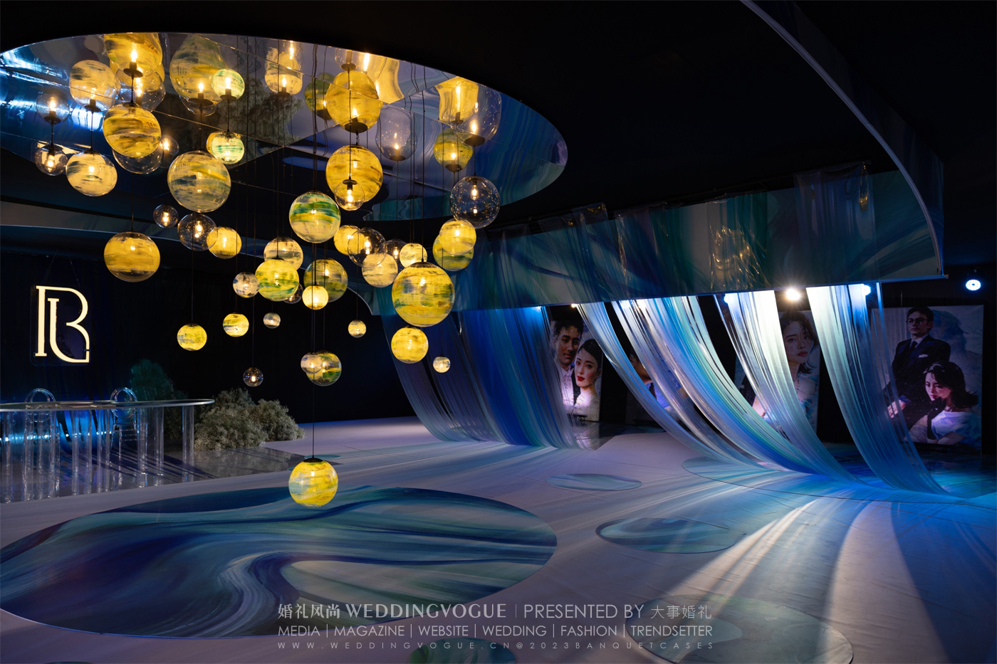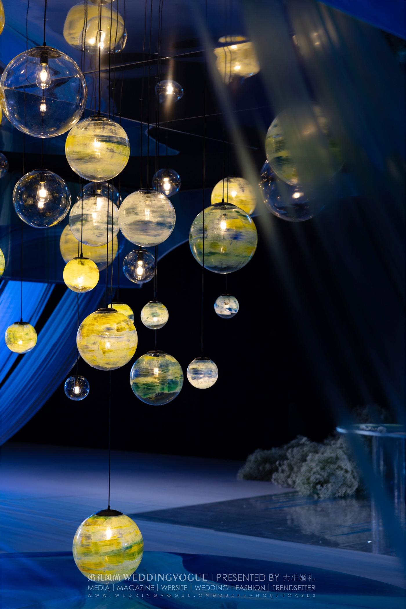迎宾区中心视觉位置一颗颗大大小小发光的星球,也是现场诸多宾客特别喜欢拍照的地方。
