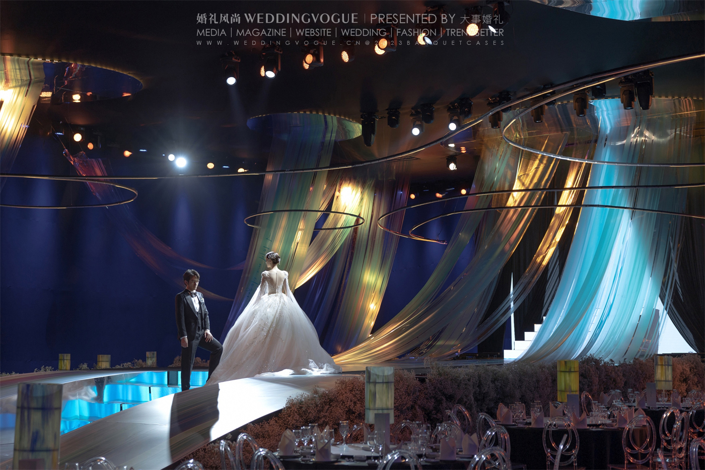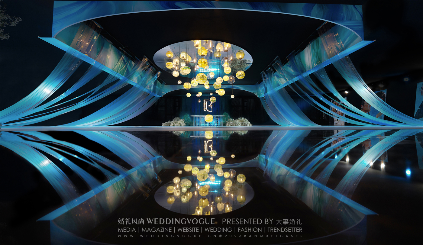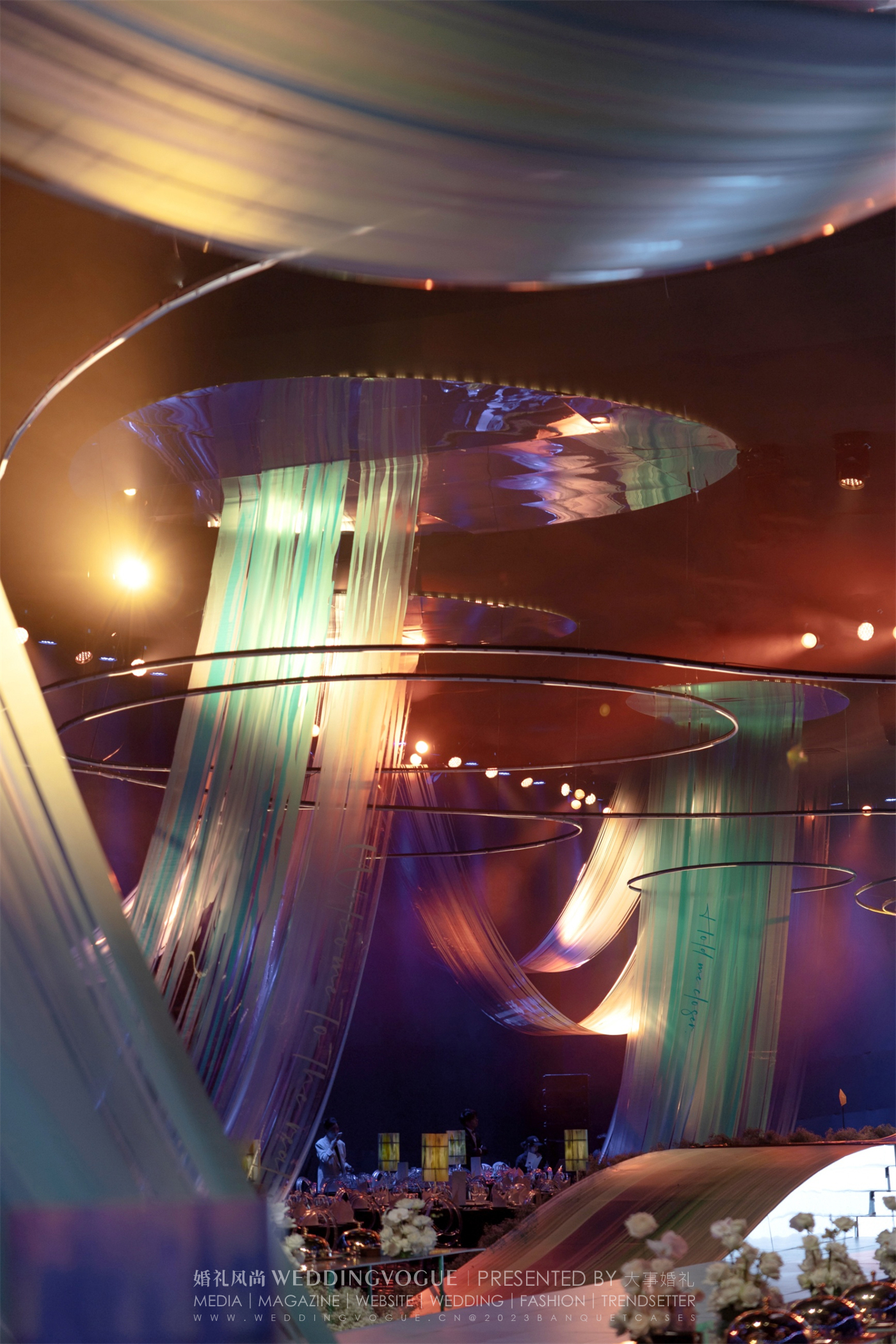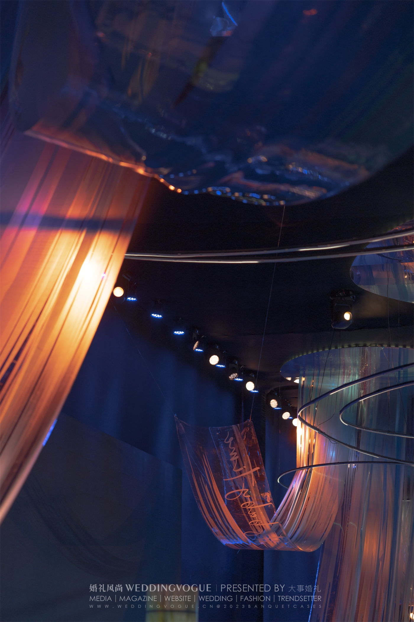 除了光影的变化之外,宴会厅顶部无限延伸的曲线和多维度的镜面,象征着两位新人不同的人生轨迹的交织。