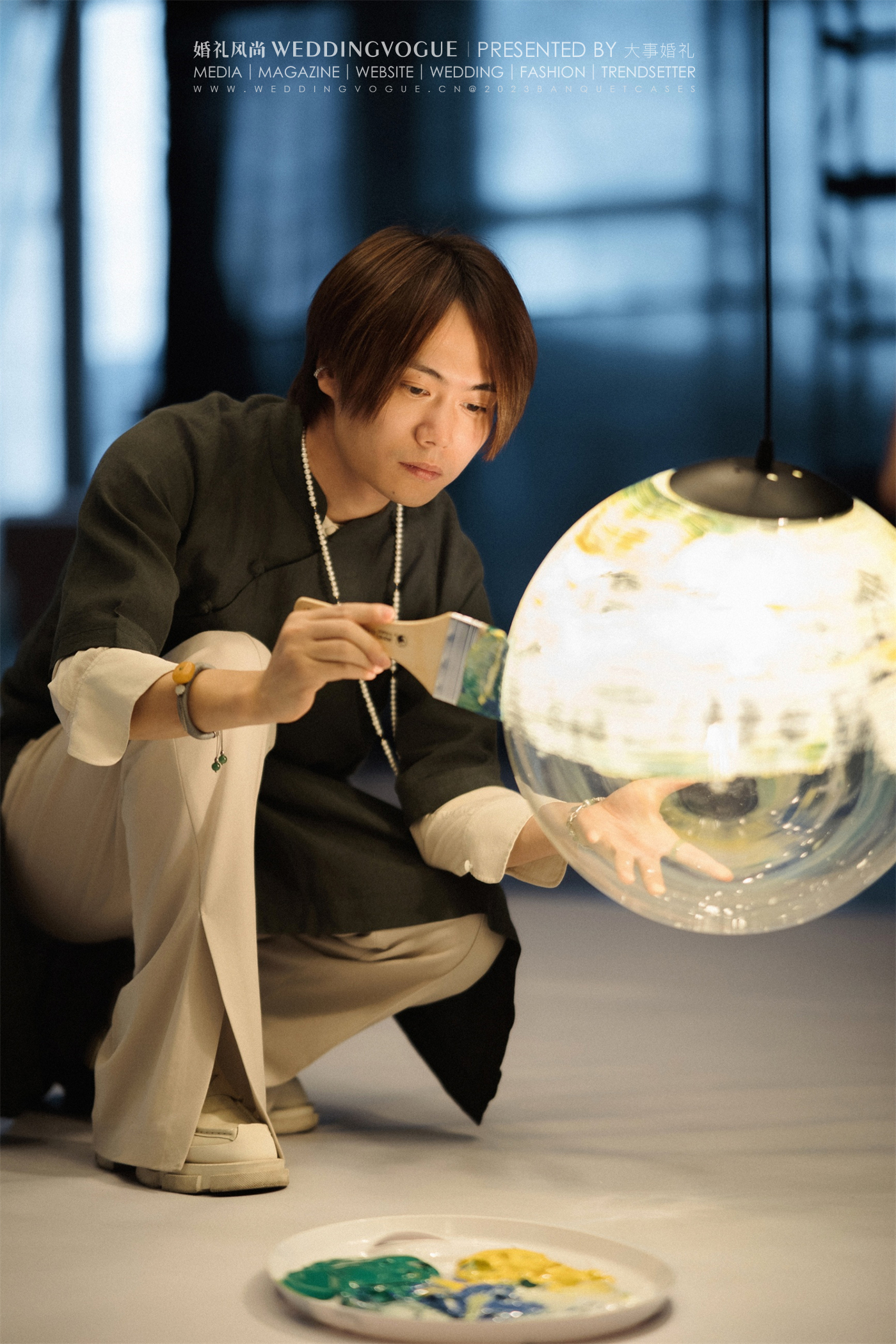除此之外,整场婚礼的每一盏桌灯也是由赖教授在现场手工亲制画作完成。从下午时分的天光大亮到黑夜降临,赖教授一直到画完所有的桌灯。