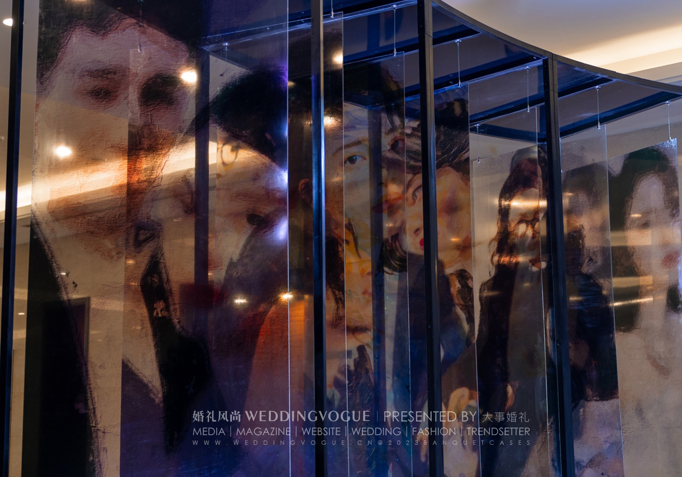 区别与传统的KT板印制的新人结婚照片,这场婚礼在迎宾区最前端,通过抽象油画质感的透明照片,组合而成的屏风,悬挂垂吊排列。通透的质感和独特的造型,给现场来宾带来与众不同的惊艳之感。