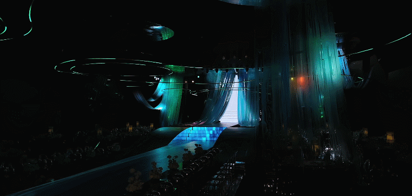 整场的灯光,使用深色,可以体现光的质感,另外,现场大面积单一的通透材质,让灯光有了更好的穿透力。