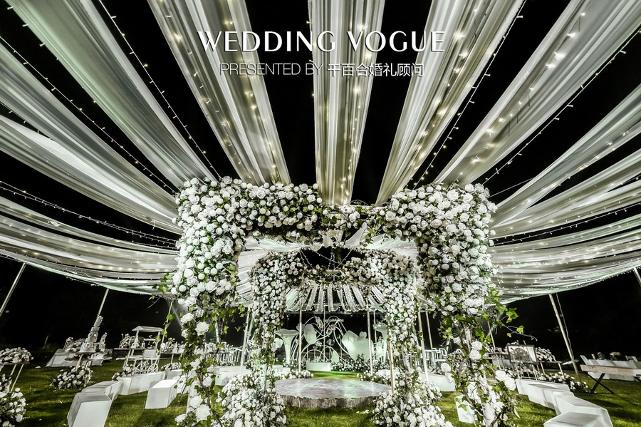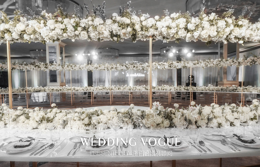 千百合定制的弧形西式餐桌与中心舞池的呈现,俯瞰是“世界之眼”,而正面看亦是两颗心的交汇与包容,仅以简约的白色系表达,一如爱情的干净澄澈。