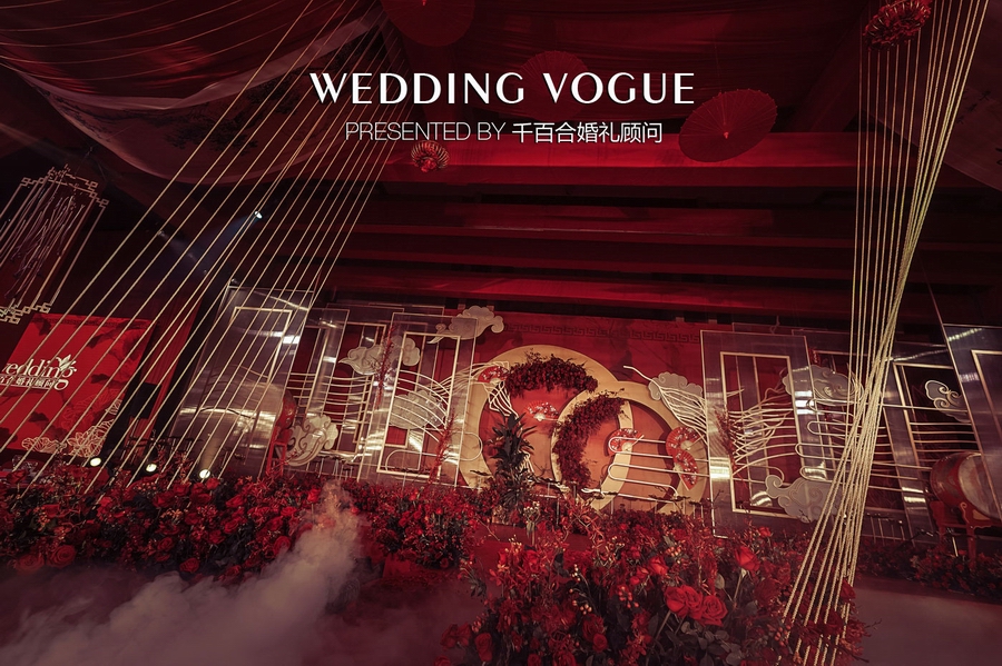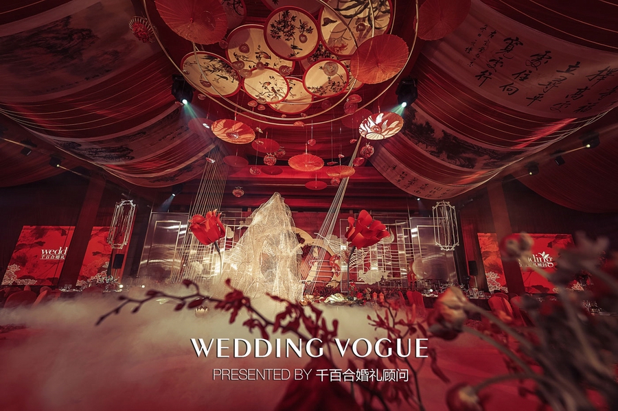 以铁艺铸造的“祥云”,有龙凤呈祥之意,而古老的中国传统工艺品大红灯笼的使用,将婚礼的整体氛围又增添了几分仪式感;而流线型灯带,不仅中和了色彩的层次感,还为现场带去现代元素,为中式风格赋予现代的新内涵,最后呈现出的是一场立体的、含蓄的、随意的,但又像是穿越了千年的美。