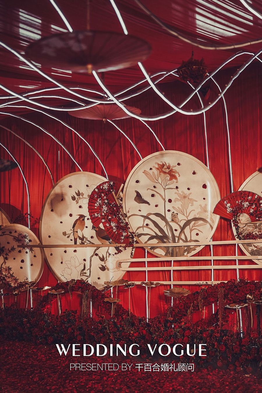整场以“荷”为主题,以中国红为主色调,将荷花、荷叶等花艺材料与异形圆舞台做拼接,体现了合的大背景;而屏风则作为一种灵活的空间元素,通过自身形状、色彩、质地、图案等软装设计融于丰富多元的空间环境,演绎特有的中国味道。