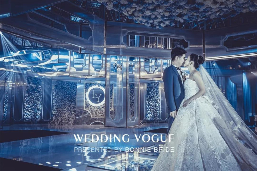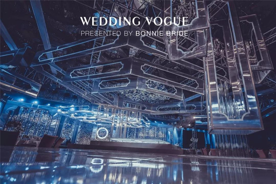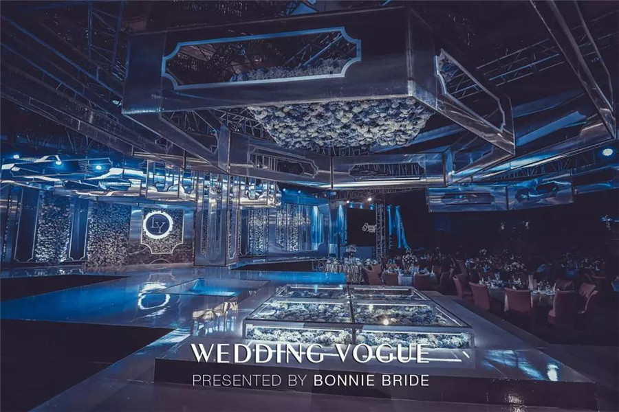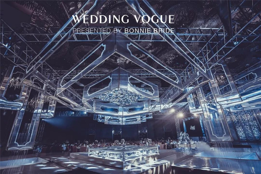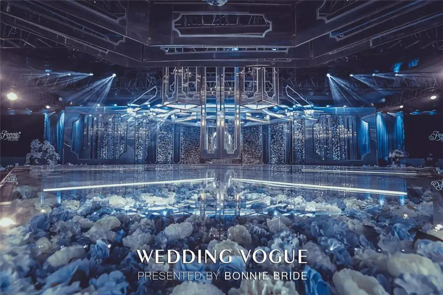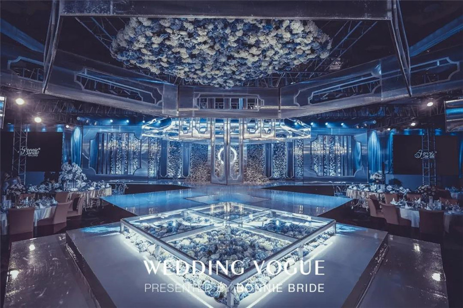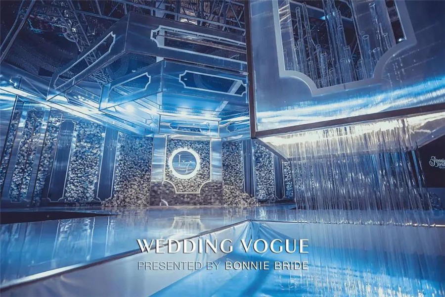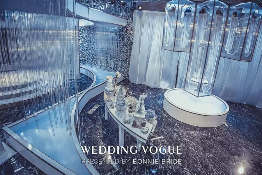 错落有致的T台延展到了整个宴会厅,光线透过水晶洒入三个许愿池里,折射出了灵动的样子。位于T太中央的仪式区铺满了鲜花,新人站立其中,说出爱的誓言。