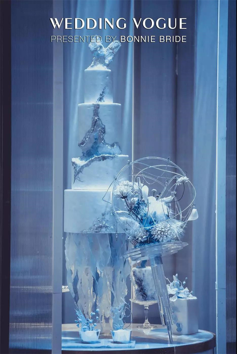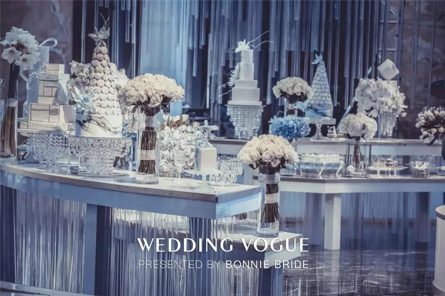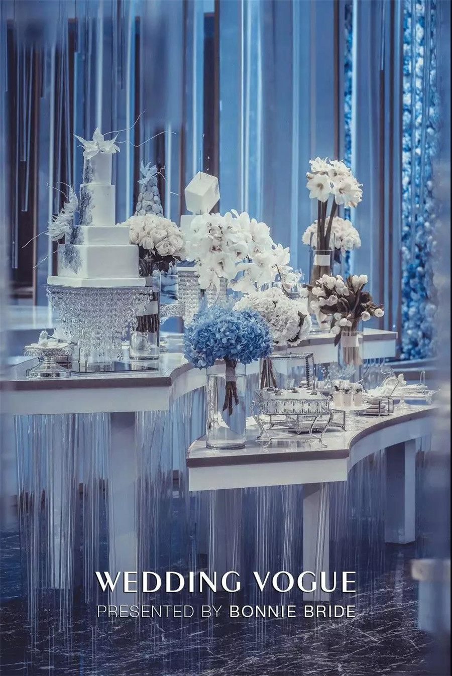 三角形代表稳定、圆形表示完满,所以四座许愿池都是由三角和圆形组成。用错落的水晶柱代替以往呆板的桌角,让整个甜品台都仿佛悬于空中。浅蓝色的马卡龙和翻糖蛋糕在大大小小不规则弧线形设计的甜品桌上恰到好处的存在着。
