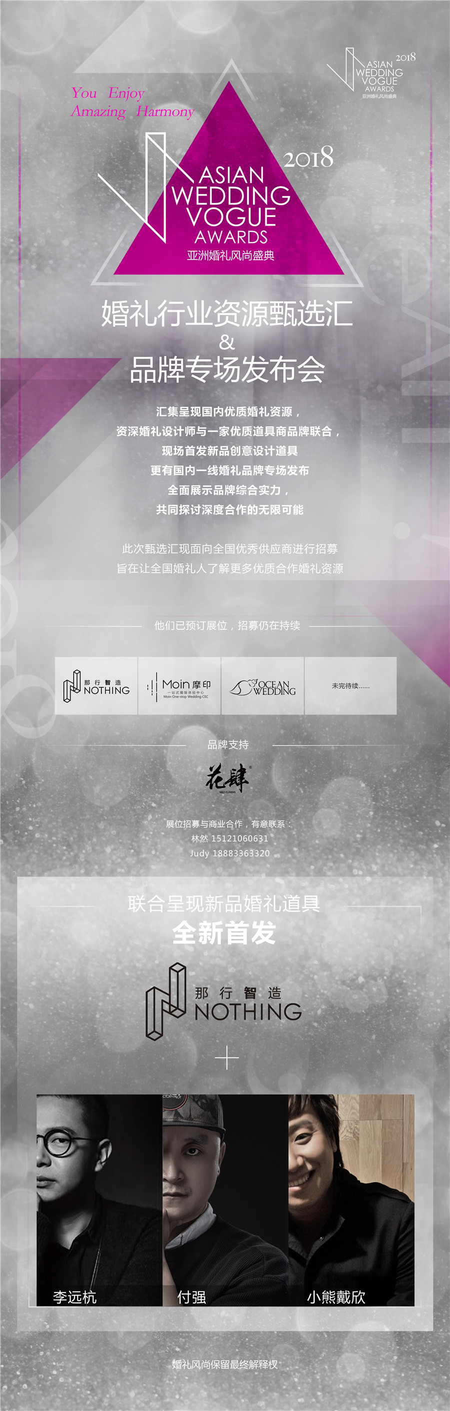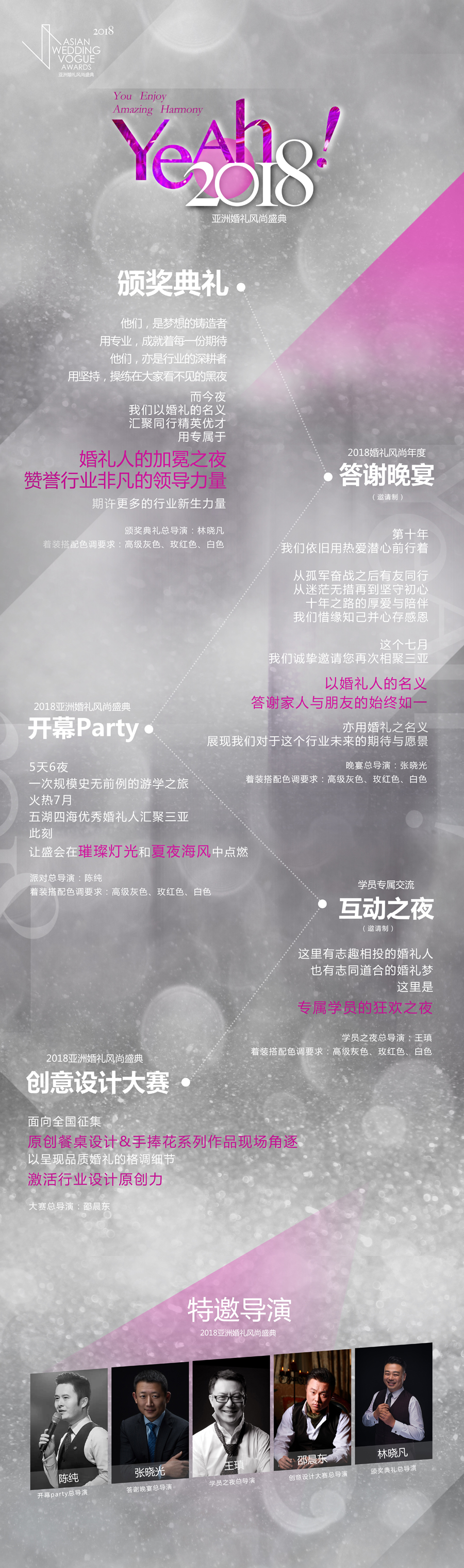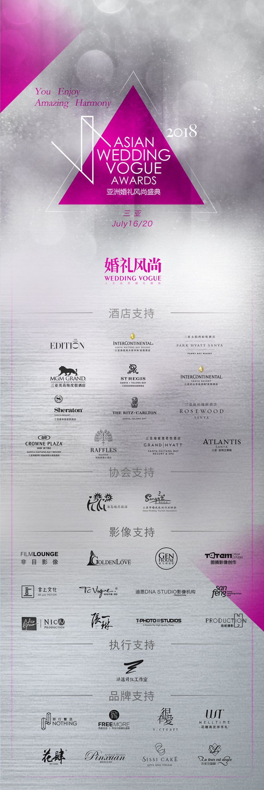 相较于去年,2018亚洲婚礼风尚盛典将汇集国内更多一线婚礼人、婚礼机构以及供应商资源。旨在进一步推进行业资源整合,以缤纷的原创实力,展现并倡导婚礼行业始终活跃的新兴姿态。亦希望通过更多元的盛典形式与内容,探讨关于未来婚礼行业的健康发展形态,激活目的地婚礼生态,共同呈现婚礼行业的更多可能!