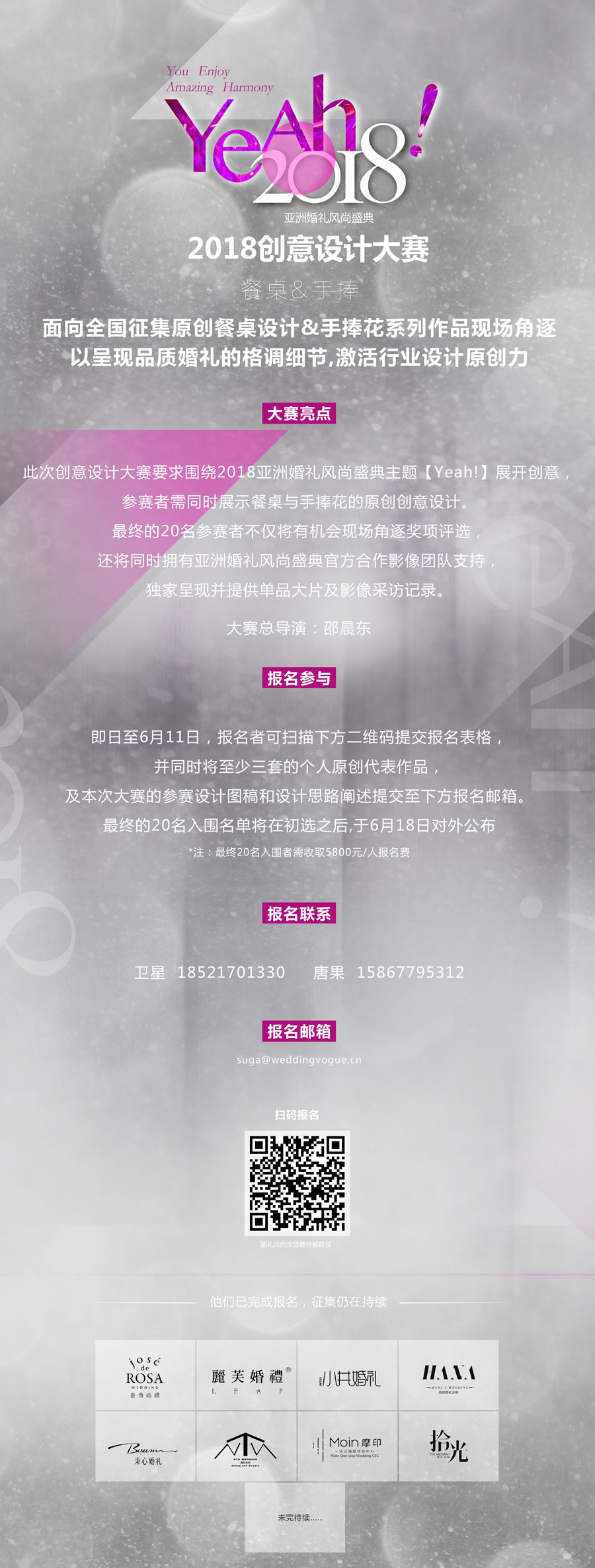 此次创意设计大赛将要求围绕2018亚洲婚礼风尚盛典主题【Yeah!】展开创意,参赛者需同时发布展示餐桌与手捧花的系列原创创意设计,餐桌形式不限。