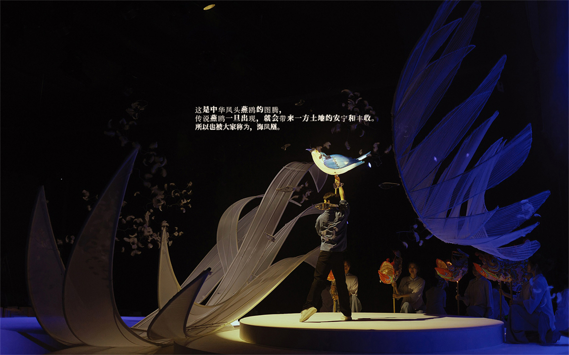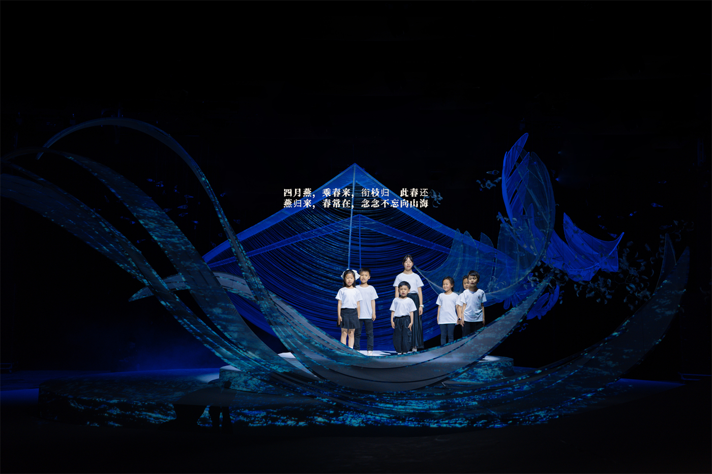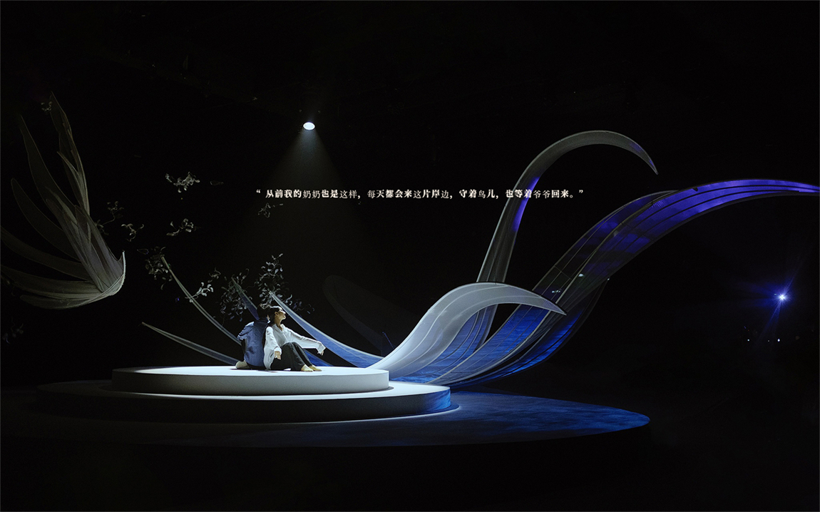 主舞台以“万鸟腾空”为意象,巨型羽翼装置在灯光下舒展,似雏鸟初啼、似候鸟归巢,呼应着东海潮汐的呼吸。
