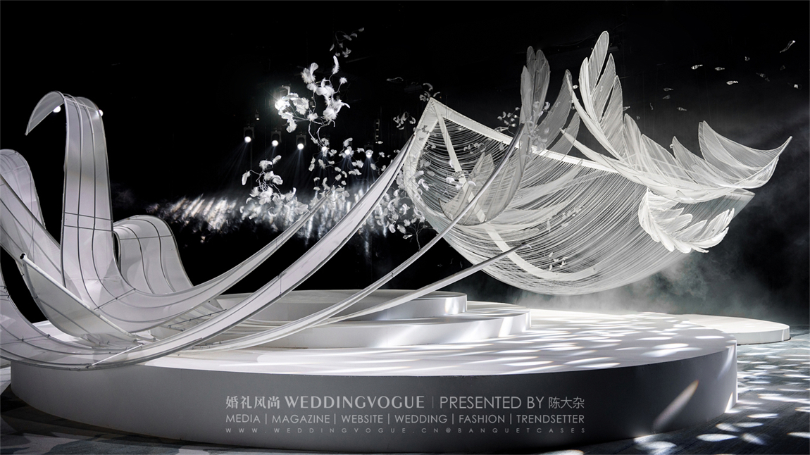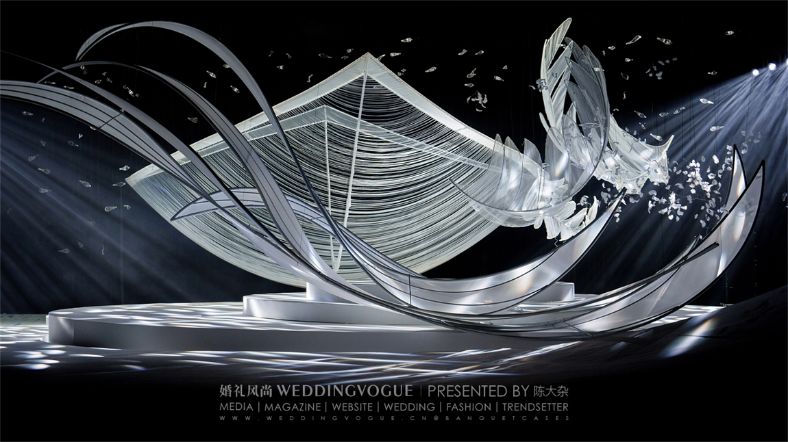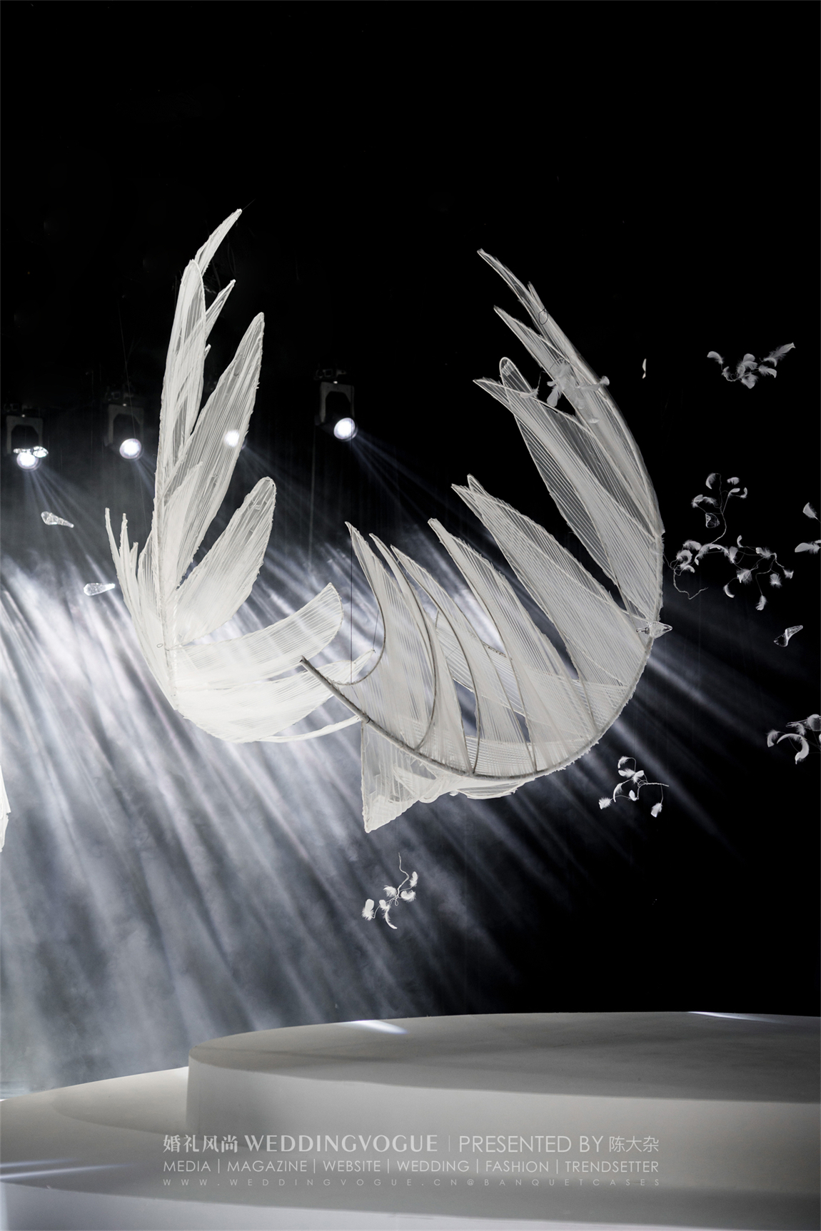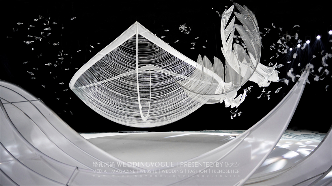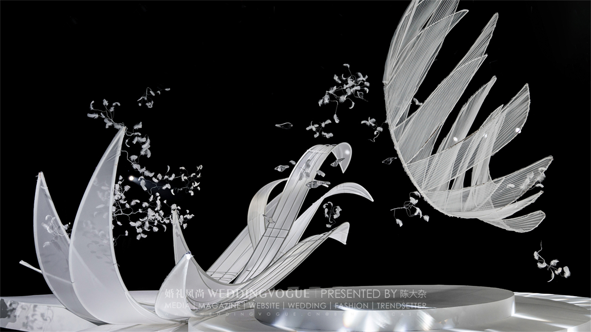 陈大杂的设计灵感源自纪录片《迁徙的鸟》,他将舟山群岛——中华凤头燕鸥的珍贵栖息地化作婚礼秀的底色。