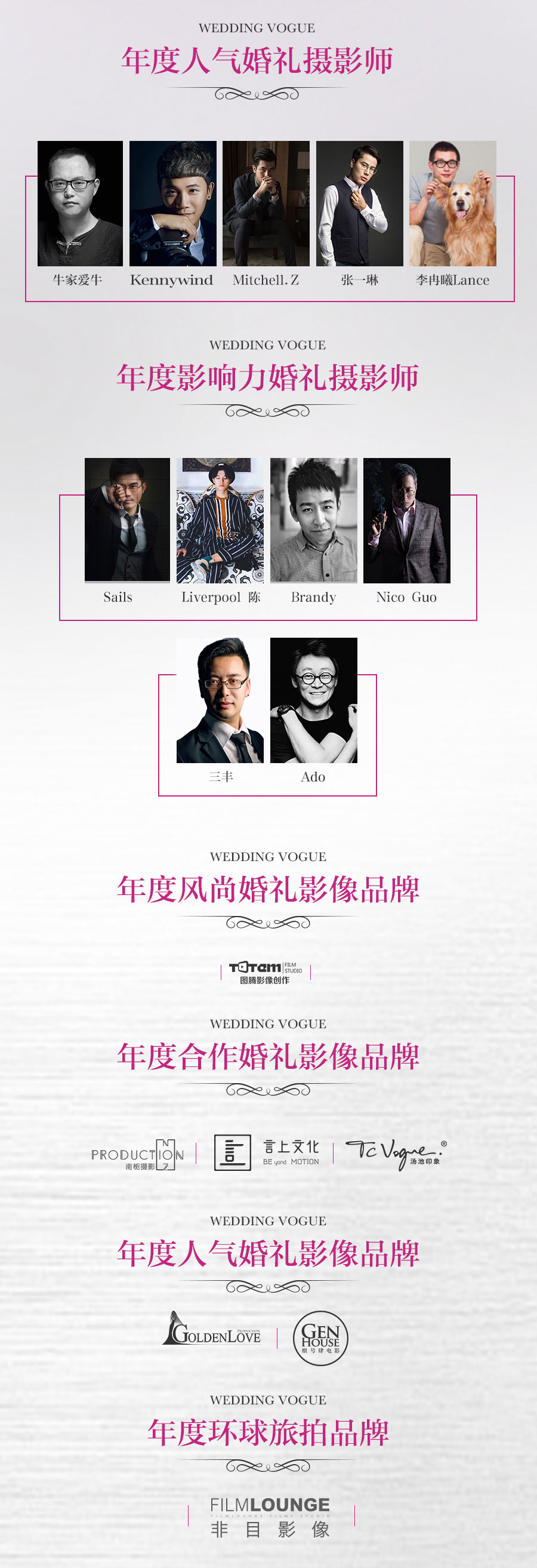 年度影响力婚礼摄影师:Sails 、Liverpool 陈 、Brandy、Nico Guo 、三丰 、Ado