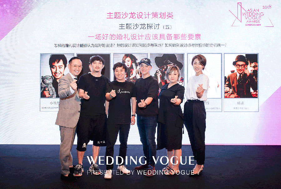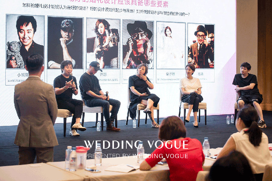 第一场邀请到设计师嘉宾有小熊戴欣、曼可瑞尔付强、独立宴会设计师徐丹、NANA主题婚礼会馆许娜、婚礼空间WeddingSpace柴子煊,以及本场主持人杨靖。