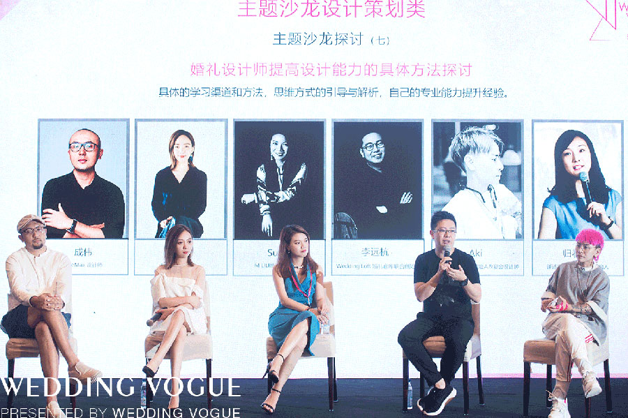 谈完优秀设计的重要元素后,那么如何才能成为优秀的设计师?怎么学习和成长,才能跟上社会发展的趋势?对于这个话题,邀请的嘉宾有成伟、大事婚礼郭珈佑、MLILI婚礼策划Susan、Wedding Loft李远杭、OP.DesignAKI,主持人归春艳。