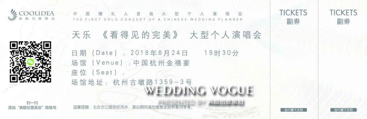 搜索公众号“婚礼风尚”,找到本篇文章转发至朋友圈,8月17日24:00前,添加典酷创意策划客服,把集赞的截图发至客服微信,集赞最多的前两名可以亲临演唱会现场感受听觉盛宴。